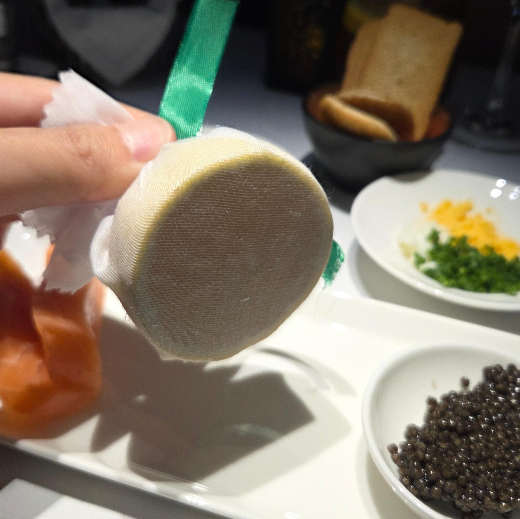 다시 메뉴로 돌아가서 음식에 대한 이야기를 하자면, 먼저 세 종류의 빵이 나왔습니다. 빵은 포카치아와 바게트, 롤이 나왔습니다. 버터와 발사믹 소스가 함께 서빙이 되었습니다. 빵은 엄청 ‘우와’는 아니어도 충분히 괜찮았고요, 다만 발사믹 소스가 신맛만 강해서 조금 아쉬웠습니다. 진짜 맛있는 발사믹 소스는 약간의 단맛도 나거든요. 다음으로는 캐비어와 훈제 연어가 나왔습니다. 카타르 항공이 2024년 8월부터 13개 노선의 비즈니스 클래스 캐빈에서도 캐비어를 제공하기 시작했는데요, 댈러스 포트워스 노선도 그중 하나였습니다. 캐비어는 크림, 다진 부추, 계란과 곁들여 먹을 수 있는 빵과 함께 제공이 되었습니다. 제가 캐비어를 많이 먹어보지는 않았지만, 알도 작지 않고 맛도 크리미 하면서도 많이 비리지 않고, 짜지 않아 괜찮은 등급의 저염 캐비어를 서빙하는 것 같았습니다. 함께 나온 연어는 헝겊에 감싼 레몬과 제공되었는데요, 이렇게 하면 레몬즙을 짤 때 레몬 씨나 과육이 떨어지지 않는 장점이 있습니다. 연어도 비리지 않고 연어의 풍미가 좋았습니다.