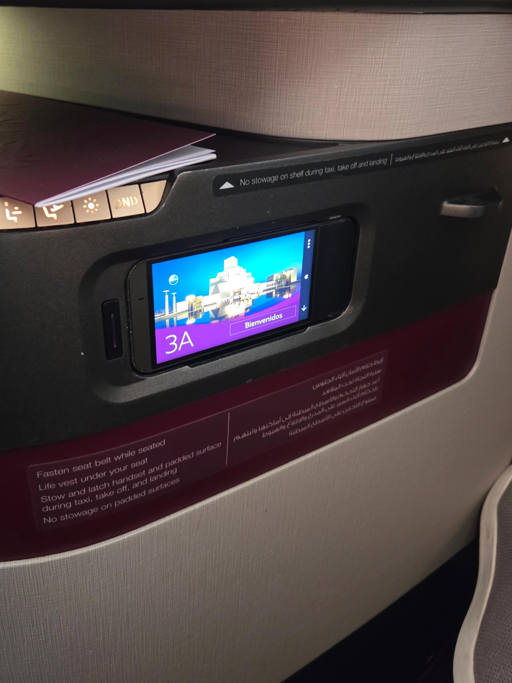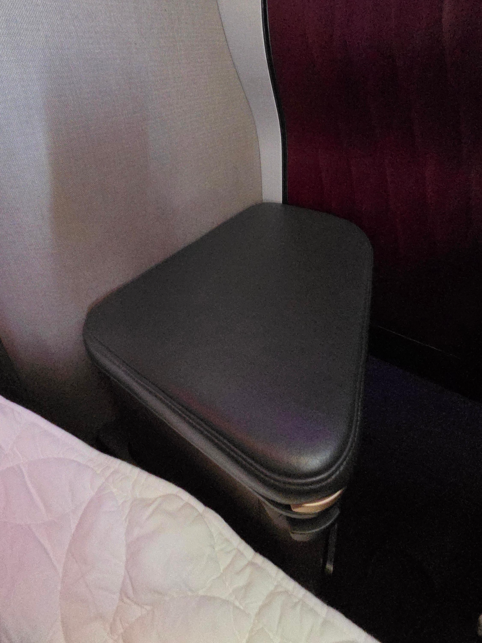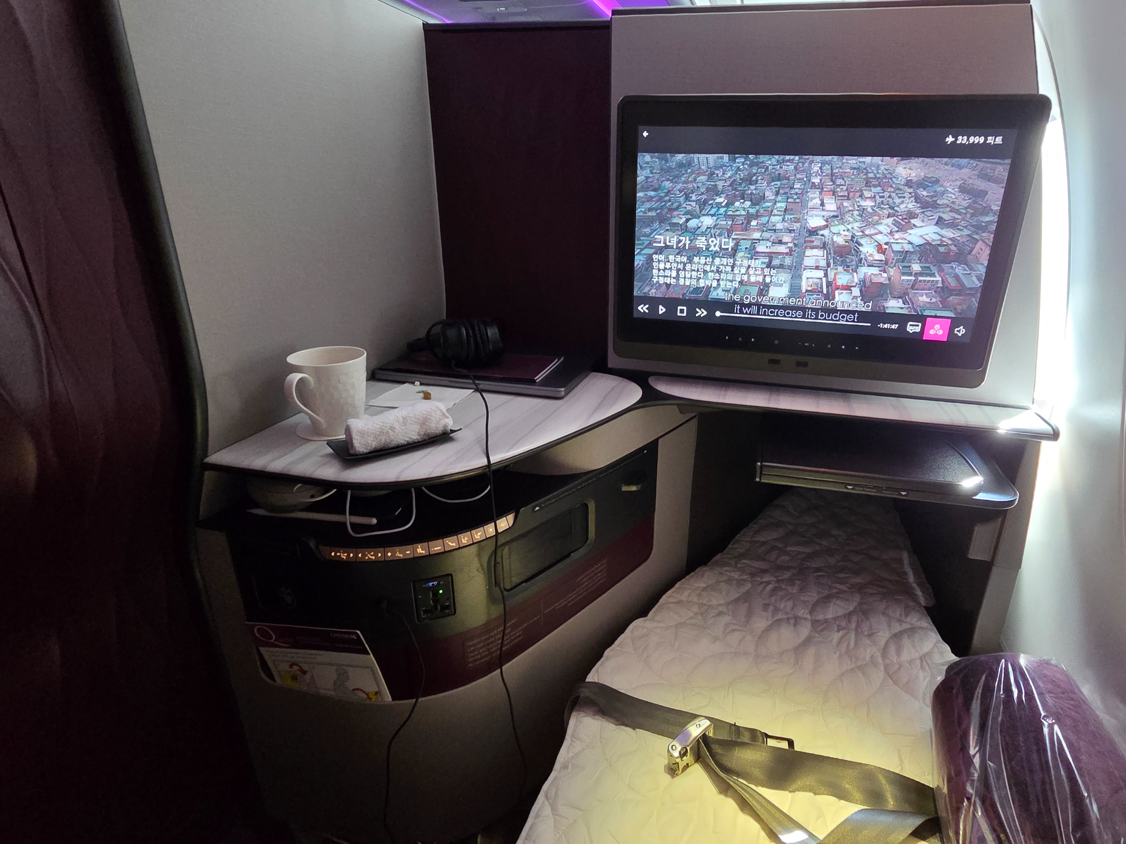 좌석의 넓이는 21.5인치로 다리 부분으로 갈수록 좁아지는 형태를 가지고 있습니다. 다만 상체 부분의 공간이 여유가 꽤 있어 실제 넓이보다 체감넓이가 더 넓은 것 같습니다. 레그룸은 리버스 헤링본 타입의 시트보다는 조금 더 넓은 편이지만, 대한항공에서 사용하는 프레스티지 슬리퍼 좌석인 APEX Suite에 비할바는 되지 못합니다. 그래도 불편할 정도는 아니고요. Q스위트의 좌석은 풀 플랫 베드로 변하는 좌석입니다. 역방향 좌석이기에 풀플랫으로 만들더라도 머리 부분이 약간 들린 포지션을 하게 되는데, 개인적으로는 머리에 피가 덜 쏠려 이 포지션을 더 선호하는 편입니다. 좌석 포지션 조절은 좌석 우측에 달린 버튼으로 쉽게 조작할 수 있습니다. 좌석 위의 오버헤드 빈에는 에어벤트가 설치되어 있습니다. 비즈니스 클래스 캐빈에어 이 에어벤트를 없애는 항공사가 많은데요, 특히 문이 닫히는 스위트 구조의 좌석의 경우 공기 순환이 잘 되지 않아 스위트 내부가 더울 수 있습니다. 이럴 때 이 에어벤트가 있는 게 좋은데요, 카타르 항공의 Q스위트의 창가 쪽 좌석에는 이 에어벤트가 있어 조금 더 쾌적하게 비행할 수 있었습니다. (물론, 더 건조해지는 느낌은 있습니다.)