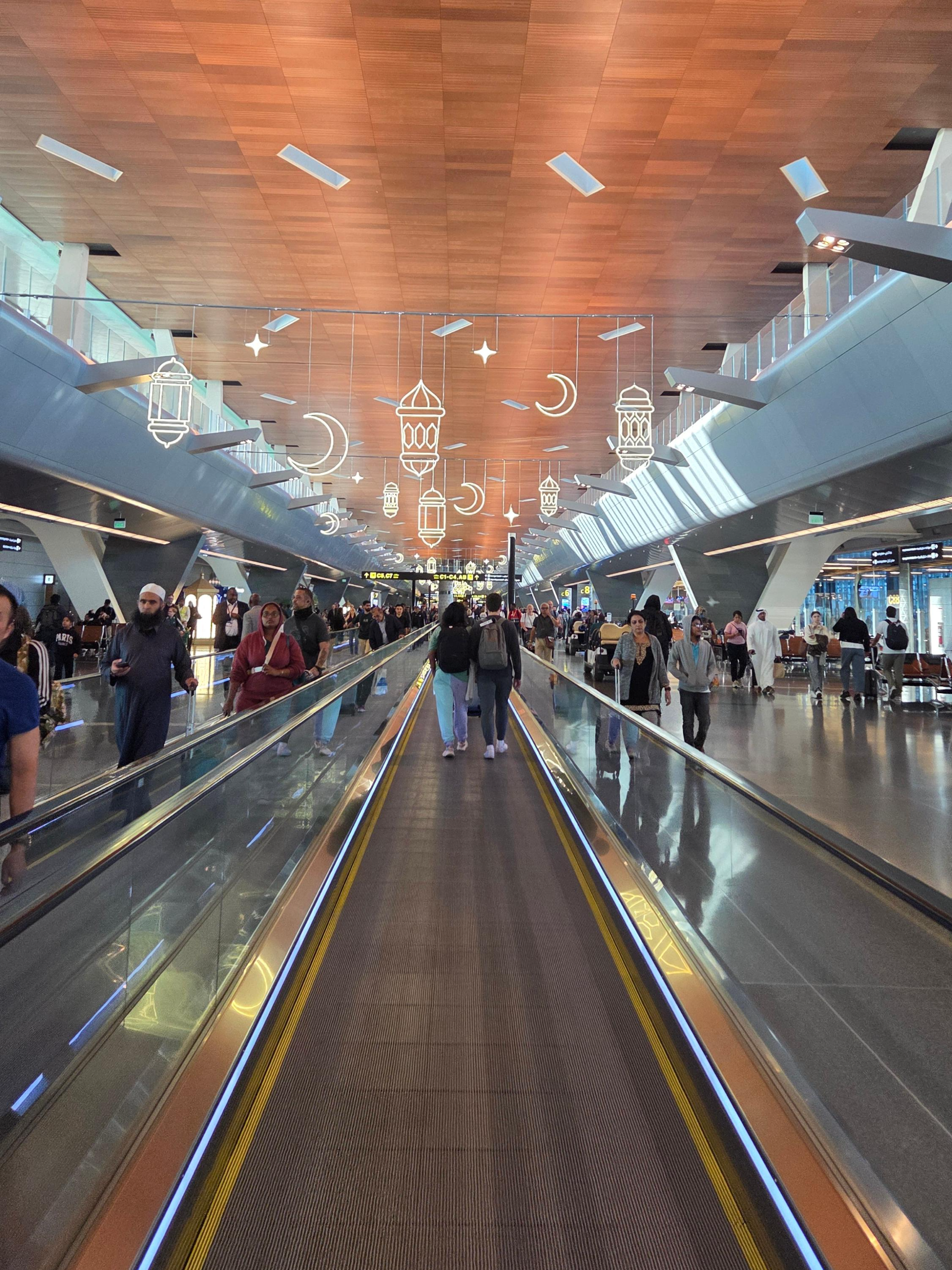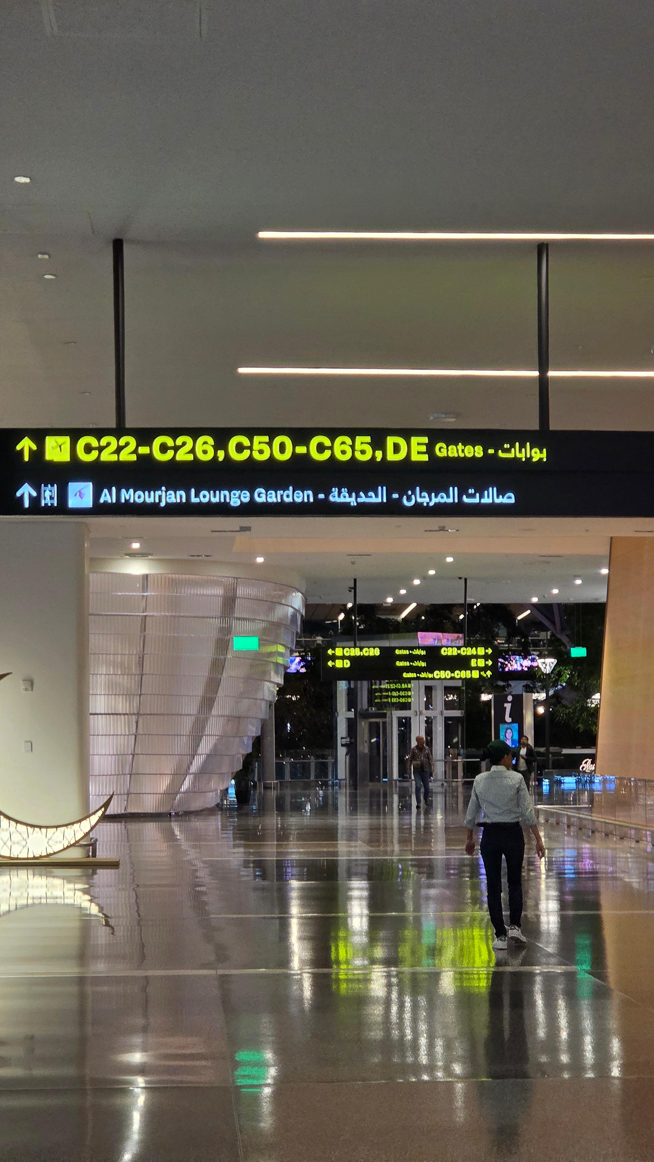 도하 하마드 국제공항 출발 안내판과 더 가든 도하 하마드 국제공항에서의 환승은 어렵지 않은 편입니다. 비행기에서 내려 한층 올라간 다음, 환승 사인을 따라서 쭉 가다 보면 환승 보안 검색대가 나옵니다. 일등석과 비즈니스 클래스 탑승객의 경우 전용 환승 보안 검색대를 이용할 수 있었는데, 저의 경우는 처음 나오는 환승대가 모든 승객이 이용할 수 있는 보안 검색대였고, 조금 더 걸어가면 나오는 보안 검색대가 프리미엄 캐빈 승객 전용 보안 검색대였습니다. 보안검색을 마치고 나면 바로 더 가든이 나오게 됩니다. 인천공항에서 체크인을 하는 경우, 보딩 패스에 탑승 게이트가 나오지 않는 경우도 있으니 반드시 탑승 게이트를 확인하신 후 더 가든으로 가시는 걸 추천드립니다.