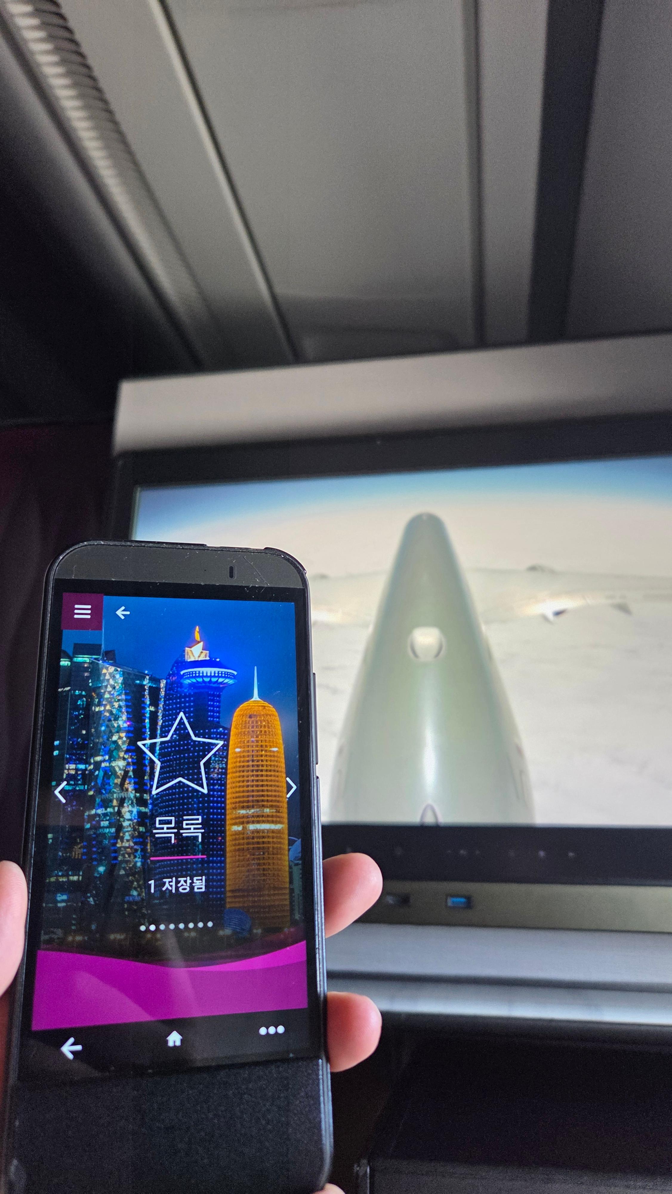 카타르 항공 A350-1000 비즈니스 클래스 Q스위트 기내 엔터테인먼트 시스템 Oryx One 편리했던 기능으로는 기내 엔터테인먼트 시스템과 탑승객의 스마트폰을 연결해서 리모컨처럼 사용하는 Oryx One이라는 기능이었습니다. 처음에는 '굳이 이런 기능을?'이라는 생각이었는데, 사용하다보니 오히려 모니터 리모컨보다 더 자주 사용하게 되었습니다. 딜레이도 별로 없고 빠릿빠릿해서 리모컨보다 나은 부분도 있었습니다.