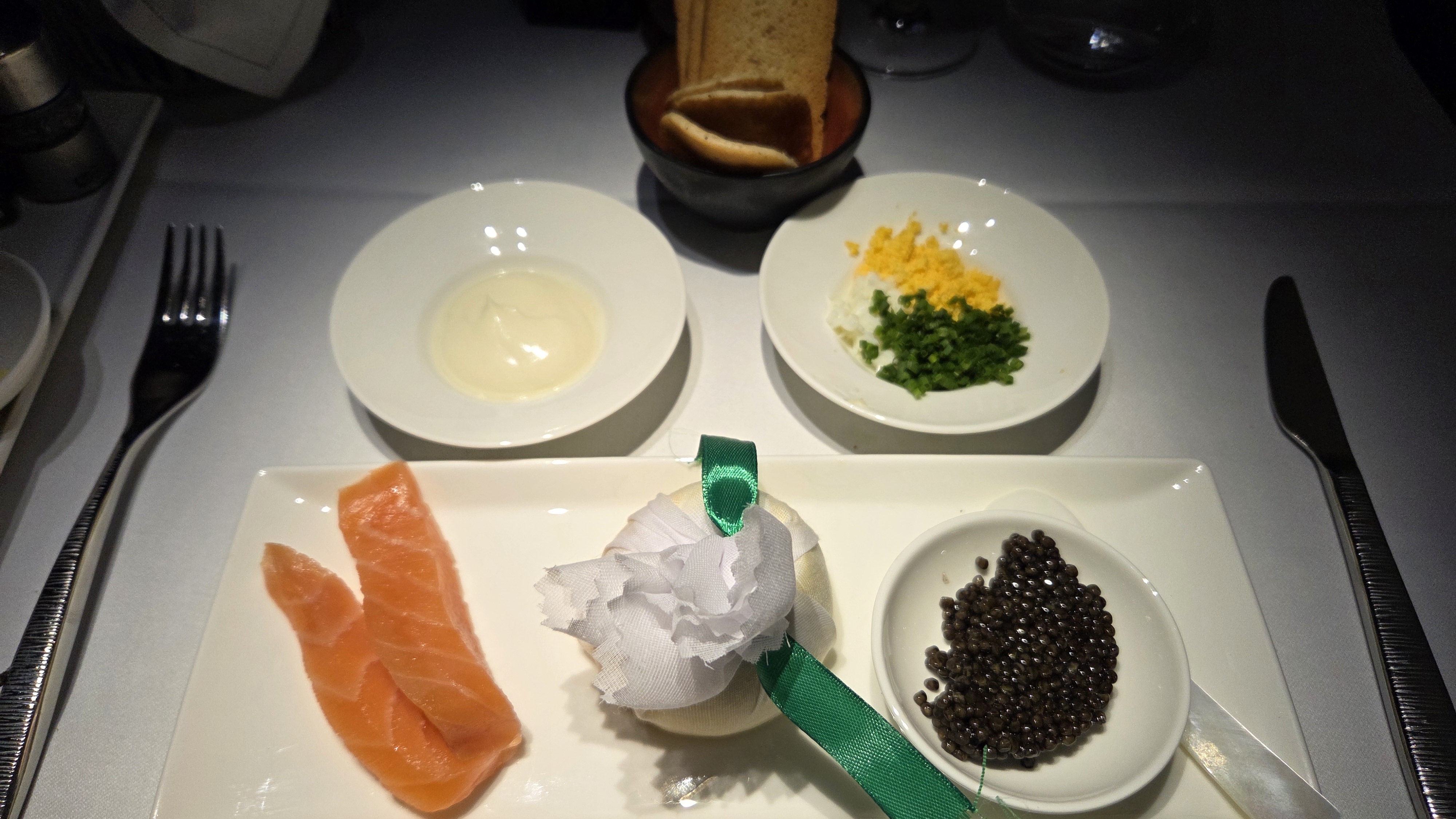 카타르 항공 장거리 비즈니스 클래스 에피타이저 캐비어와 연어