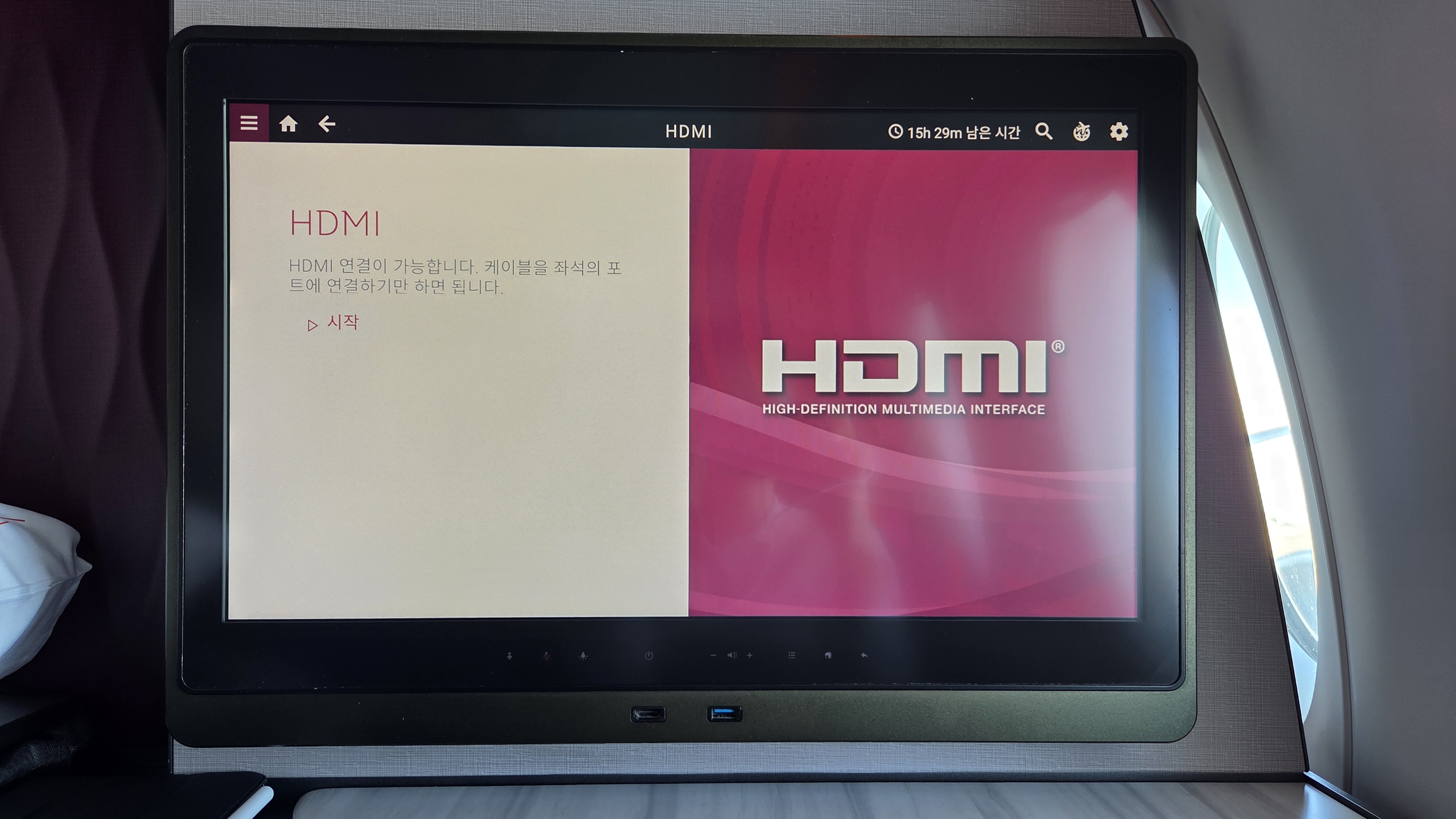 카타르 항공 A350-1000 비즈니스 클래스 Q스위트 HDMI연결을 지원하는 기내 엔터테인먼트 시스템 카타르 항공의 Q스위트가 장착되어 있는 A350의 경우 21.5인치 크기의 풀 HD 해상도의 모니터가 탑재되어 있습니다. 최근에 새로 발표되는 비즈니스 클래스 좌석의 경우 4K 해상도까지 지원하는 경우가 많은데 카타르 항공의 Q스위트는 2010년대 후반부터 도입된 비즈니스 클래스 좌석이기에 Full HD 해상도의 스크린이 탑재되어 있습니다. 하지만 이 점이 크게 불편함으로 다가온다거나 하지는 않았고, 엔터테인먼트를 즐기기에 충분한 정도였고, 반응 속도도 빠릿빠릿해서 이용하는데 불편함은 없었습니다.