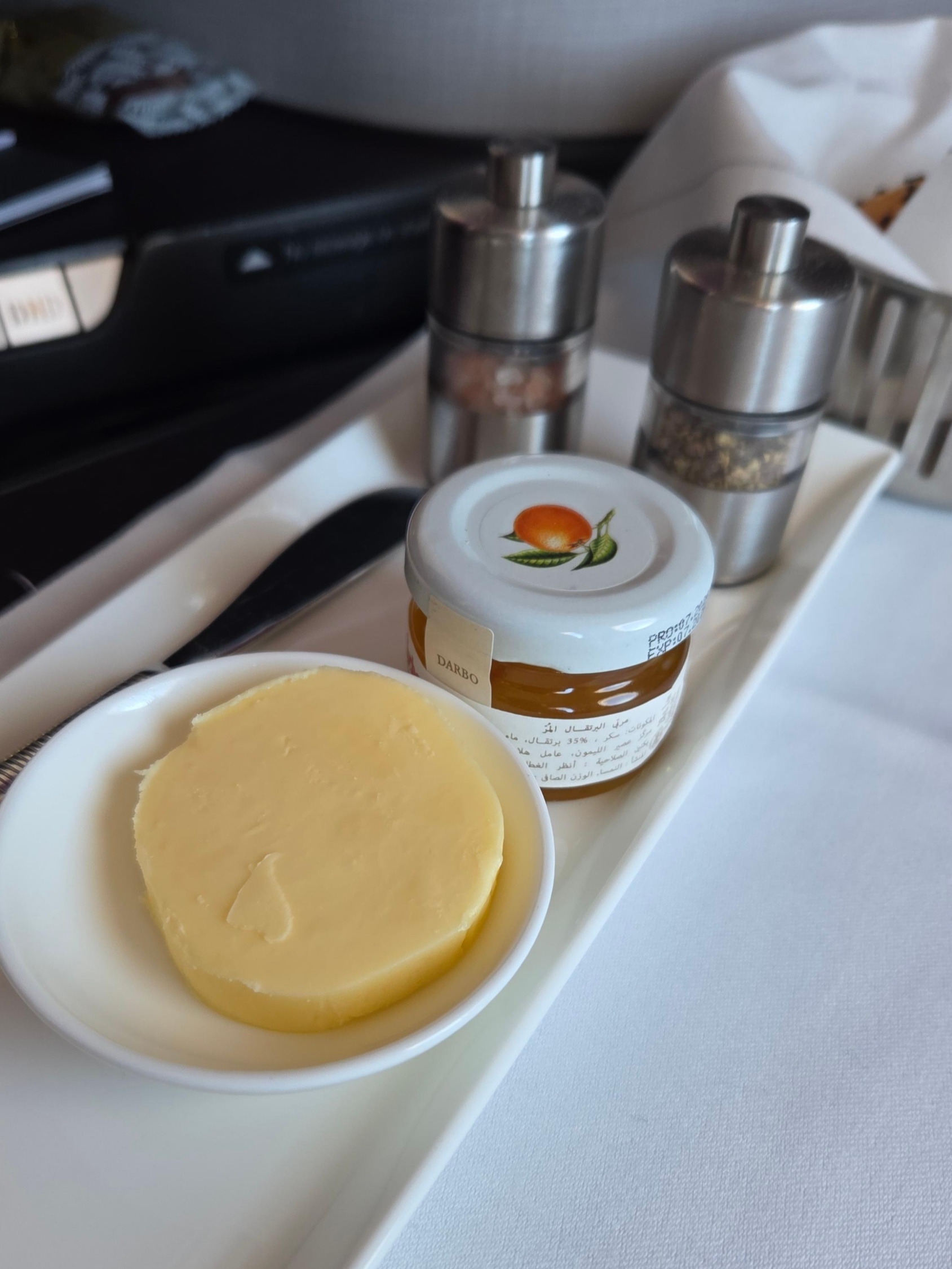 카타르 항공 장거리 비즈니스 클래스 기내식 빵과 버터, 오렌지 마멀레이드