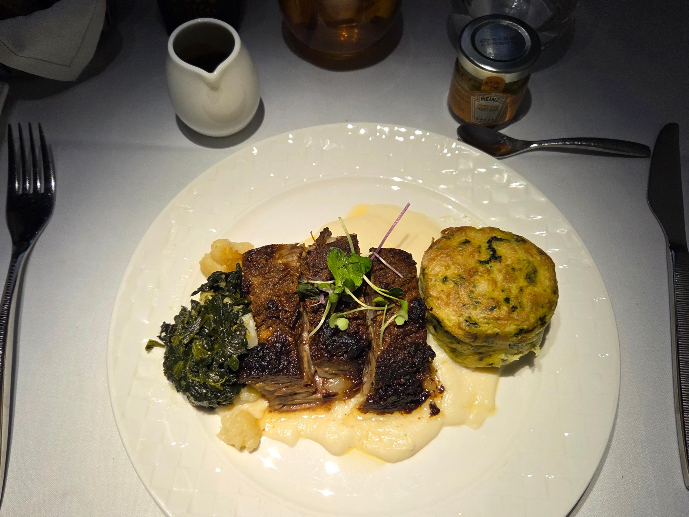 메인 메뉴는 갈비찜을 시켰습니다. 갈비찜은 컬리플라워 퓌레, 볶은 시금치, 프리타타가 같이 제공되었습니다. 갈비찜은 소스가 별도로 제공되었고요, 좋은 등급의 고기를 사용했는지 지방이 많고 조리가 충분히 되어 포크로도 자를 정도로 부드러웠습니다. 다만, 약간의 느끼함도 있어 저는 머스터드를 따로 요청해서 같이 먹으니 훨씬 맛있었습니다. 컬리플라워 퓌레는 컬리 플라워의 독특한 향이 강하지 않았고 식감은 매쉬드와 비슷해서 함께 먹기 나쁘지 않았고, 볶은 시금치는 식감이 잘 살아있어 부드러운 고기에 식감을 더하기에 좋았고 프리타타는 평범한 맛이었습니다.