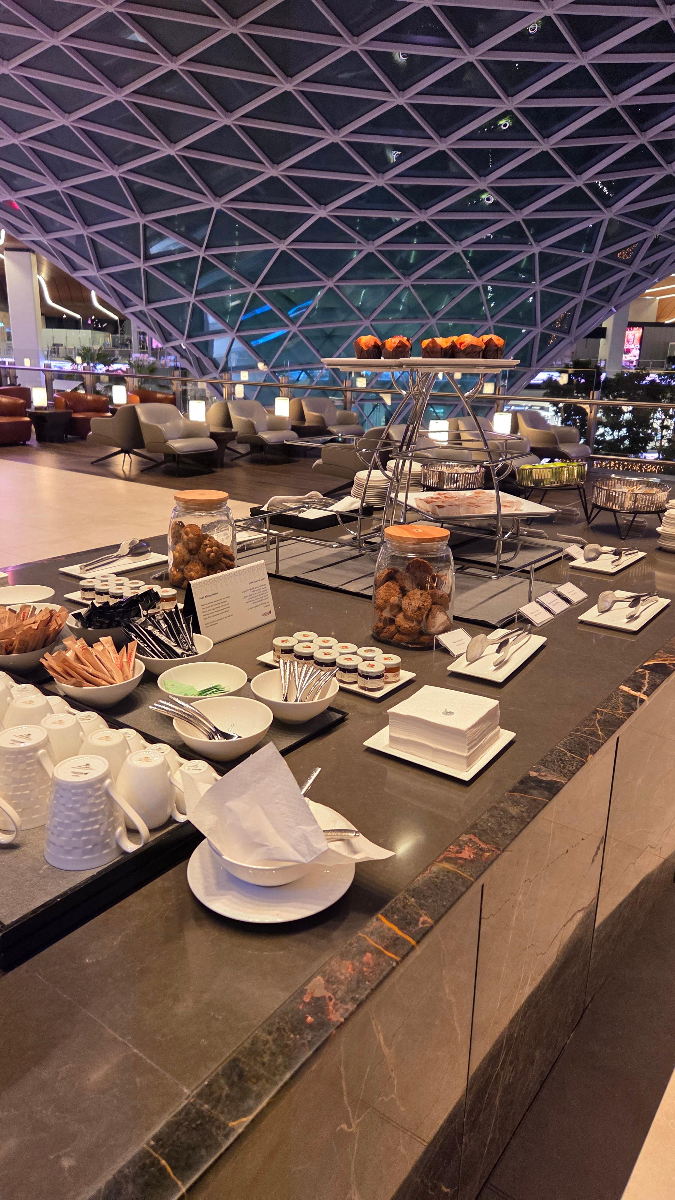 도하 하마드 국제공항 알 무르잔 비즈니스 라운지 더 가든 내부와 간단한 다과