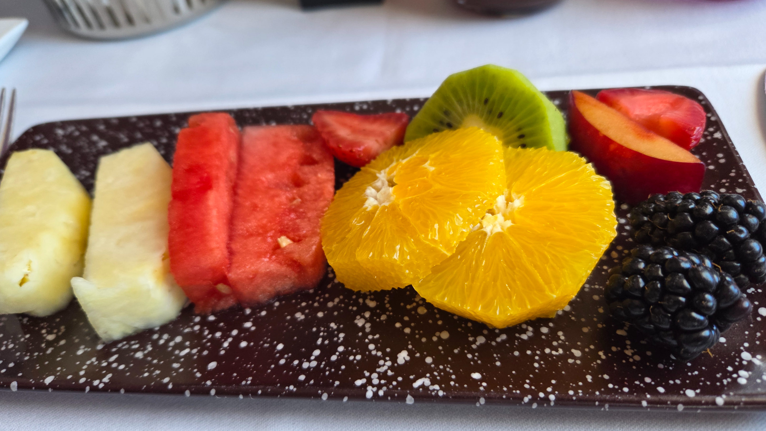 카타르 항공 장거리 비즈니스 클래스 스타터 그레놀라 요거트와 과일 스타터로는 그릭 요거트/시즌 과일/시리얼/햄 플레이트가 있었습니다. 저는 그릭 요거트와 시즌 과일을 먹었는데, 그릭 요거트에는 그레놀라와 절임 매실이 담겨 있어서 달지 않은 그릭요거트에 식감과 단맛을 더해주었습니다. 다만, 시즌 과일의 경우 대부분의 과일이 거의 익지 않은 것처럼 너무 아삭하고 단맛이 부족한 점이 아쉬웠습니다. 과일은 수박, 파인애플, 자두, 오렌지, 수박, 키위, 딸기가 나왔는데, 특히 키위와 파인애플이 거의 익지 않은 정도로 서걱거리고 단맛 없이 새콤한 맛만 있었습니다.