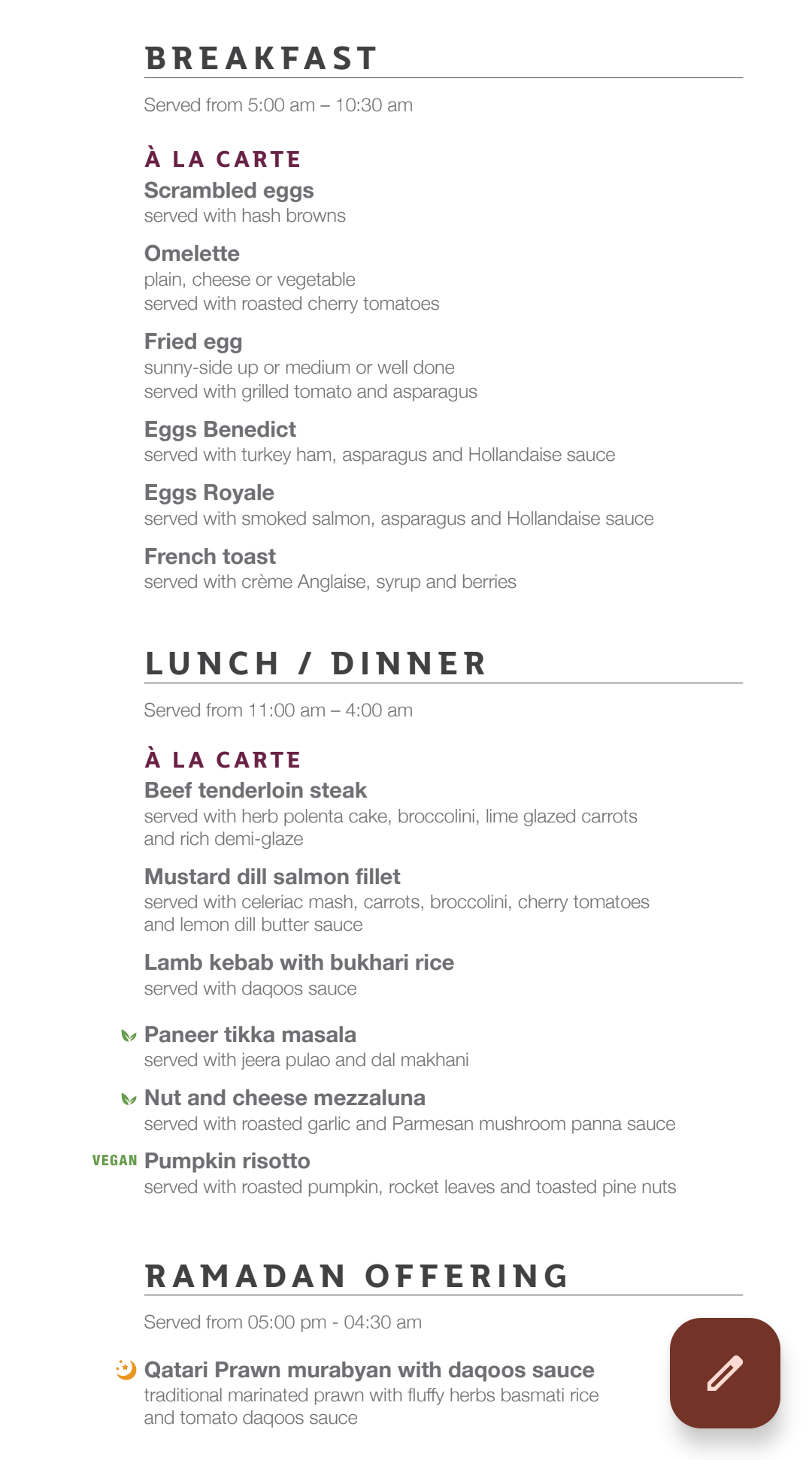 도하 하마드 국제공항 알 무르잔 비즈니스 라운지 더 가든 식사 메뉴