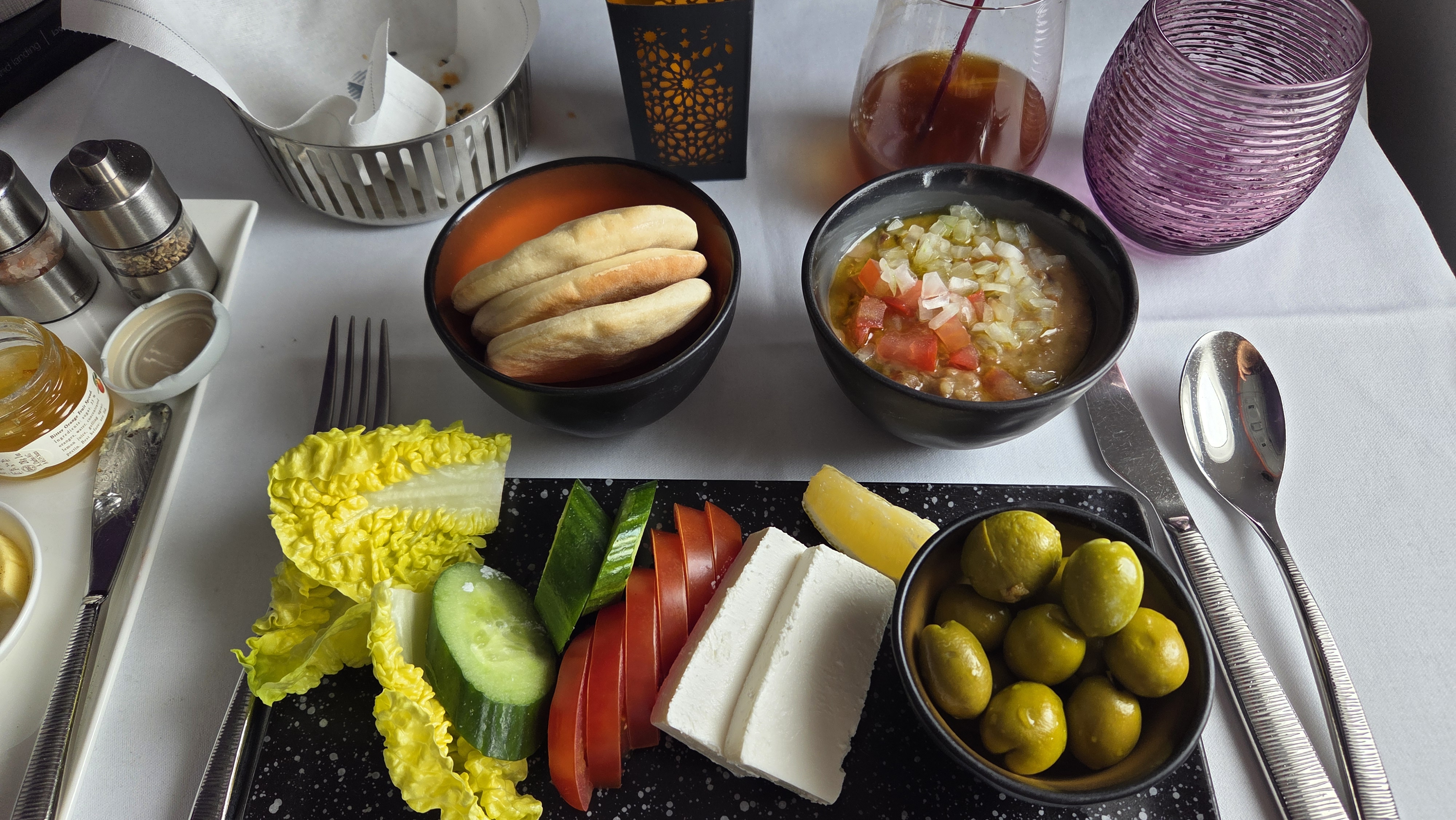 카타르 항공 장거리 비즈니스 클래스 기내식 아침식사 메인 중동식 아침식사 메인으로는 피타를 곁들인 아랍식 전통 식사를 골랐고 파울 메다매와 페타 치즈, 오이, 토마토, 올리브가 피타 빵과 함께 나왔습니다. 개인적으로 이런 식사는 먹어본 적이 없었는데 생각보다 부대끼지 않고 산뜻한 식사라 나쁘지 않았습니다. 특히 파울 메다메는 콩으로 만든 소스와 같은 느낌인데, 미국에서 자주 먹는 병아리콩으로 만든 후무스와는 또 다른 느낌으로 치폴레에서 먹는 핀토 빈의 업그레이드 버전 같은 느낌이었습니다. 빵으로는 참깨 바게트를 골랐고, 바게트의 느낌이 나지는 않았지만 참깨가 빵에 고소한 풍미를 더해주어 버터와 곁들여 먹기 좋았습니다.