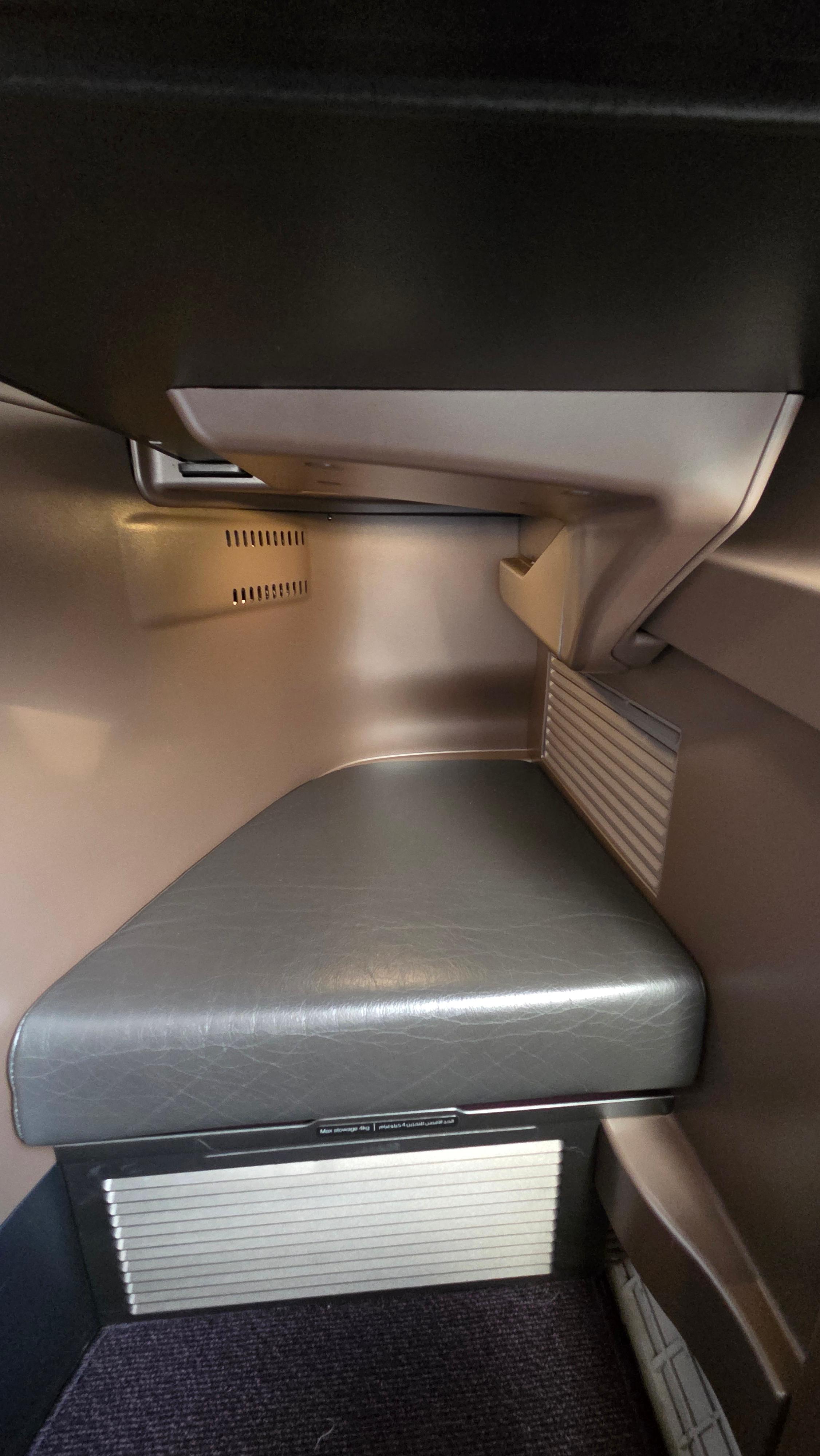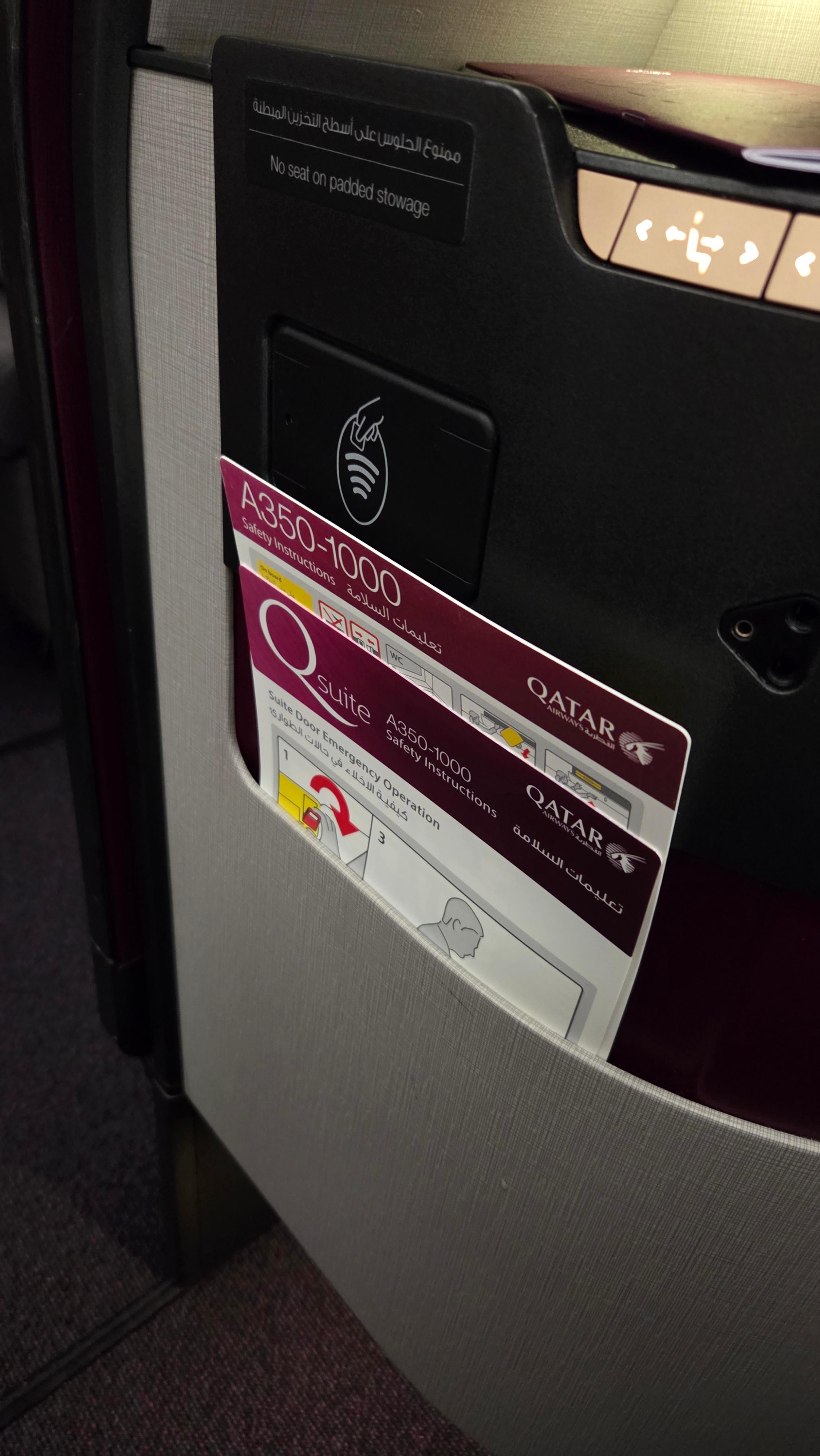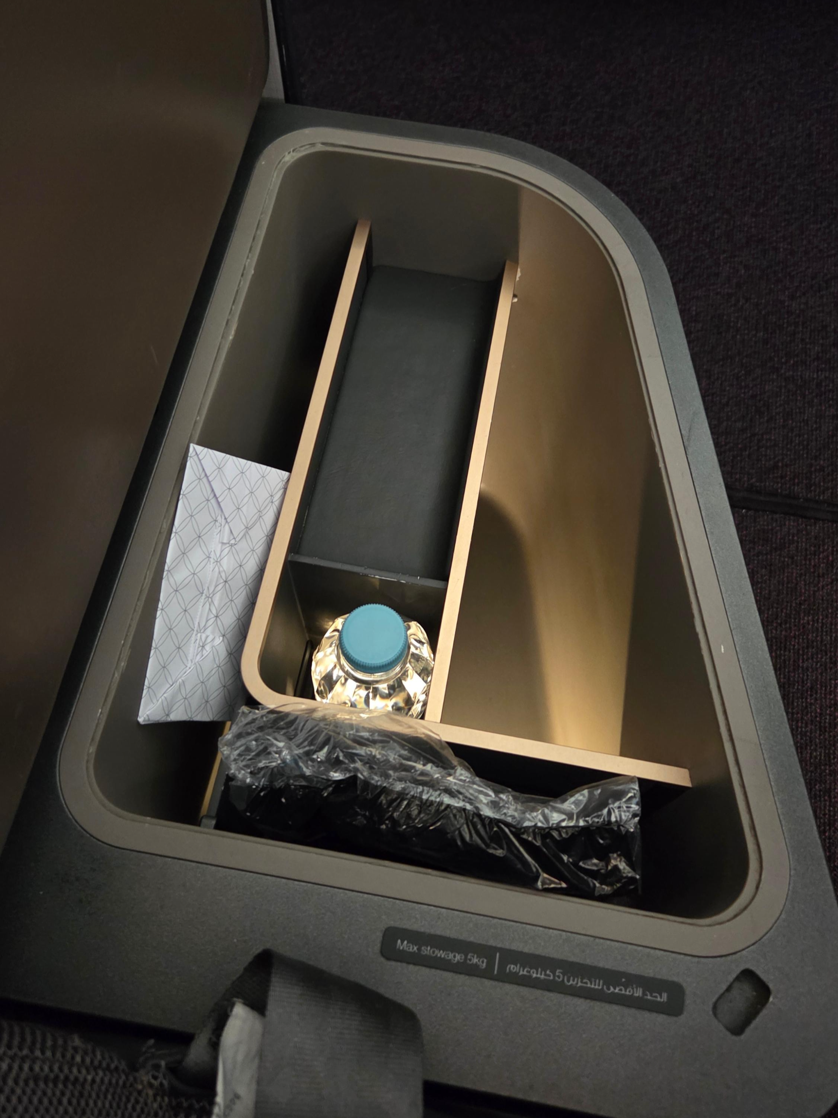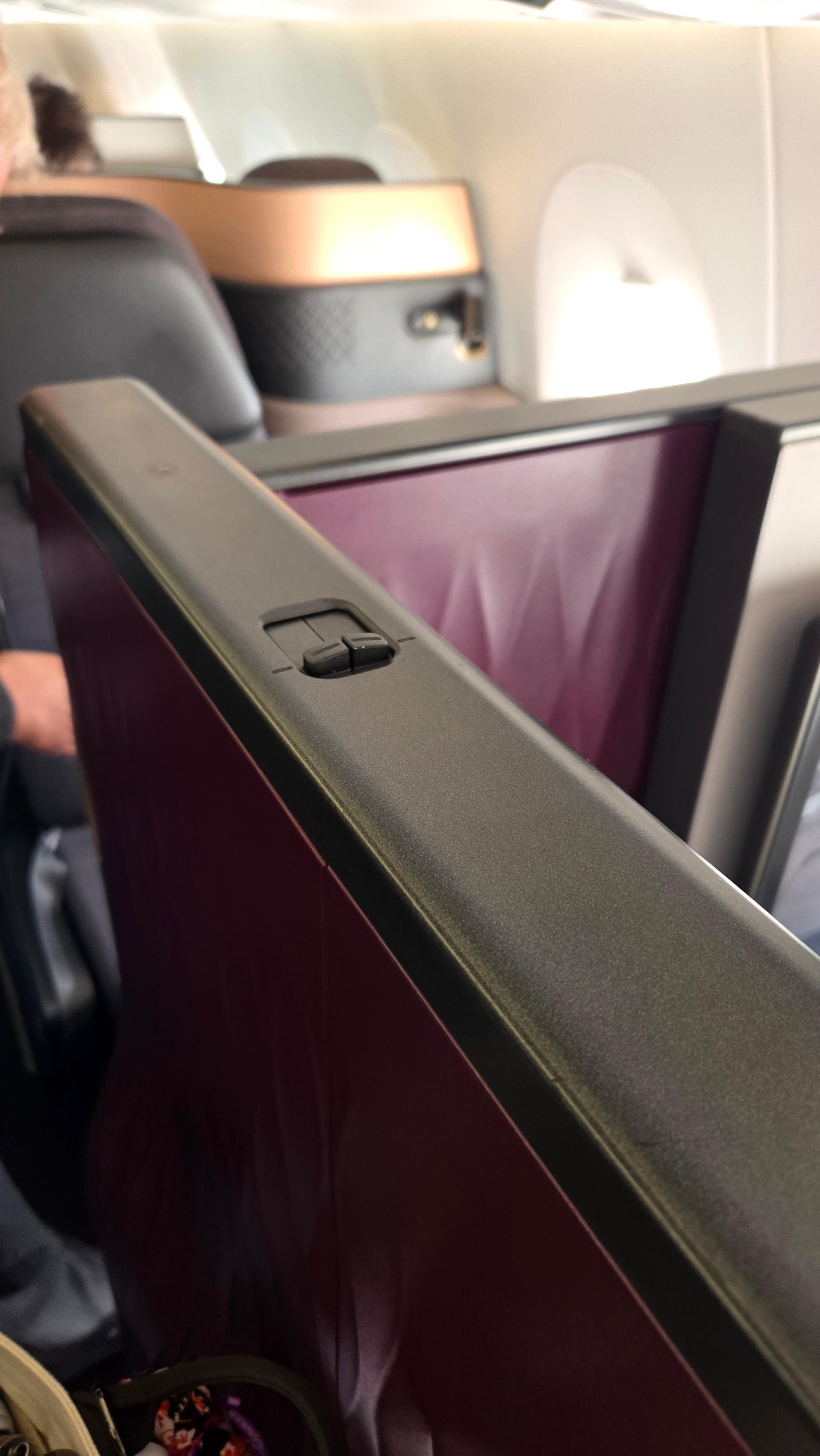 제가 앉은 3A좌석은 진행방향 기준 좌측에 위치해 있는 진짜 창가 좌석입니다. Q스위트 좌석도 2개의 창문을 점유하고 있습니다. 좌석은 카타르 항공의 시그니처 컬러인 버건디와 밝은 회색의 파티션에 짙은 회색의 시트를 배치해 중후하면서도 차분한 분위기를 제공합니다. 좌석 우측으로는 신발을 수납할 수 있는 수납공간이 있고, 이 공간에 헤드폰과 물병도 보관되어 있어서 개인 짐을 보관하기엔 부족한 공간입니다. 사실 Q스위트에는 덮개가 있는 수납공간이 많은 편은 아닌데요, 그럼에도 좌석 자체의 여유 공간이 충분하기에 그 점이 큰 단점으로 다가오지는 않습니다. 창문의 덮개의 경우 직전에 탑승했던 A350-900의 경우 버튼식으로 작동했는데 A350-1000은 수동으로 내리는 방식이었습니다. 개인적으로 수동방식이 조금 더 편리하다고 생각합니다.