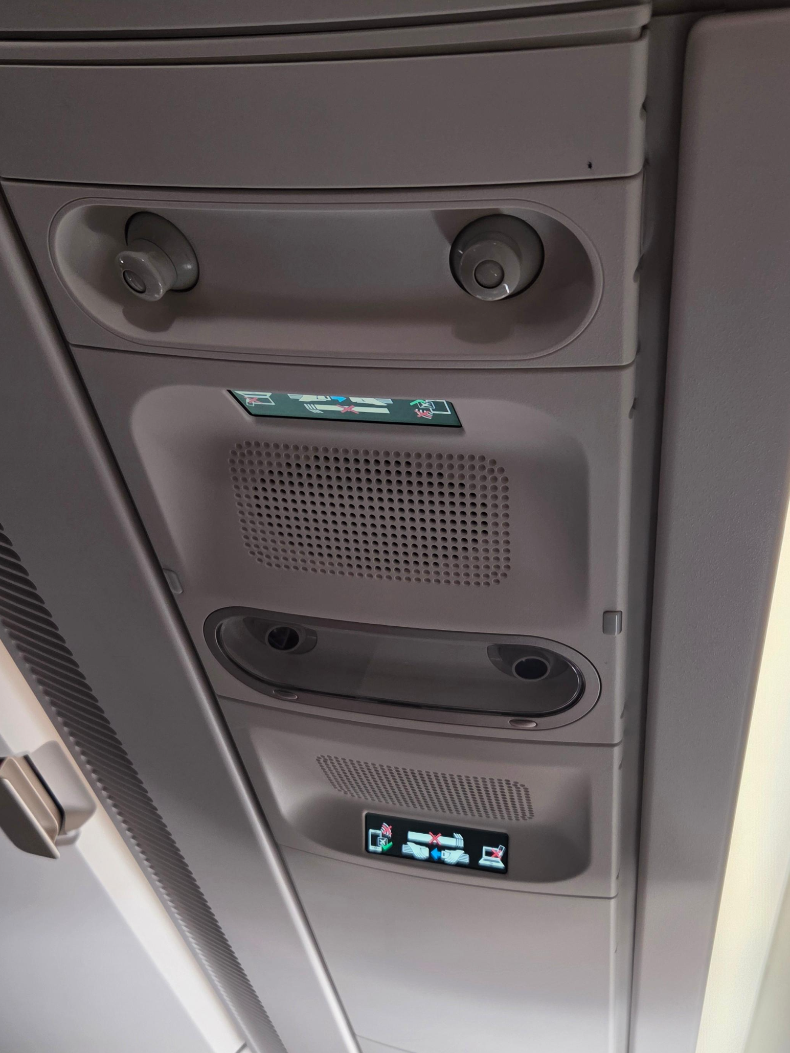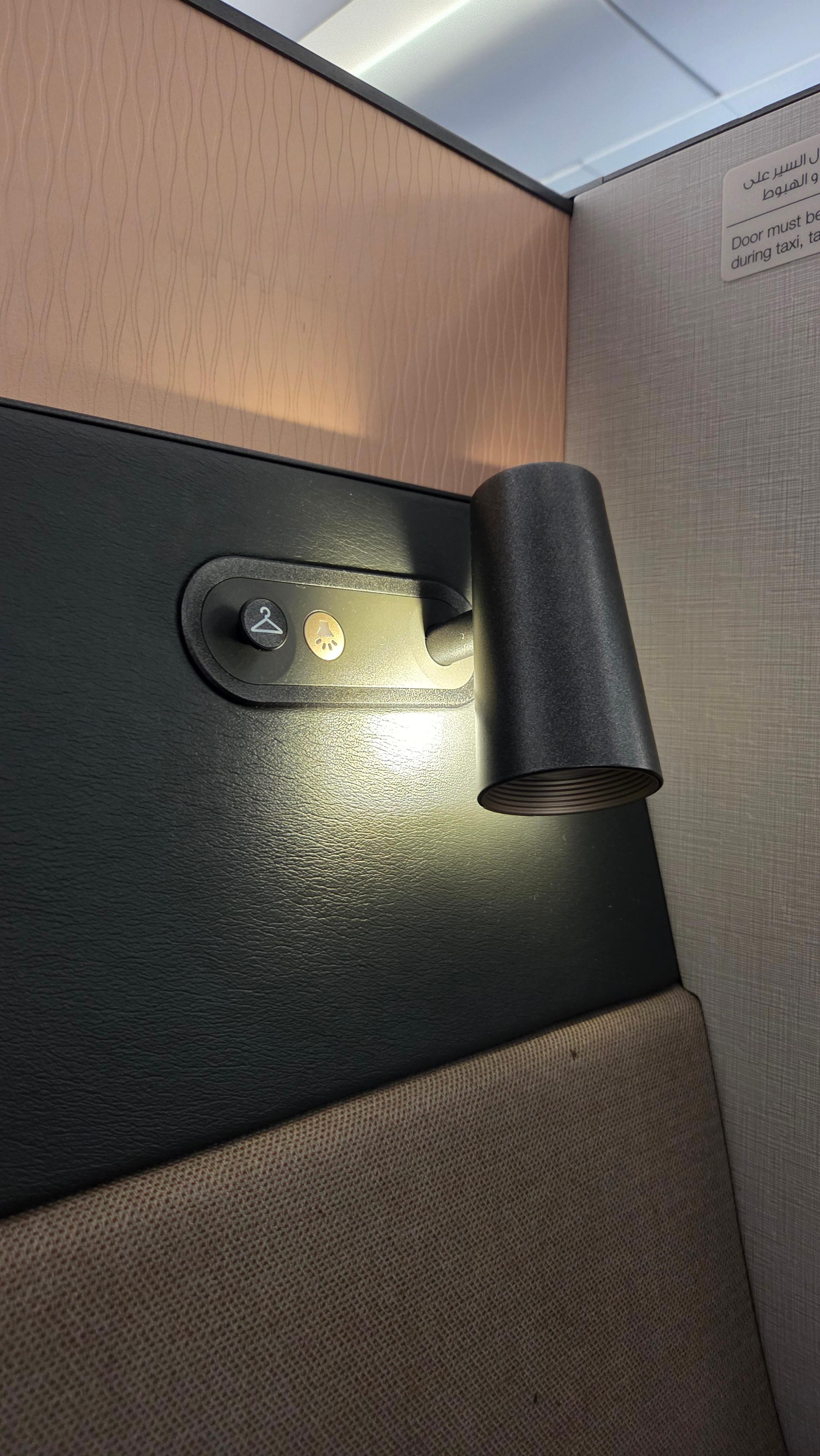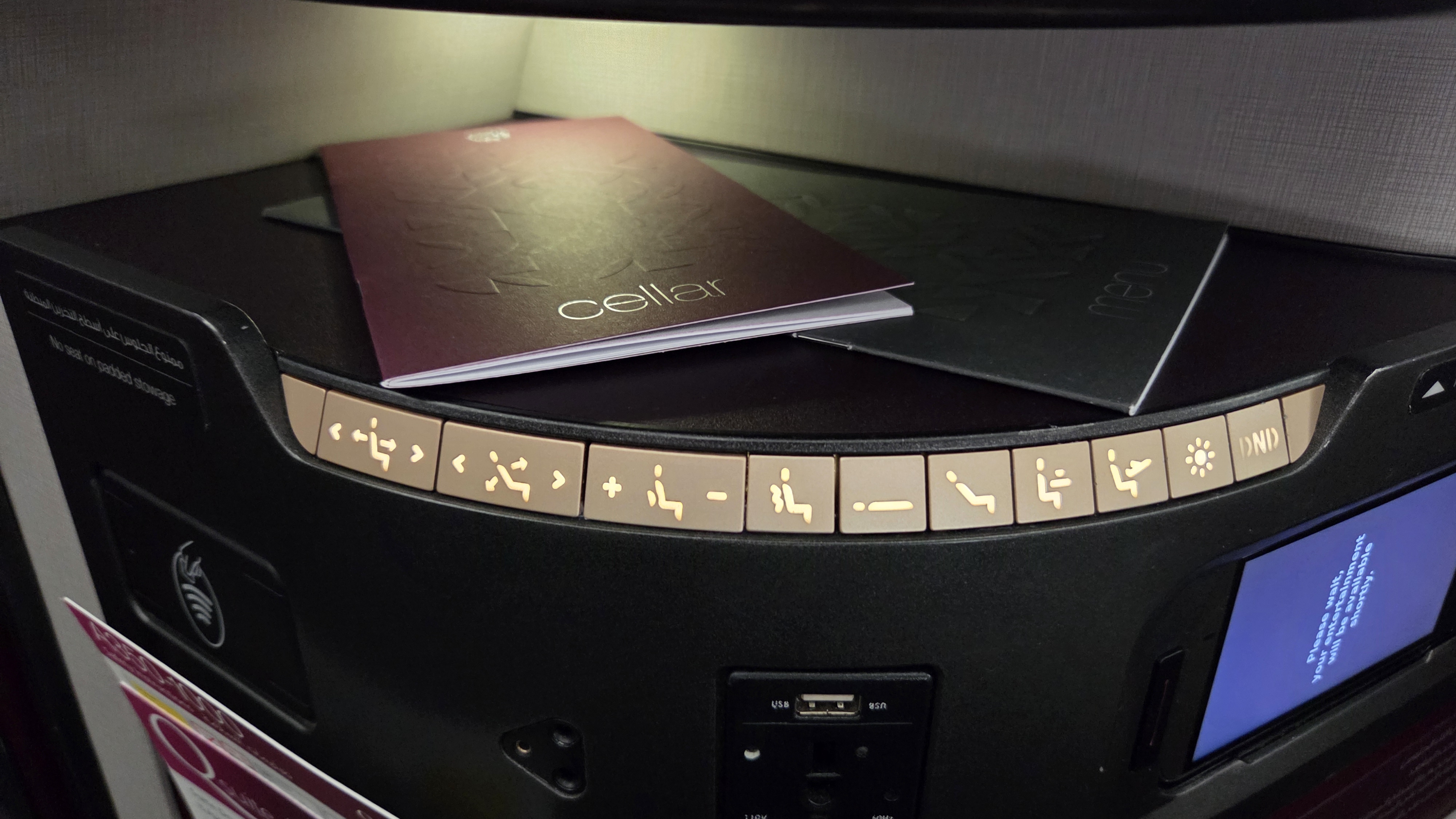 좌석의 넓이는 21.5인치로 다리 부분으로 갈수록 좁아지는 형태를 가지고 있습니다. 다만 상체 부분의 공간이 여유가 꽤 있어 실제 넓이보다 체감넓이가 더 넓은 것 같습니다. 레그룸은 리버스 헤링본 타입의 시트보다는 조금 더 넓은 편이지만, 대한항공에서 사용하는 프레스티지 슬리퍼 좌석인 APEX Suite에 비할바는 되지 못합니다. 그래도 불편할 정도는 아니고요. Q스위트의 좌석은 풀 플랫 베드로 변하는 좌석입니다. 역방향 좌석이기에 풀플랫으로 만들더라도 머리 부분이 약간 들린 포지션을 하게 되는데, 개인적으로는 머리에 피가 덜 쏠려 이 포지션을 더 선호하는 편입니다. 좌석 포지션 조절은 좌석 우측에 달린 버튼으로 쉽게 조작할 수 있습니다. 좌석 위의 오버헤드 빈에는 에어벤트가 설치되어 있습니다. 비즈니스 클래스 캐빈에어 이 에어벤트를 없애는 항공사가 많은데요, 특히 문이 닫히는 스위트 구조의 좌석의 경우 공기 순환이 잘 되지 않아 스위트 내부가 더울 수 있습니다. 이럴 때 이 에어벤트가 있는 게 좋은데요, 카타르 항공의 Q스위트의 창가 쪽 좌석에는 이 에어벤트가 있어 조금 더 쾌적하게 비행할 수 있었습니다. (물론, 더 건조해지는 느낌은 있습니다.)