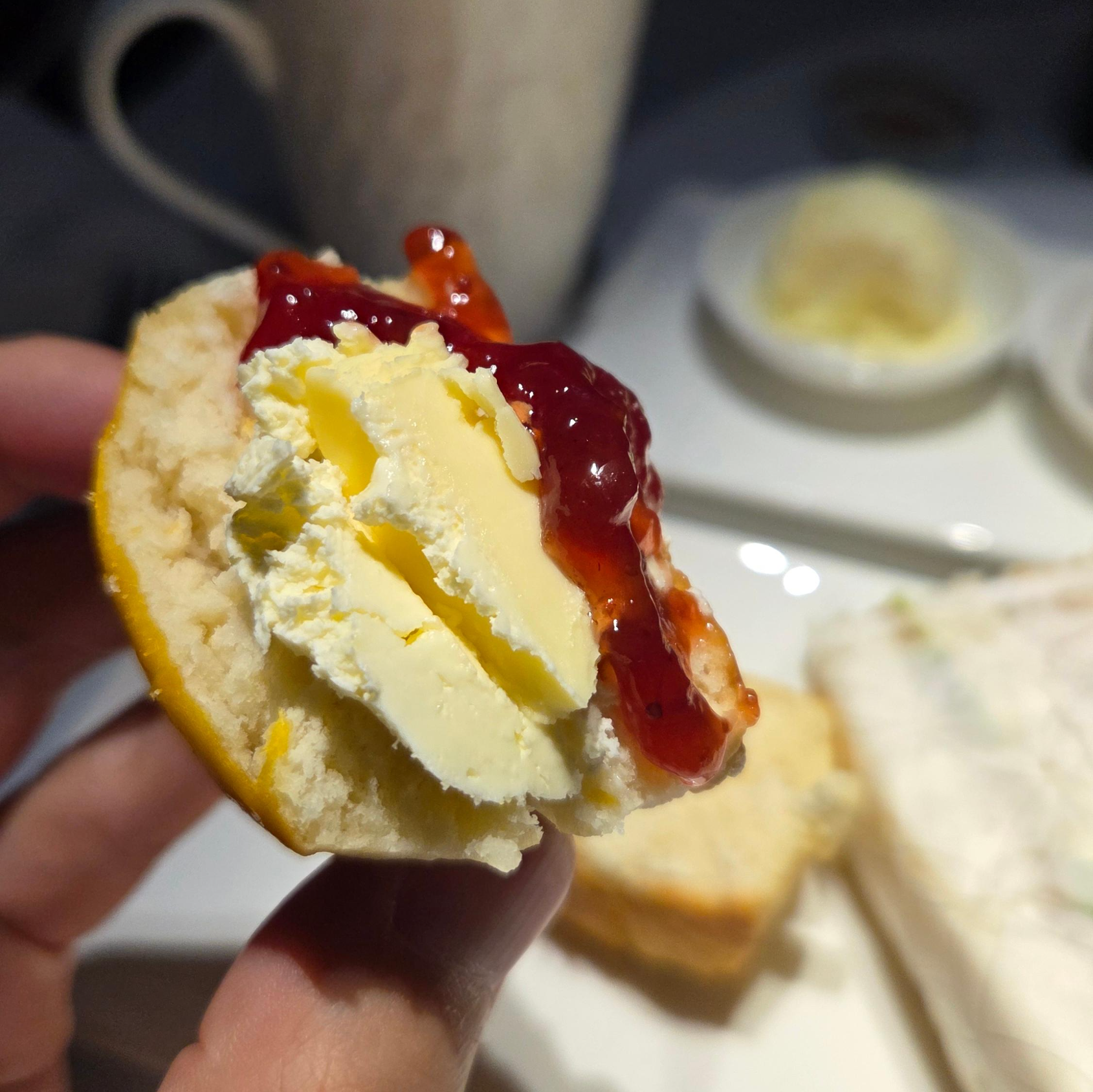 카타르 항공 장거리 비즈니스 클래스 간식 에프터눈 티 스콘, 초콜릿 무스 빵, 샌드위치 에프터눈티의 경우 으리으리한 트레이에 나오지는 않았지만, 스콘과 스위트한 빵과 짭짤한 샌드위치가 함께 나왔습니다. 비행기에서 먹는 스콘 치고는 버터와 휘핑크림, 잼과 곁들여 먹기에 스콘은 아주 맛있었고, 오렌지 무스가 올라간 빵과 초콜릿 바이트도 좋았습니다. 샌드위치의 경우 안에 연어, 토마토, 치즈, 야채 등이 골고루 과하지 않게 들어가 있었습니다. 비행 중 향긋한 티와 곁들이기 너무 좋은 에프터눈티였습니다.
