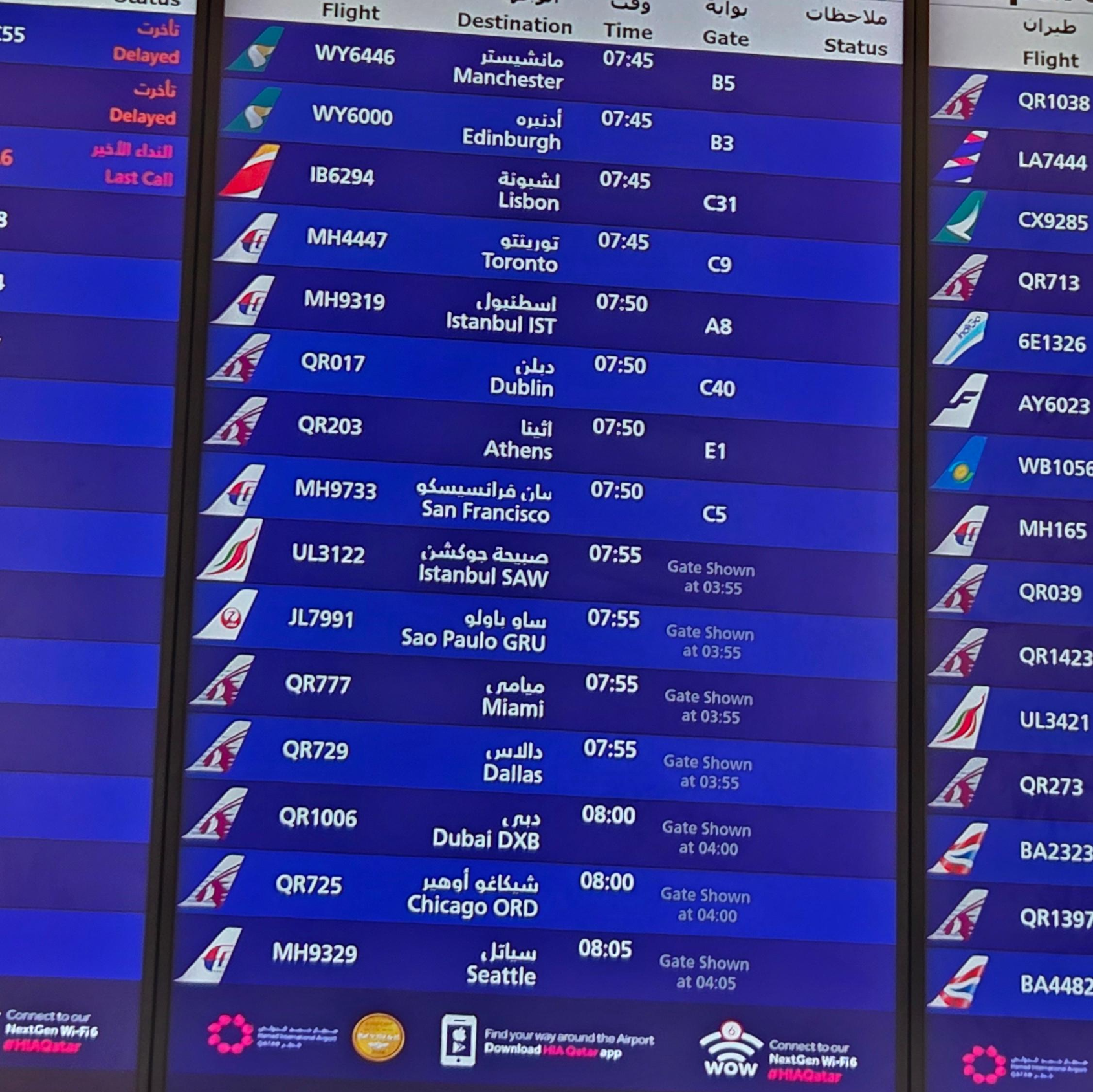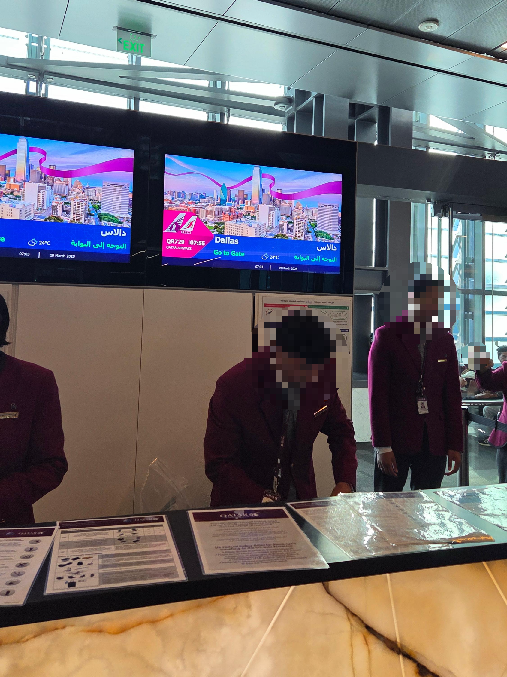 - 노선: DOH(카타르 도하 하마드 국제공항) → DFW(미국 댈러스 포트워스 국제공항), QR 729, 07:55 → 16:10, Duration 16h 15m