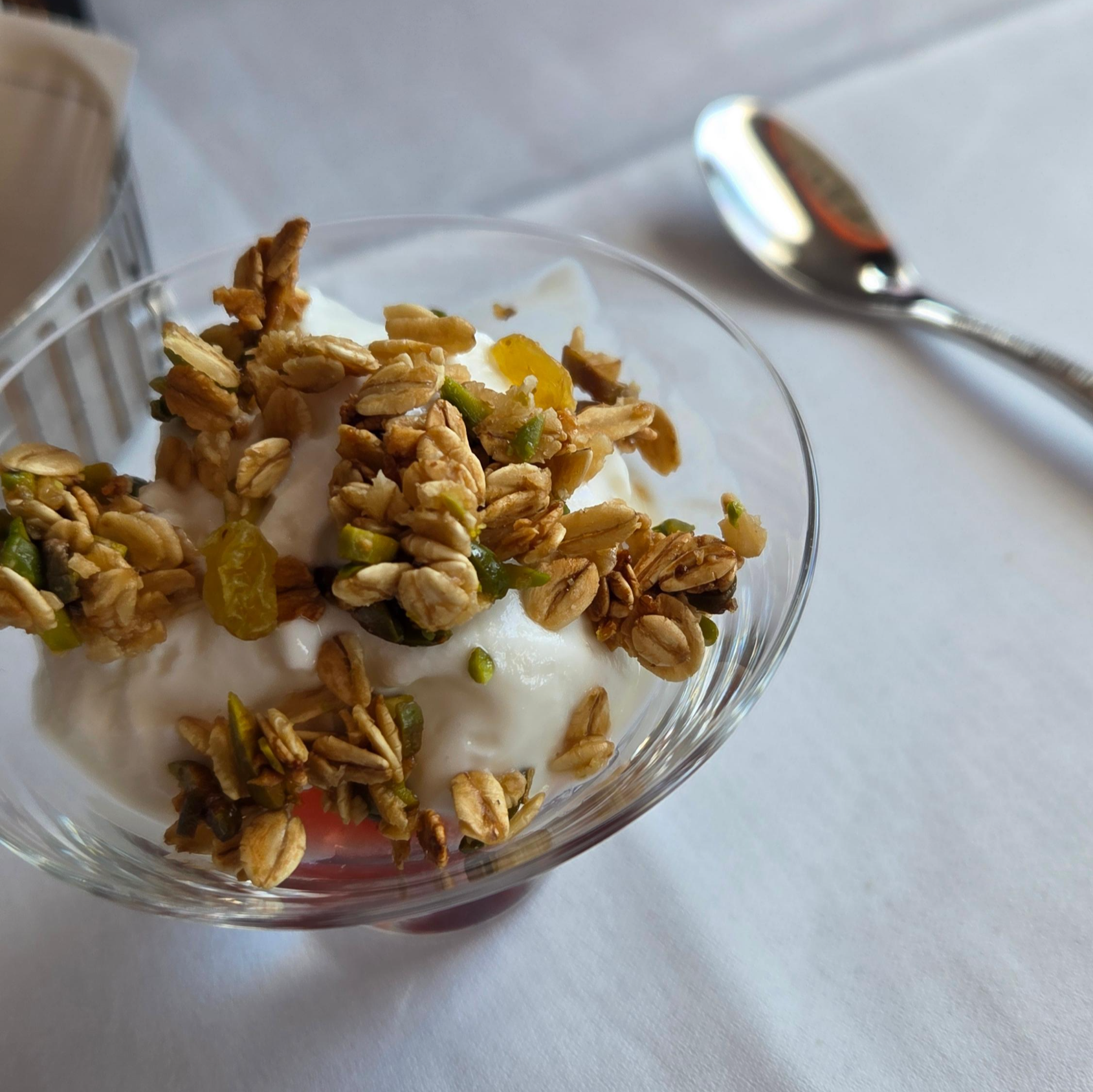 카타르 항공 장거리 비즈니스 클래스 스타터 그레놀라 요거트와 과일 스타터로는 그릭 요거트/시즌 과일/시리얼/햄 플레이트가 있었습니다. 저는 그릭 요거트와 시즌 과일을 먹었는데, 그릭 요거트에는 그레놀라와 절임 매실이 담겨 있어서 달지 않은 그릭요거트에 식감과 단맛을 더해주었습니다. 다만, 시즌 과일의 경우 대부분의 과일이 거의 익지 않은 것처럼 너무 아삭하고 단맛이 부족한 점이 아쉬웠습니다. 과일은 수박, 파인애플, 자두, 오렌지, 수박, 키위, 딸기가 나왔는데, 특히 키위와 파인애플이 거의 익지 않은 정도로 서걱거리고 단맛 없이 새콤한 맛만 있었습니다.