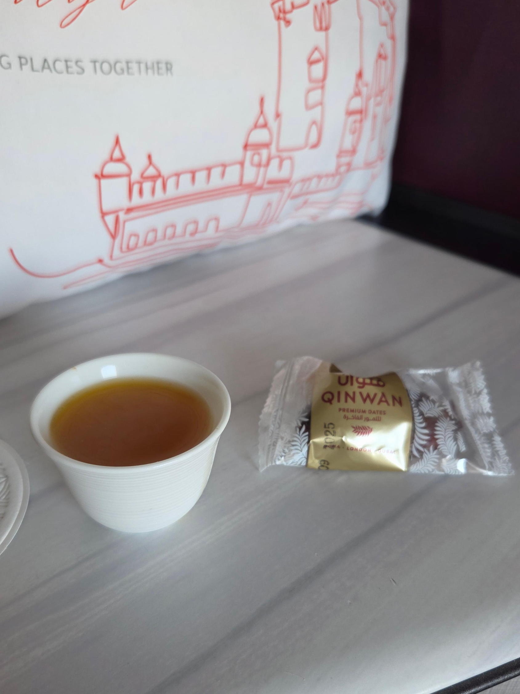 보딩은 항공기 출발 45분 전인 7시 10분에 정확히 시작했습니다. 휠체어를 탄 손님과 도움이 필요한 손님이 먼저 탑승했고 뒤이어 바로 비즈니스 클래스 승객이 탑승했습니다. 제가 이번에 탄 항공기는 에어버스사의 A350-1000 항공기로 Q스위트를 장착한 항공기였습니다. 비즈니스 클래스가 46석, 이코노미 클래스가 281석이 장착된 항공기였습니다. 항공기를 탑승하자 담당 승무원께서 오셔서 자기소개를 해 주셨고요, 웰컴 드링크 주문을 받고 가셨습니다. 웰컴 드링크로 샴페인을 가져다주시면서 Q스위트 좌석에 대한 간략한 소개를 해주셨습니다. 탑승이 완료된 후에는 라운지 웨어를 제공받았습니다. 한국에서 도하에 오는 항공기에서는 L사이즈를 주셨는데, 이번엔 M사이즈를 주셨습니다. 랜딩 전에는 중동의 시그니처 간식인 대추야자와 중동식 티를 받았습니다. 이륙 직후 일정 고도에 들어서자 승무원들이 돌아다니며 스위트 도어의 락을 풀어주셨습니다. 또한 이륙 직후에 사무장님께서 돌아다니시면서 탑승객 이름을 불러주면서 인사를 하셨습니다.10. 좌석