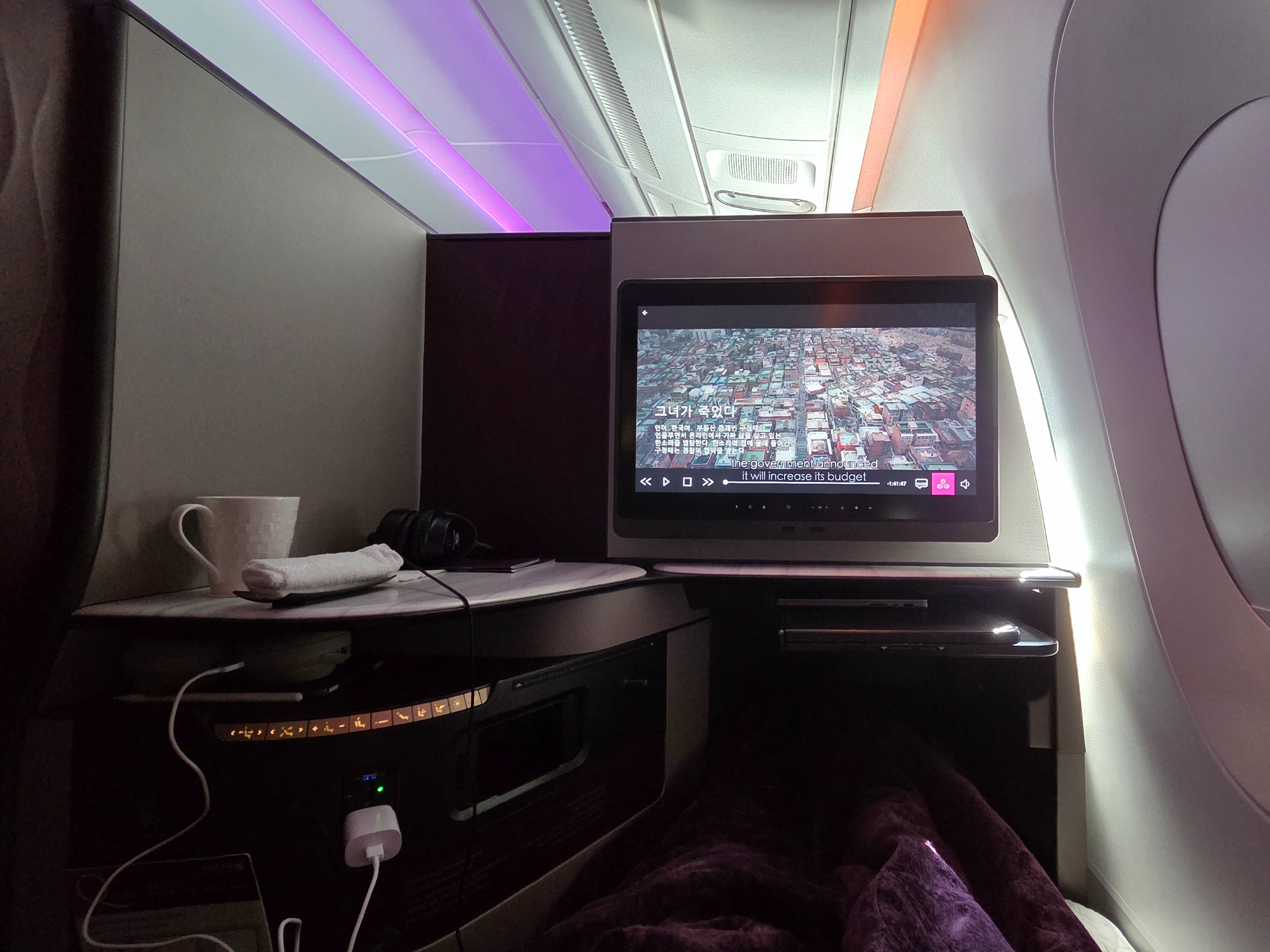 카타르 항공 A350-1000 비즈니스 클래스 Q스위트 HDMI연결을 지원하는 기내 엔터테인먼트 시스템 카타르 항공의 Q스위트가 장착되어 있는 A350의 경우 21.5인치 크기의 풀 HD 해상도의 모니터가 탑재되어 있습니다. 최근에 새로 발표되는 비즈니스 클래스 좌석의 경우 4K 해상도까지 지원하는 경우가 많은데 카타르 항공의 Q스위트는 2010년대 후반부터 도입된 비즈니스 클래스 좌석이기에 Full HD 해상도의 스크린이 탑재되어 있습니다. 하지만 이 점이 크게 불편함으로 다가온다거나 하지는 않았고, 엔터테인먼트를 즐기기에 충분한 정도였고, 반응 속도도 빠릿빠릿해서 이용하는데 불편함은 없었습니다.