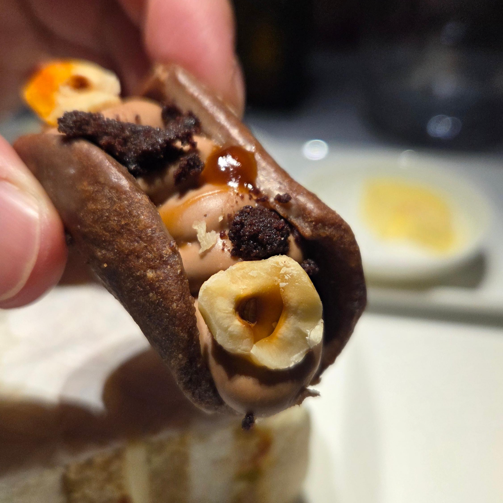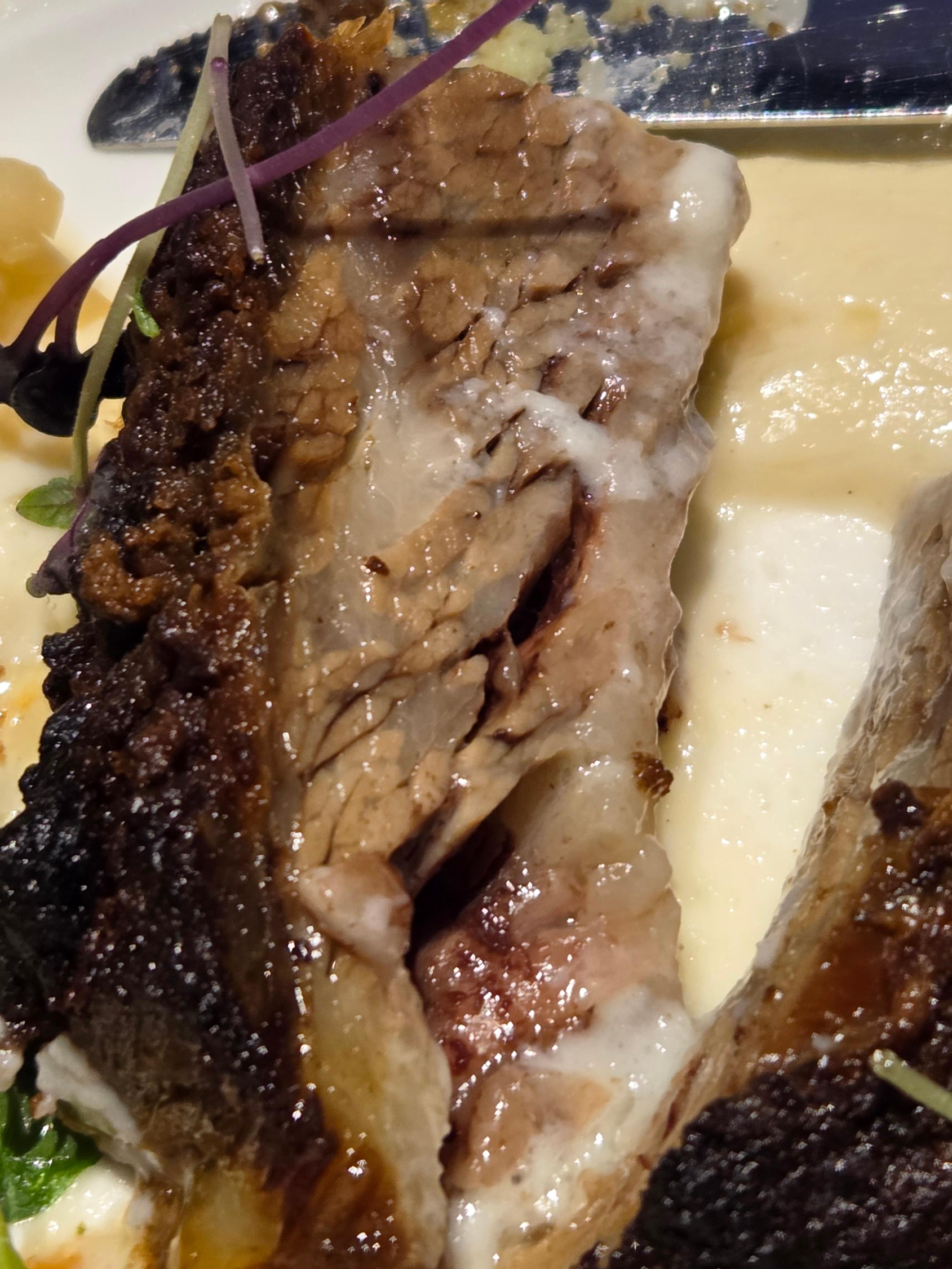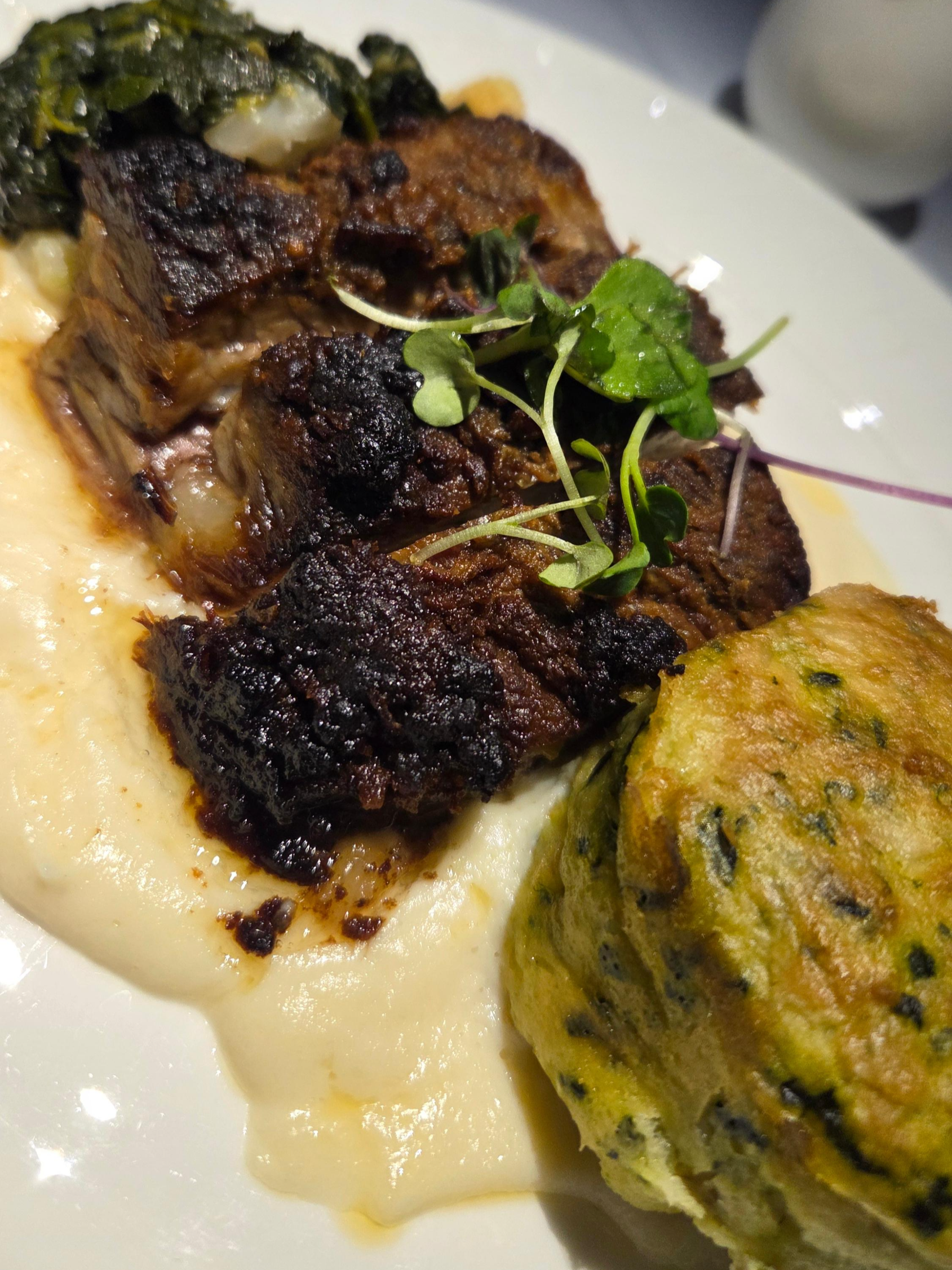 메인 메뉴는 갈비찜을 시켰습니다. 갈비찜은 컬리플라워 퓌레, 볶은 시금치, 프리타타가 같이 제공되었습니다. 갈비찜은 소스가 별도로 제공되었고요, 좋은 등급의 고기를 사용했는지 지방이 많고 조리가 충분히 되어 포크로도 자를 정도로 부드러웠습니다. 다만, 약간의 느끼함도 있어 저는 머스터드를 따로 요청해서 같이 먹으니 훨씬 맛있었습니다. 컬리플라워 퓌레는 컬리 플라워의 독특한 향이 강하지 않았고 식감은 매쉬드와 비슷해서 함께 먹기 나쁘지 않았고, 볶은 시금치는 식감이 잘 살아있어 부드러운 고기에 식감을 더하기에 좋았고 프리타타는 평범한 맛이었습니다.