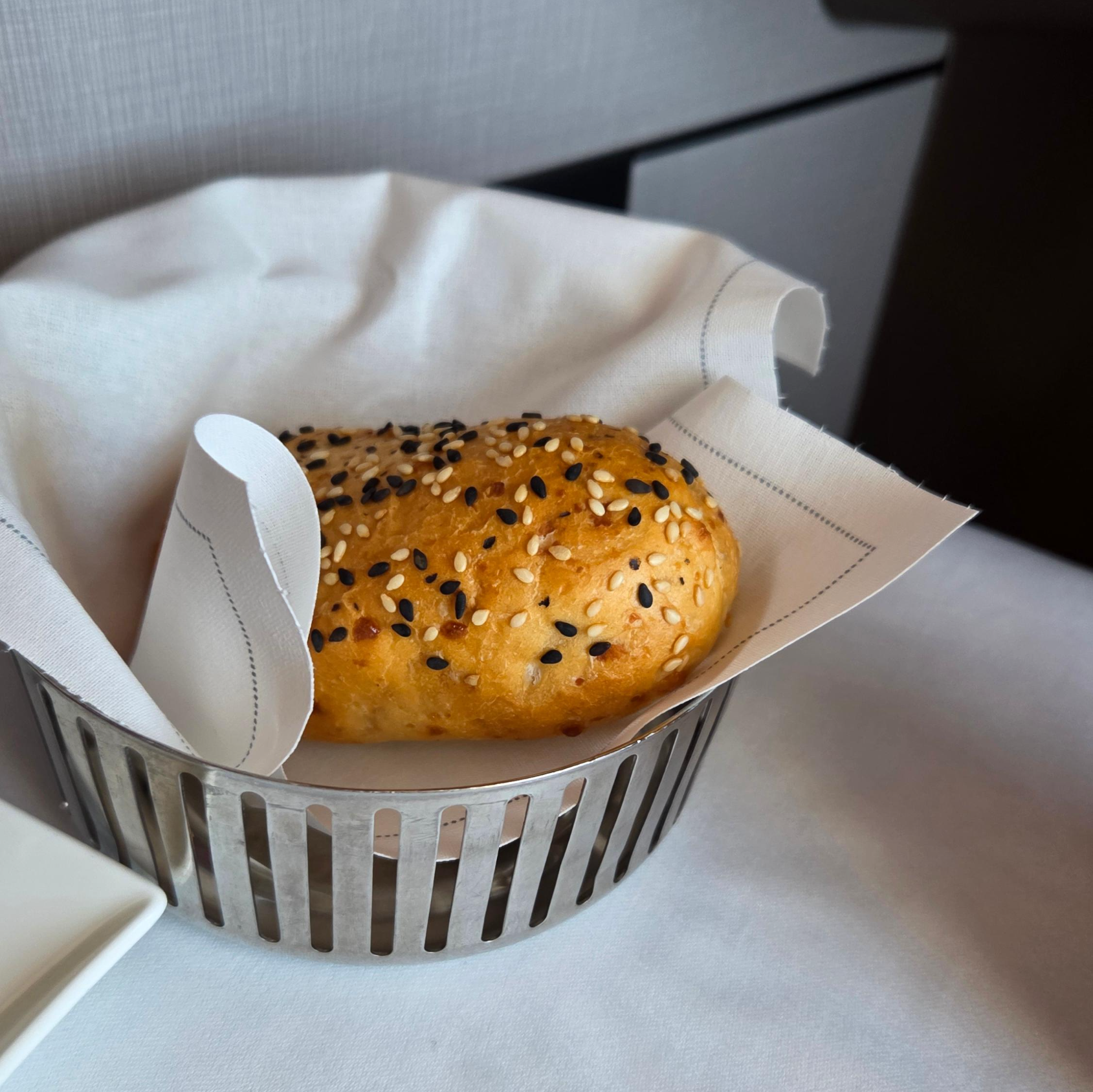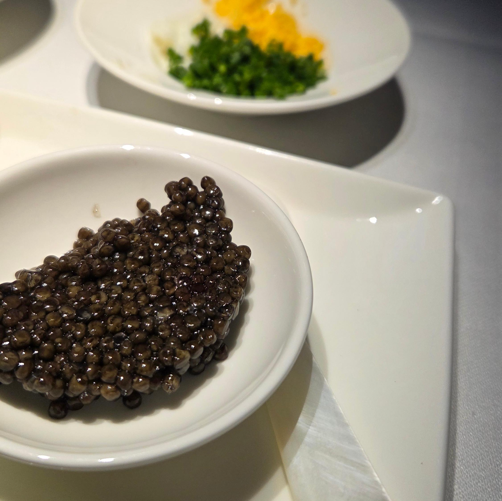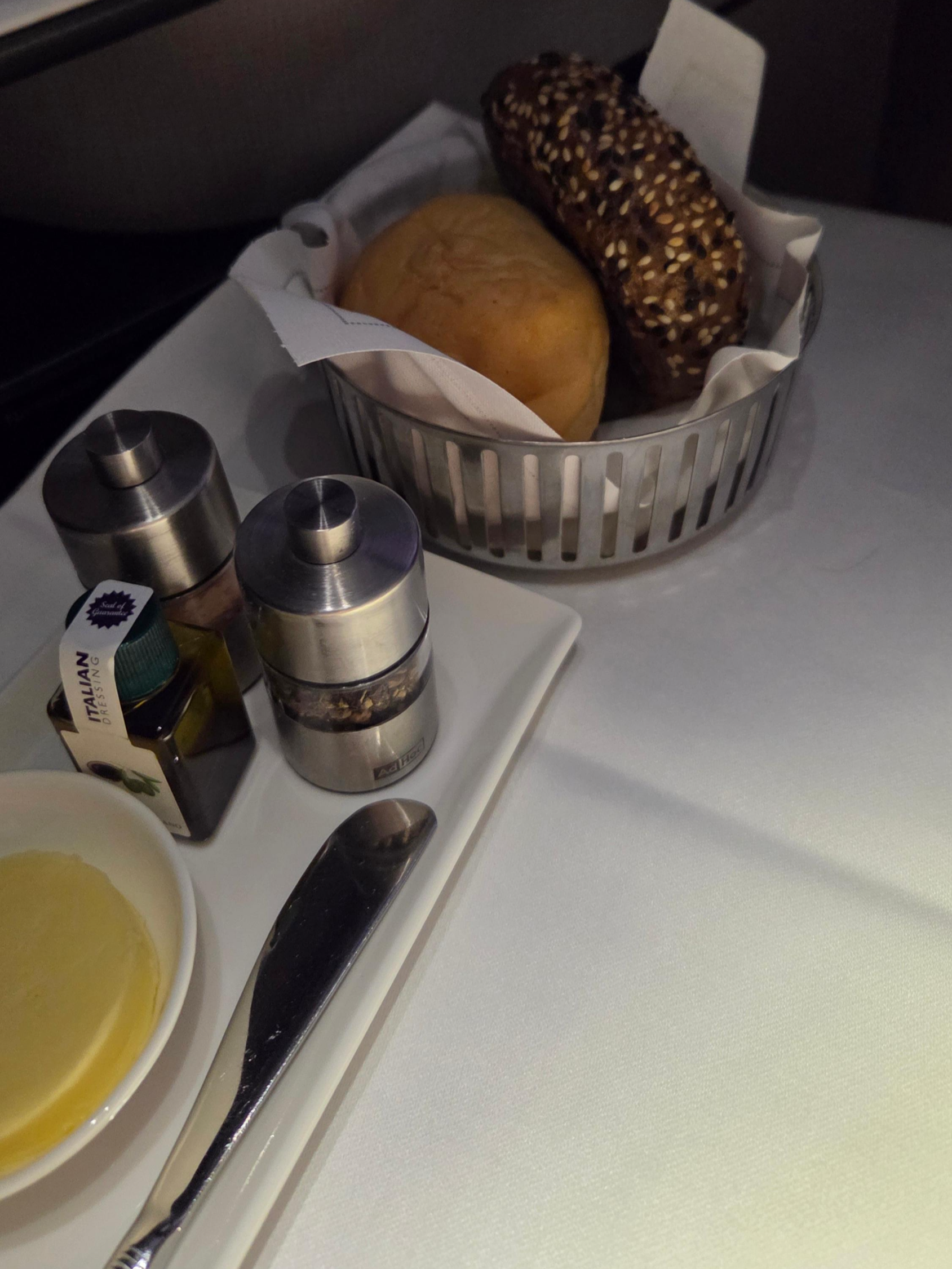 다시 메뉴로 돌아가서 음식에 대한 이야기를 하자면, 먼저 세 종류의 빵이 나왔습니다. 빵은 포카치아와 바게트, 롤이 나왔습니다. 버터와 발사믹 소스가 함께 서빙이 되었습니다. 빵은 엄청 ‘우와’는 아니어도 충분히 괜찮았고요, 다만 발사믹 소스가 신맛만 강해서 조금 아쉬웠습니다. 진짜 맛있는 발사믹 소스는 약간의 단맛도 나거든요. 다음으로는 캐비어와 훈제 연어가 나왔습니다. 카타르 항공이 2024년 8월부터 13개 노선의 비즈니스 클래스 캐빈에서도 캐비어를 제공하기 시작했는데요, 댈러스 포트워스 노선도 그중 하나였습니다. 캐비어는 크림, 다진 부추, 계란과 곁들여 먹을 수 있는 빵과 함께 제공이 되었습니다. 제가 캐비어를 많이 먹어보지는 않았지만, 알도 작지 않고 맛도 크리미 하면서도 많이 비리지 않고, 짜지 않아 괜찮은 등급의 저염 캐비어를 서빙하는 것 같았습니다. 함께 나온 연어는 헝겊에 감싼 레몬과 제공되었는데요, 이렇게 하면 레몬즙을 짤 때 레몬 씨나 과육이 떨어지지 않는 장점이 있습니다. 연어도 비리지 않고 연어의 풍미가 좋았습니다.