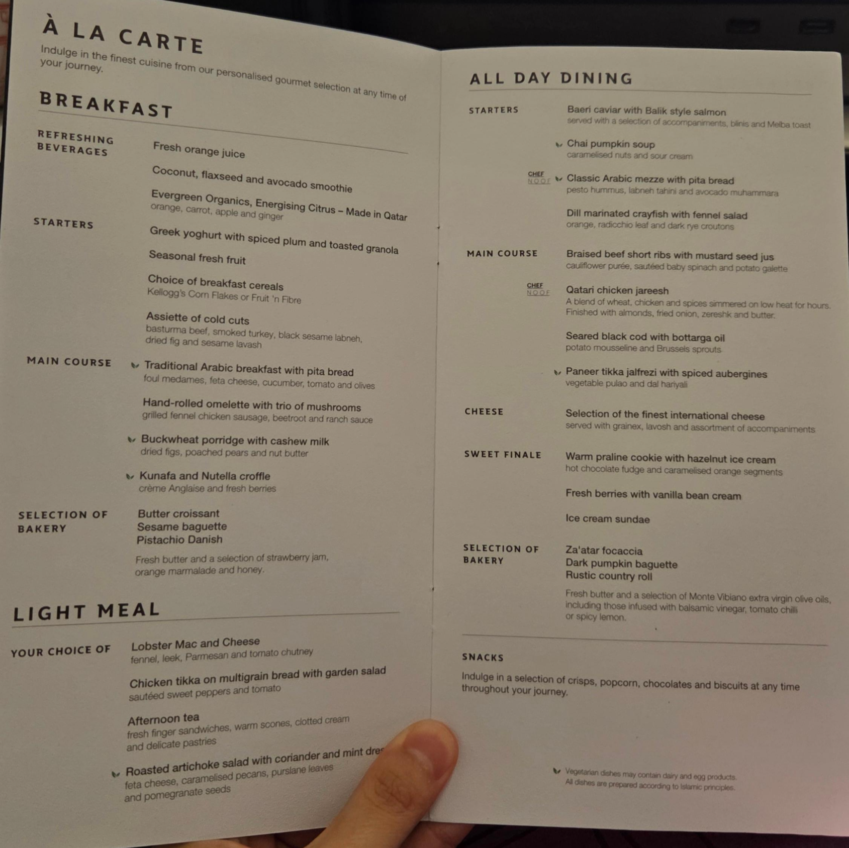 카타르 항공 장거리 비즈니스 클래스 메뉴 카타르 항공 비즈니스 클래스 기내식의 특징은 언제든지 주문할 수 있는 알라카르테 형식으로 제공된다는 점입니다. 실제로 이륙 후에 바로 잠을 자고 나서 이륙 후 식사를 할 수도 있고, 착륙 전 식사를 미리 할 수도 있습니다. 또한 메인 메뉴를 하나만 고르는 게 아닌, 메뉴판에 있는 메뉴들 중 직접 원하는 메뉴들로 코스를 구성할 수 있다는 점도 카타르 항공의 장점인 것 같습니다.