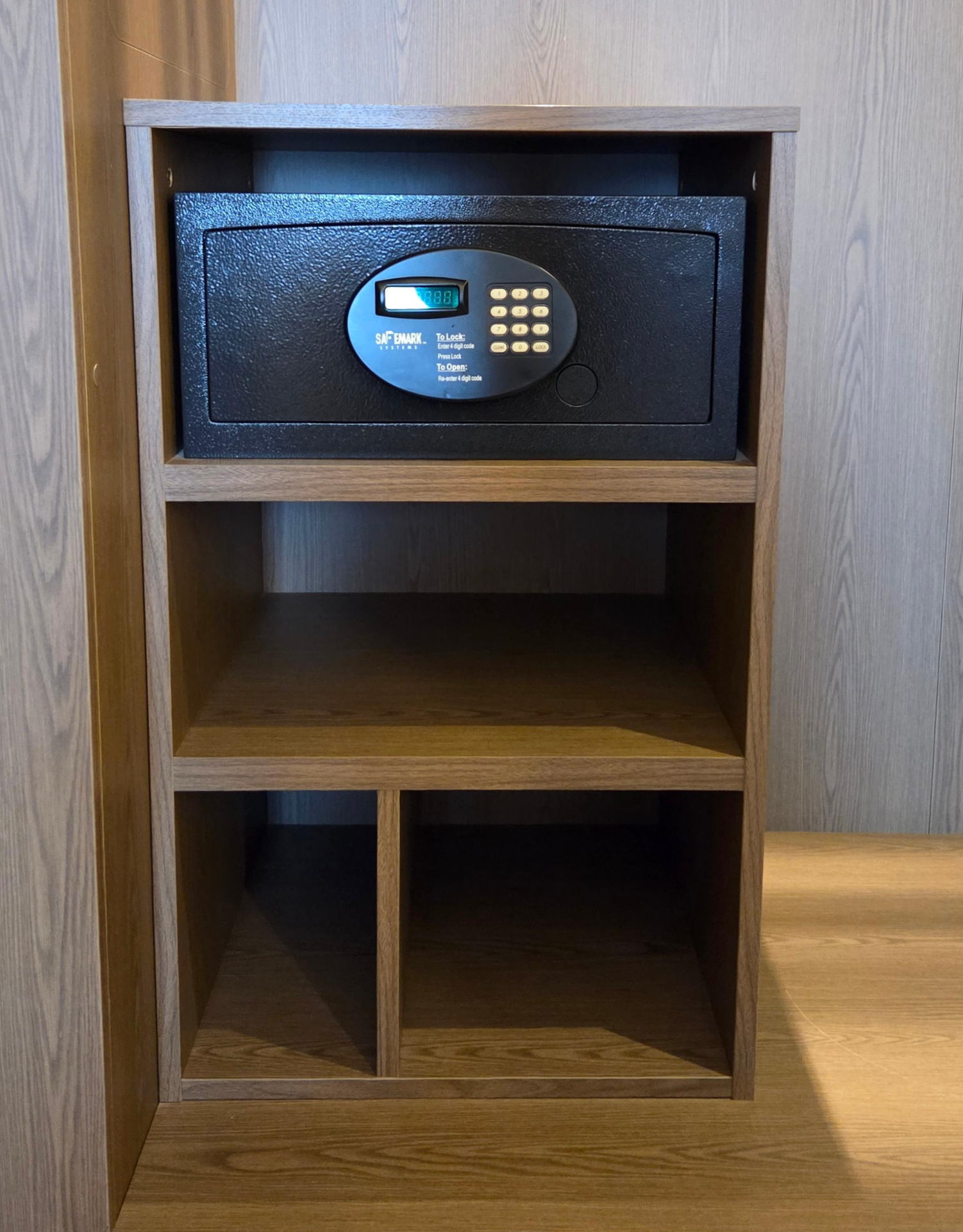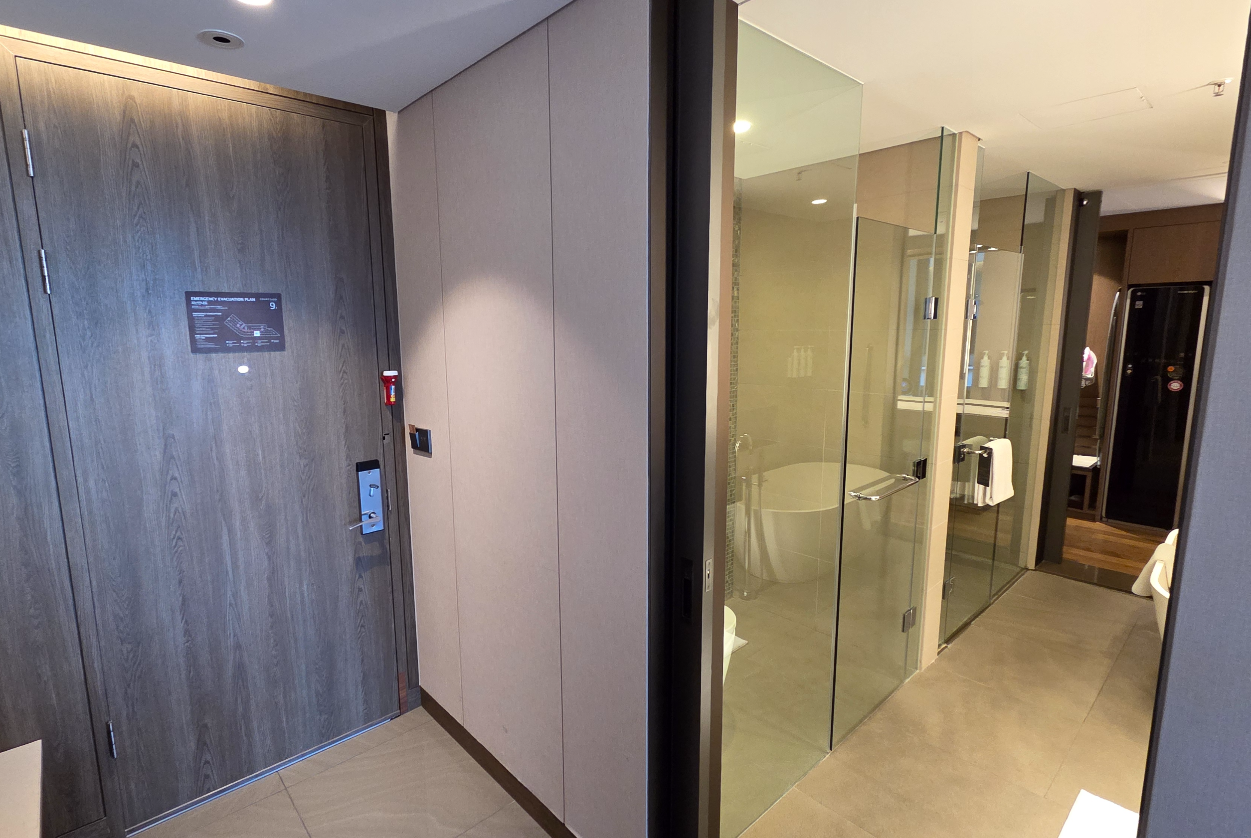 침실 한쪽에는 원래 일반 객실이라면 입구가 있어야 할 부분에 드레스 룸이 마련되어 있습니다. 코트야드 서울 보타닉 파크의 코트야드 스위트의 또다른 좋았던 점은 바로 트롬 스타일러가 설치되어 있었다는 점입니다. 투숙하는 동안 아주 요긴하게 사용했습니다. 평소 트롬 스타일러를 사용하시는 분이나 출장을 오신 분은 이 부분이 굉장한 플러스 요인이 될 것 같습니다. 드레스룸에도 캐리어를 놓을 수 있는 공간이 있었고 다림판과 다리미, 금고도 준비되어 있었습니다. 옷장도 넓고 옷걸이도 충분했습니다.