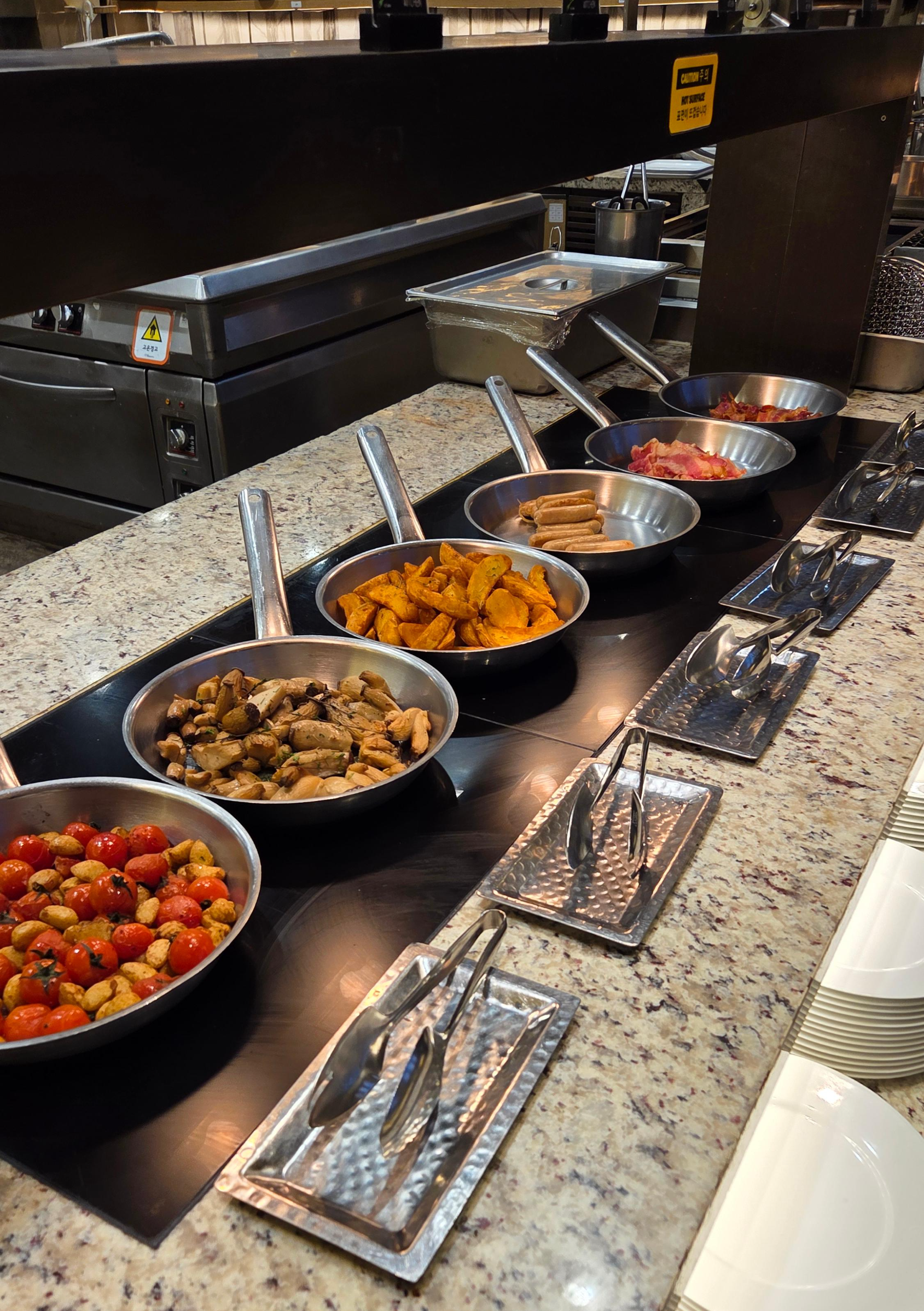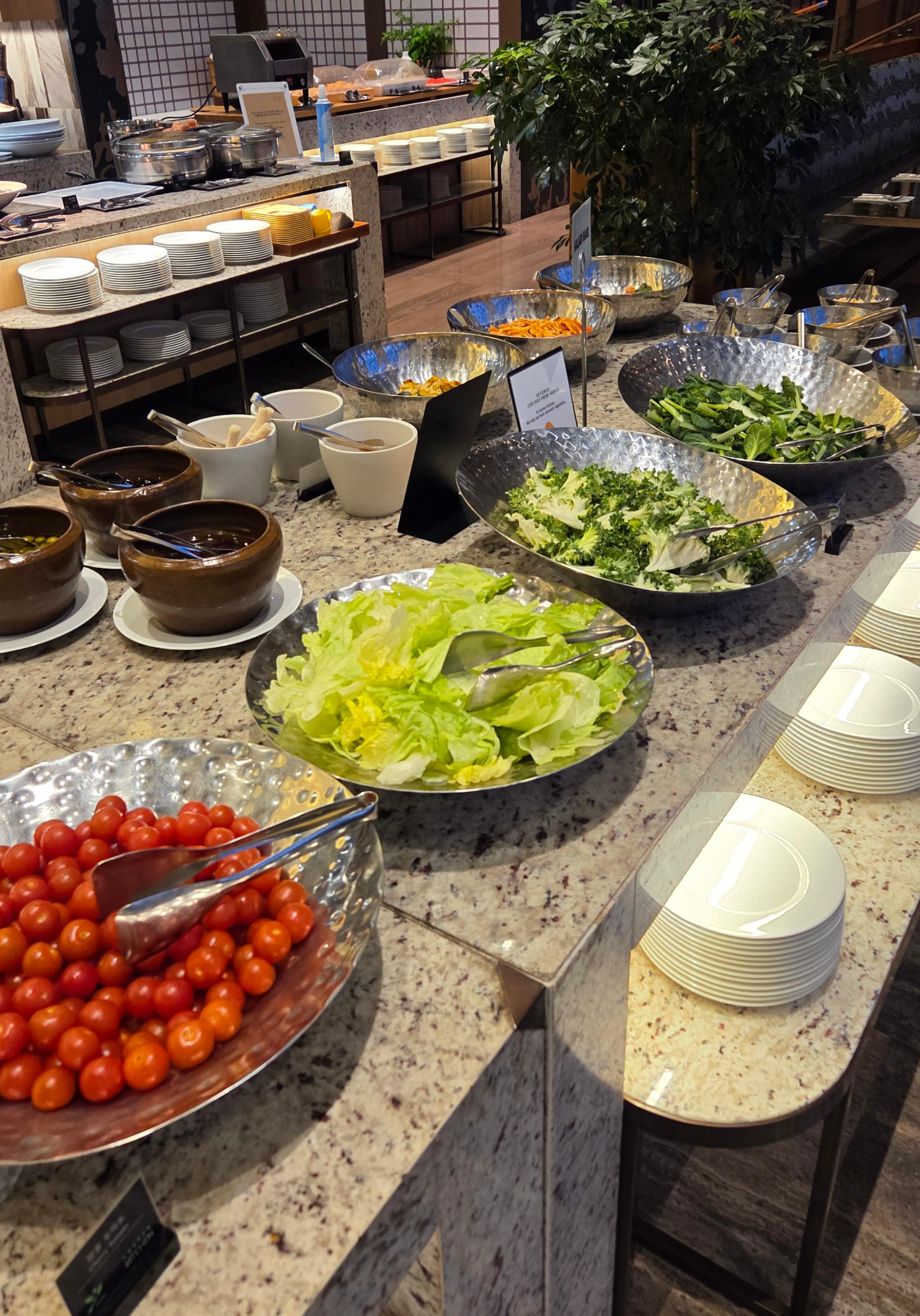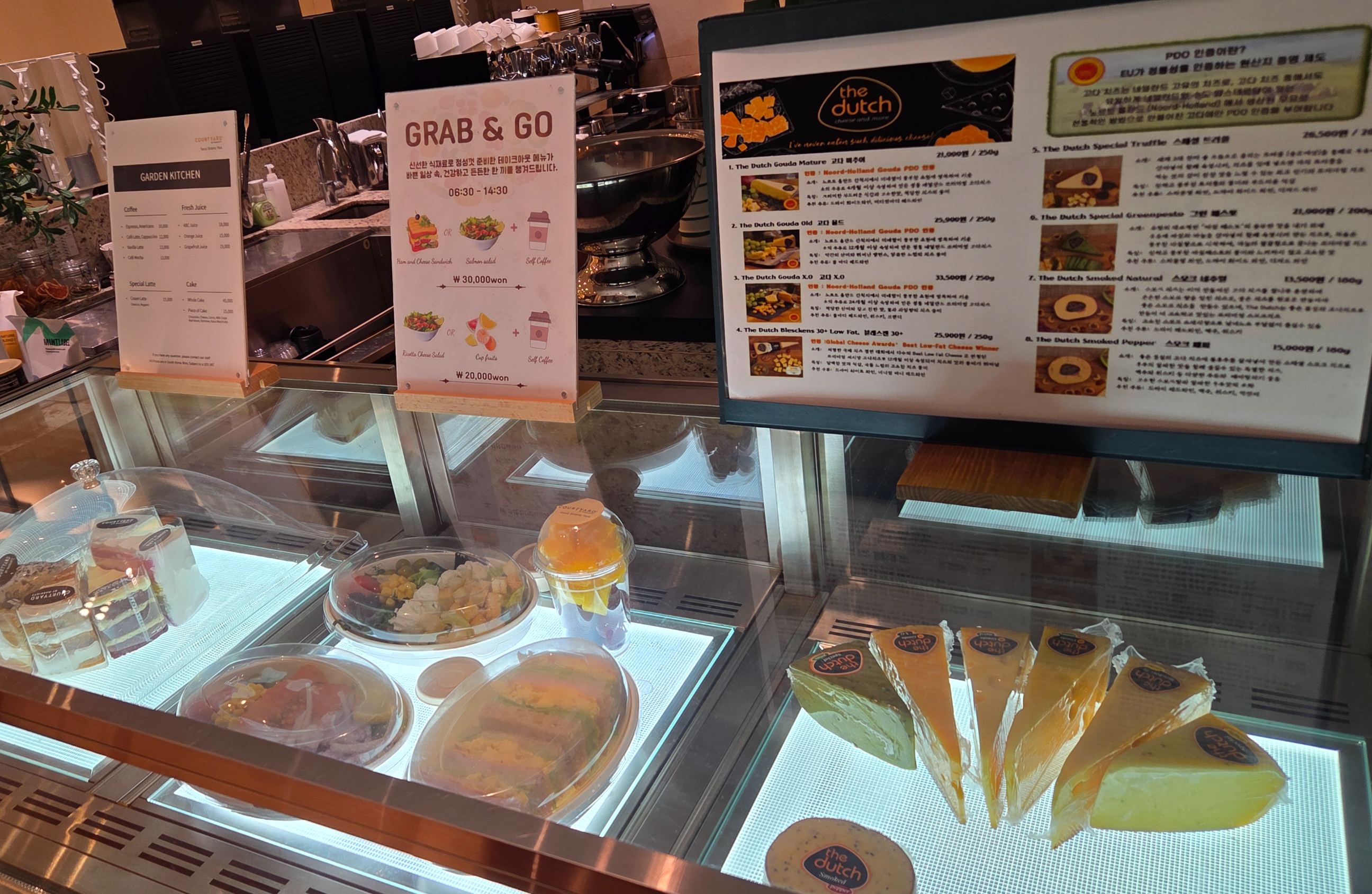 누들스테이션이 있어 우동과 쌀국수를 요청할 수 있고, 구운 닭고기와 베이크드 빈즈, 임연수 구이, 소불고기, 새우 파스타, 마파두부, 볶음밥도 있었고요, 콜드 샐러드 바에는 차가운 샐러드와 파스타, 단호박 샐러드 등이 있었습니다. 그 외에 다양한 빵과 페이스트리 류, 치즈와 햄이 있었고 음료는 당근 주스, 오렌지 주스, 사과 주스가 있었습니다. 과일로는 파인애플, 포도, 리치, 오렌지가 있었고 커피는 에스프레소 머신에서 직접 뽑아 먹는 방식이었습니다. 따뜻한 물과 다양한 티백도 준비되어 있었고요.