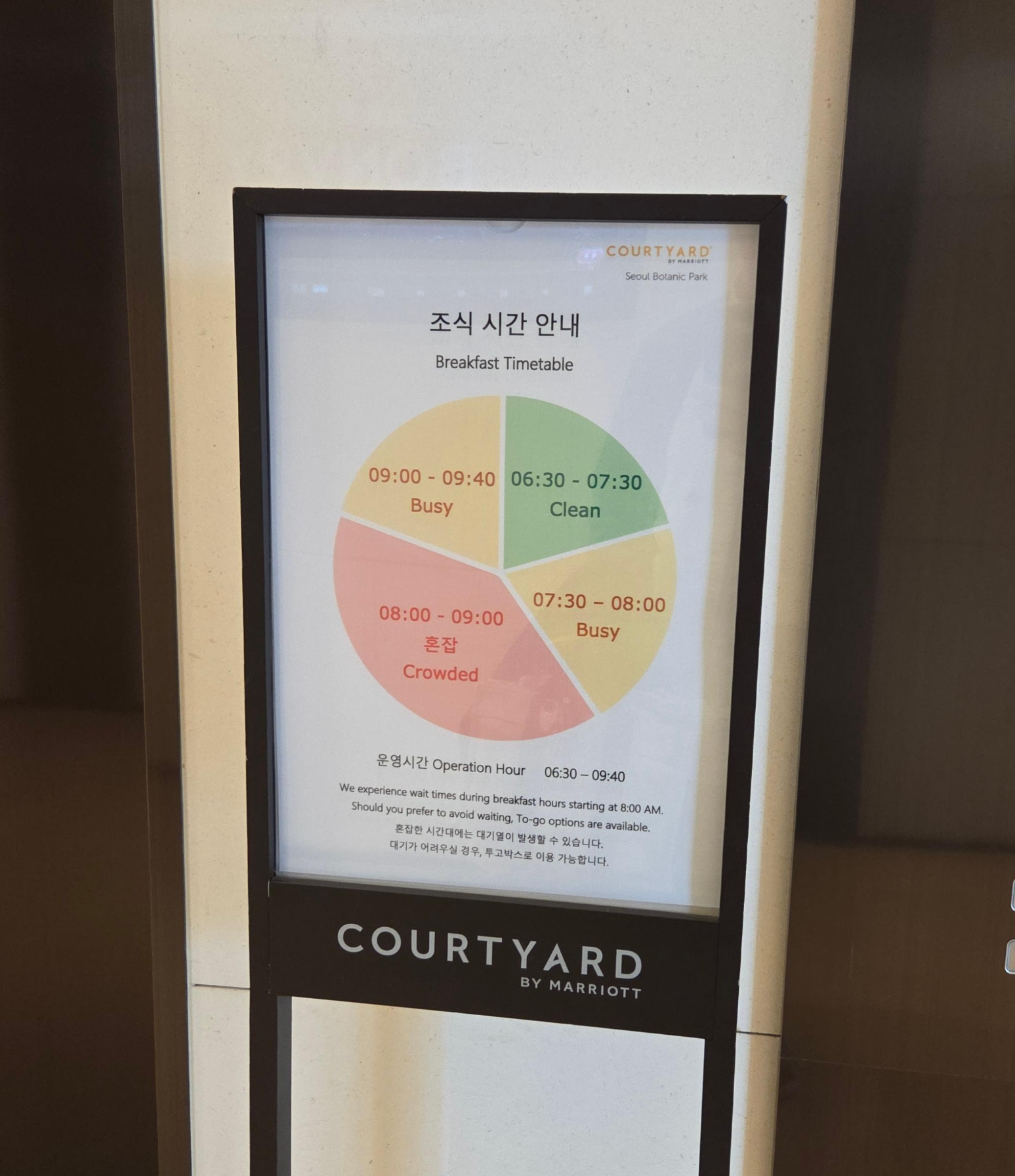 코트야드 서울 보타닉 파크의 조식은 오전 6시 30분부터 오전 9시 40분까지 운영됩니다. 엘리베이터 앞에 조식 시간에 따른 혼잡도에 대한 안내문이 있었는데요, 오전 6시 30분부터 7시 30분까지가 가장 한가하고 오전 8시부터 9시까지가 가장 혼잡하다고 나와있습니다. 조식은 1층에 있는 가든 키친에서 제공되고 가격은 성인은 44000원, 어린이는 22000원입니다.