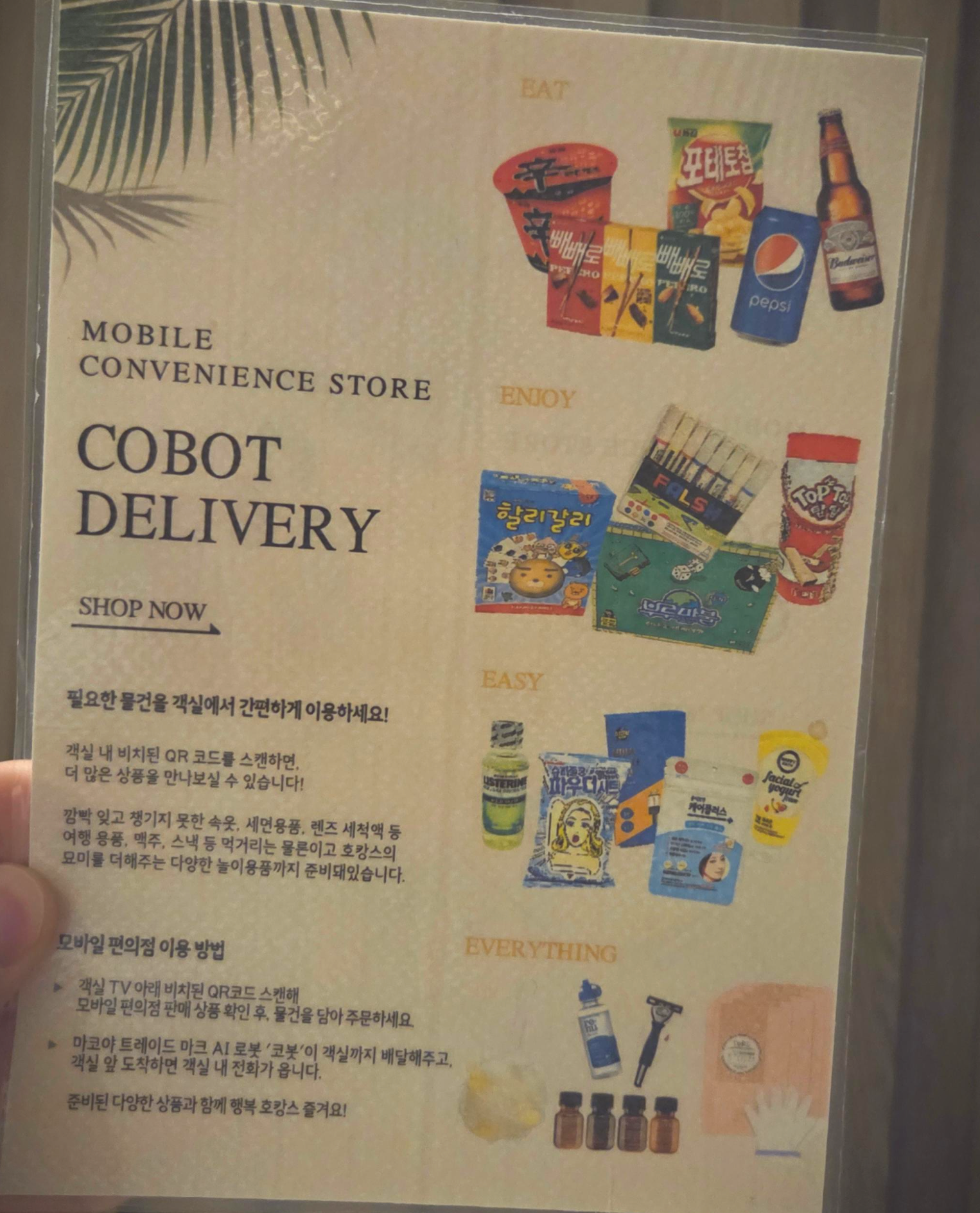 호텔 내의 다이닝 옵션으로는 1층의 가든 키친에서는 조식 뷔페 이외에도 중식 뷔페와 석식 뷔페를 운영하고 있습니다. 호텔 최상층인 15층에는 빈야드15라는 루프탑 와인바&다이닝이 오전 10시에서 새벽 1시까지 운영을 하고 있습니다. 이 외에도 인 룸 다이닝을 오전 6시 30분부터 오후 10시까지 운영을 하고, 모바일 편의점이라는 기능도 있어서 룸에서 편의점 주문을 넣으면 해당 물건을 룸으로 배달해 주는 기능도 있습니다. 이 기능은 24시간 운영합니다.