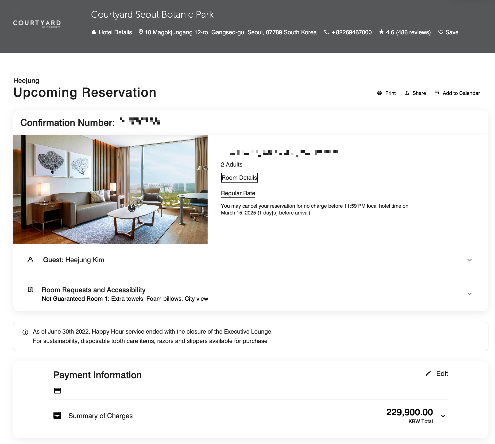저는 3월 중순 평일 숙박 기준으로 가장 기본방인 게스트 룸을 세금 포함 총 229,900원에 예약했습니다. 참고로 비수기 숙박의 경우 2~3달 전에 미리 예약을 하는 것보다 숙박일 기준 2~3주 전에 예약 하는게 조금 저렴한 경우도 있었습니다. 코트야드 서울 보타닉 파크는 10일 이상 투숙 시 최대 20%까지 요금을 할인해 주는 장기 숙박 할인도 있어 1박에 20만 원이 안 되는 가격으로 서울에서 투숙할 수 있는 장점 있습니다. 또한 이 호텔은 포인트로 숙박하기에 나쁘지 않은 가성비를 자랑합니다. 특히 메리어트 본보이 프로그램의 포인트 숙박 4+1 프로그램을 활용해 포인트 숙박을 한다면 최저 9만 포인트에 5박 숙박이 가능합니다.4. 숙박 시점 호텔 멤버십 등급