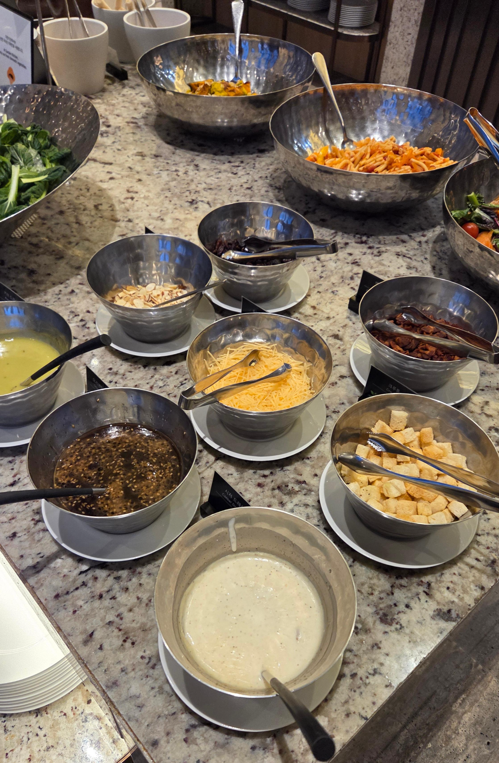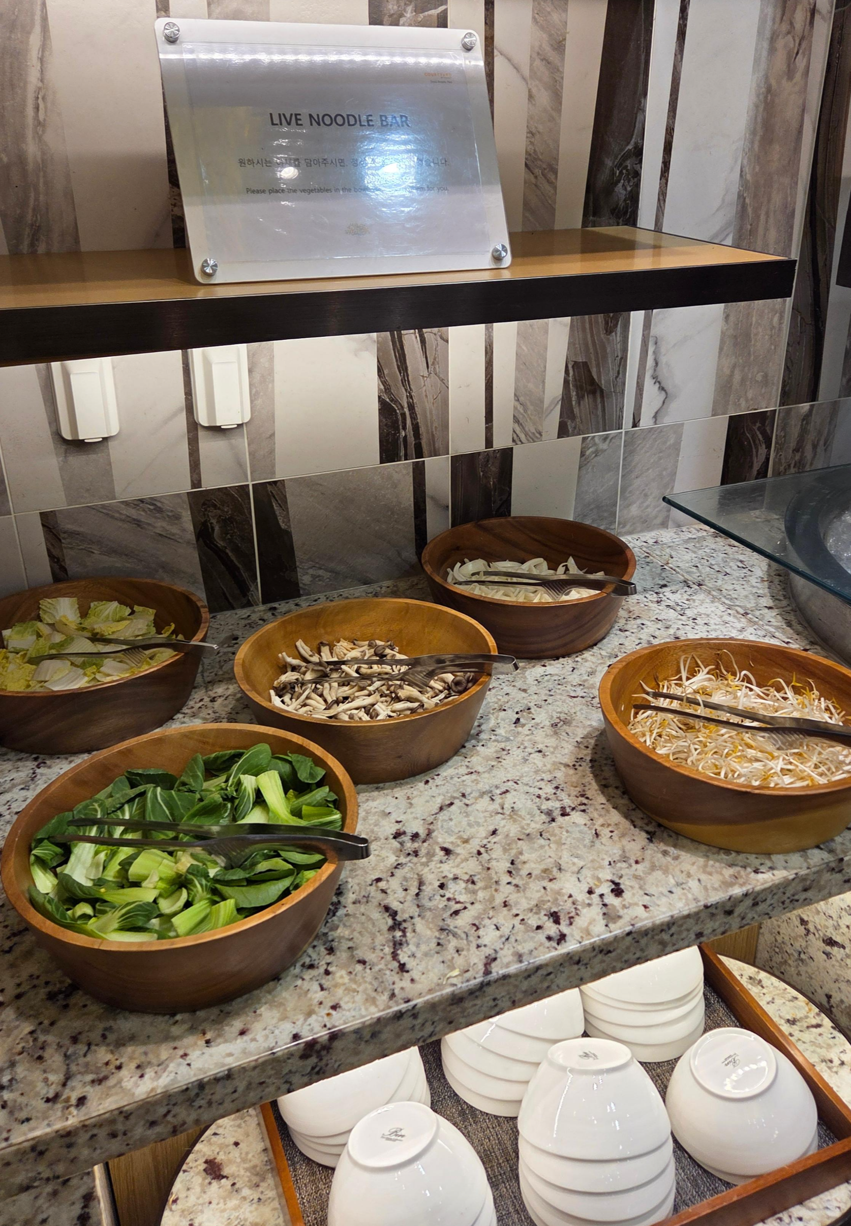 누들스테이션이 있어 우동과 쌀국수를 요청할 수 있고, 구운 닭고기와 베이크드 빈즈, 임연수 구이, 소불고기, 새우 파스타, 마파두부, 볶음밥도 있었고요, 콜드 샐러드 바에는 차가운 샐러드와 파스타, 단호박 샐러드 등이 있었습니다. 그 외에 다양한 빵과 페이스트리 류, 치즈와 햄이 있었고 음료는 당근 주스, 오렌지 주스, 사과 주스가 있었습니다. 과일로는 파인애플, 포도, 리치, 오렌지가 있었고 커피는 에스프레소 머신에서 직접 뽑아 먹는 방식이었습니다. 따뜻한 물과 다양한 티백도 준비되어 있었고요.