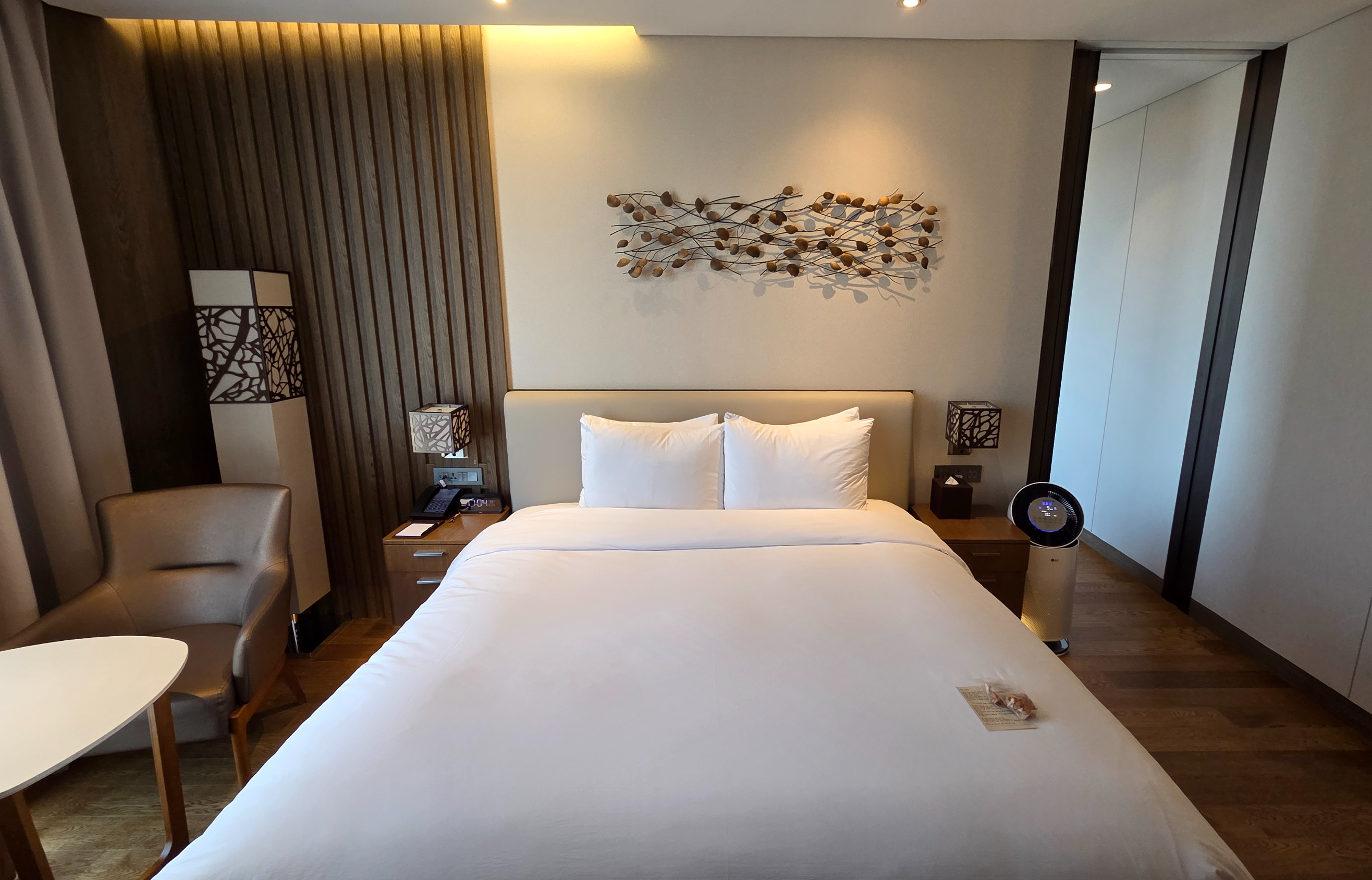 침실에는 킹 사이즈 침대 하나가 있고 양 옆으로는 사이드 테이블이 있었고, 창과 가까운 부분에는 미니 탁자와 의자 2개가 있었지만 공간이 협소해서 특별한 사정이 있지 않는 한 이 사이드 테이블보다는 거실을 이용하는 게 더 편리할 것 같았습니다. 침실에 있는 TV에는 따로 크롬 캐스트는 설치되어 있지 않아 일반 TV채널만 시청할 후 있었습니다. 침실 한켠에는 공기청정기가 설치되어 있어 투숙하는 내내 객실 내의 미세 먼지 농도가 낮은 수준으로 유지될 수 있어 좋았습니다.
