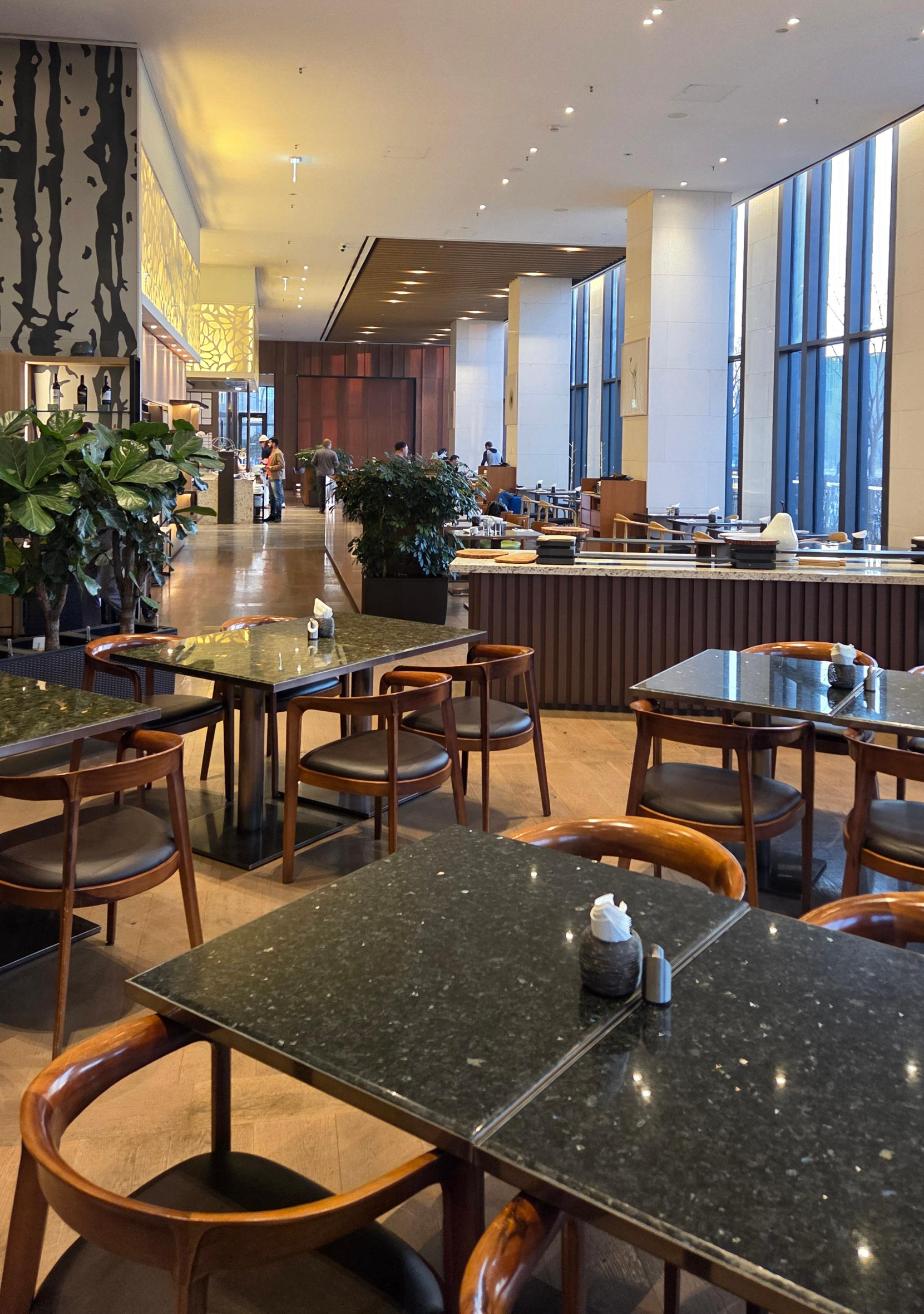 호텔 내의 다이닝 옵션으로는 1층의 가든 키친에서는 조식 뷔페 이외에도 중식 뷔페와 석식 뷔페를 운영하고 있습니다. 호텔 최상층인 15층에는 빈야드15라는 루프탑 와인바&다이닝이 오전 10시에서 새벽 1시까지 운영을 하고 있습니다. 이 외에도 인 룸 다이닝을 오전 6시 30분부터 오후 10시까지 운영을 하고, 모바일 편의점이라는 기능도 있어서 룸에서 편의점 주문을 넣으면 해당 물건을 룸으로 배달해 주는 기능도 있습니다. 이 기능은 24시간 운영합니다.