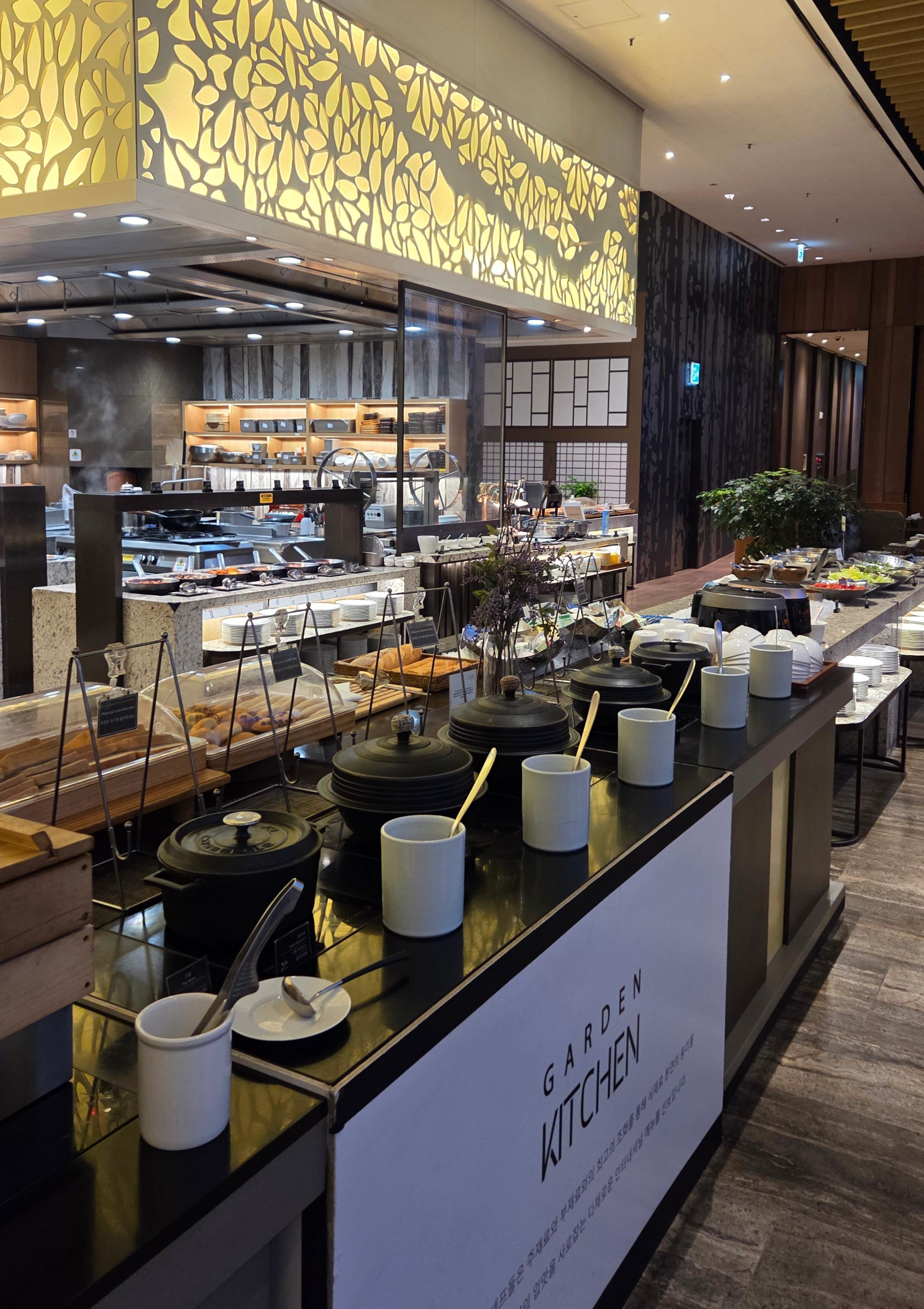 코트야드 서울 보타닉 파크의 가든 키친 조식은 코트야드답게 기본에 충실한 조식으로 구성되어 있습니다. 서양식 아침식사 메뉴로는 빵, 계란요리, 베이컨, 소시지, 팬케이크, 스프, 버섯 구이, 웨지 포테이토 등이 준비되어 있었습니다. 스크램블드 에그는 조리된 채로, 계란 프라이는 셰프님께서 상황에 맞춰 계속 조리해서 리필해 주시고, 오믈렛은 에그 스테이션에서 원하는 방식으로 조리를 요청할 수 있습니다. 한식의 경우 흰쌀밥만 제공이 되고요, 된장국과 소쇠고기 죽과 더불어 여러 야채들(당근, 호박, 무, 콩나물 무침 등)이 있어서 비빔밥을 해 먹을 수 있게 되어있었지만, 밥의 경우 조금 질어서 비비기가 쉽지 않았습니다. 또한 현미밥이나 잡곡밥과 같은 옵션이 없었다는 점도 아쉬웠고요. 그 외에는 콩자반과 김치 등의 반찬이 있었습니다.