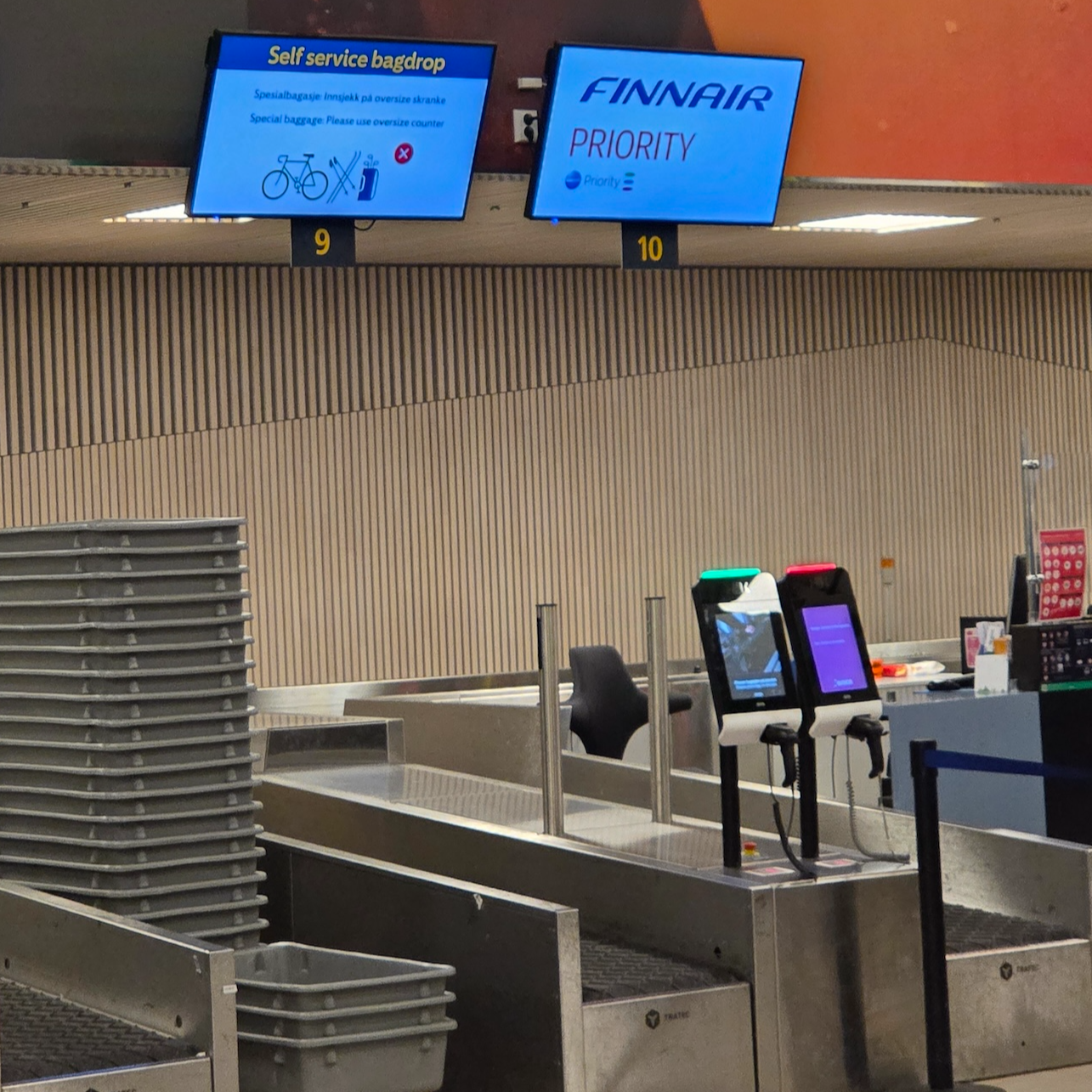 노르웨이의 트롬쇠 공항은 단일 터미널로 이루어진 건물이기에 모든 항공사들의 체크인은 트롬쇠 공항 1층 체크인 카운터에서 진행됩니다. 핀에어는 대부분 셀프 키오스크로 체크인을 한 후, 백 태그를 직접 받아서 붙인 후에, 백드롭에서 바코드를 인식하고 수하물을 부치는 방식으로 진행됩니다. 하지만, 우선 체크인 카운터를 이용할 수 있는 핀에어 플러스 실버 이상 회원이나 원월드 루비 이상 등급 회원의 경우 우선 체크인 카운터를 이용할 수도 있습니다. 다만, 때에 따라 우선 체크인 카운터의 줄이 더 길 수도 있어서 상황을 봐서 이용하시면 좋을 것 같습니다.