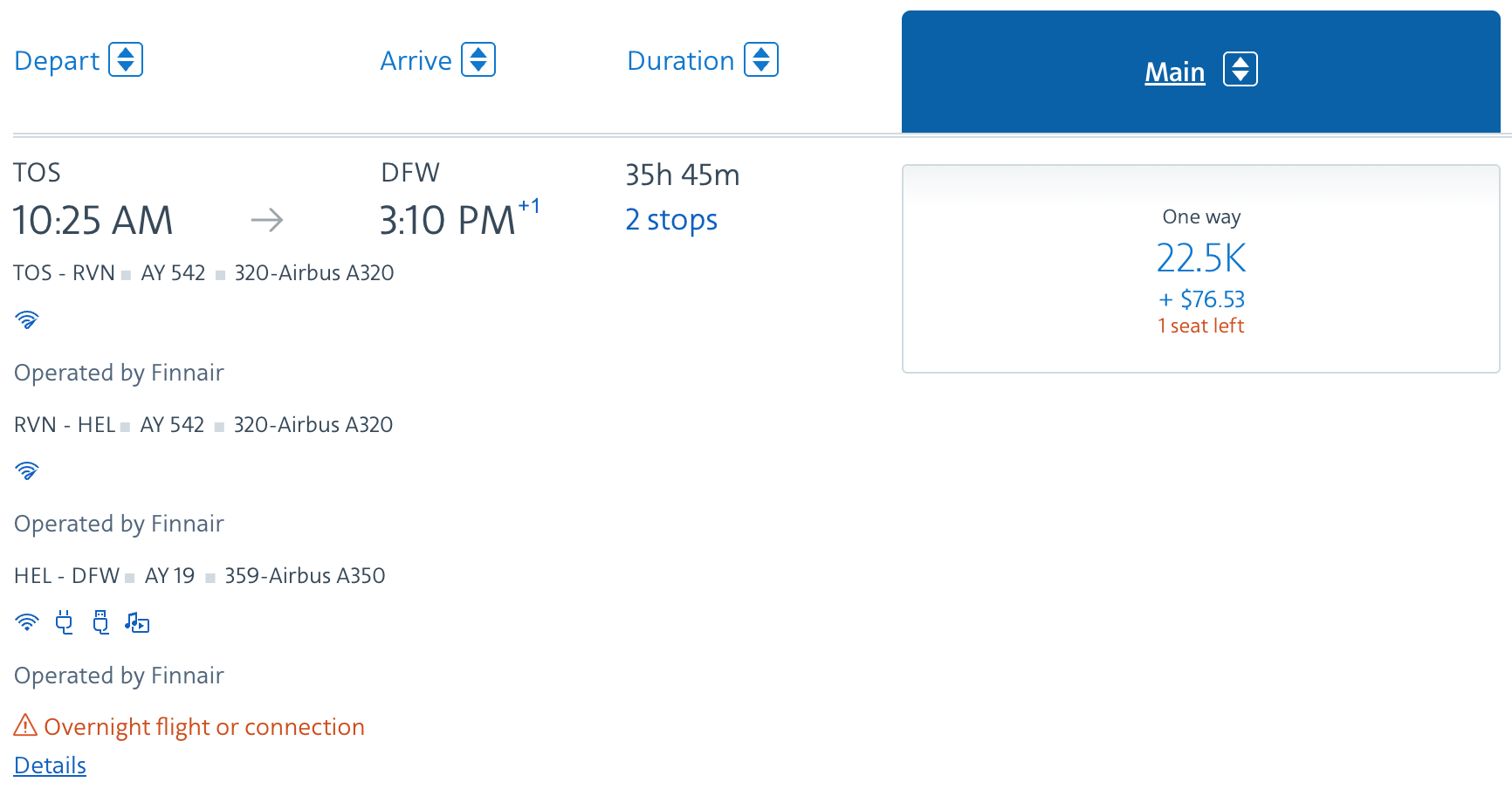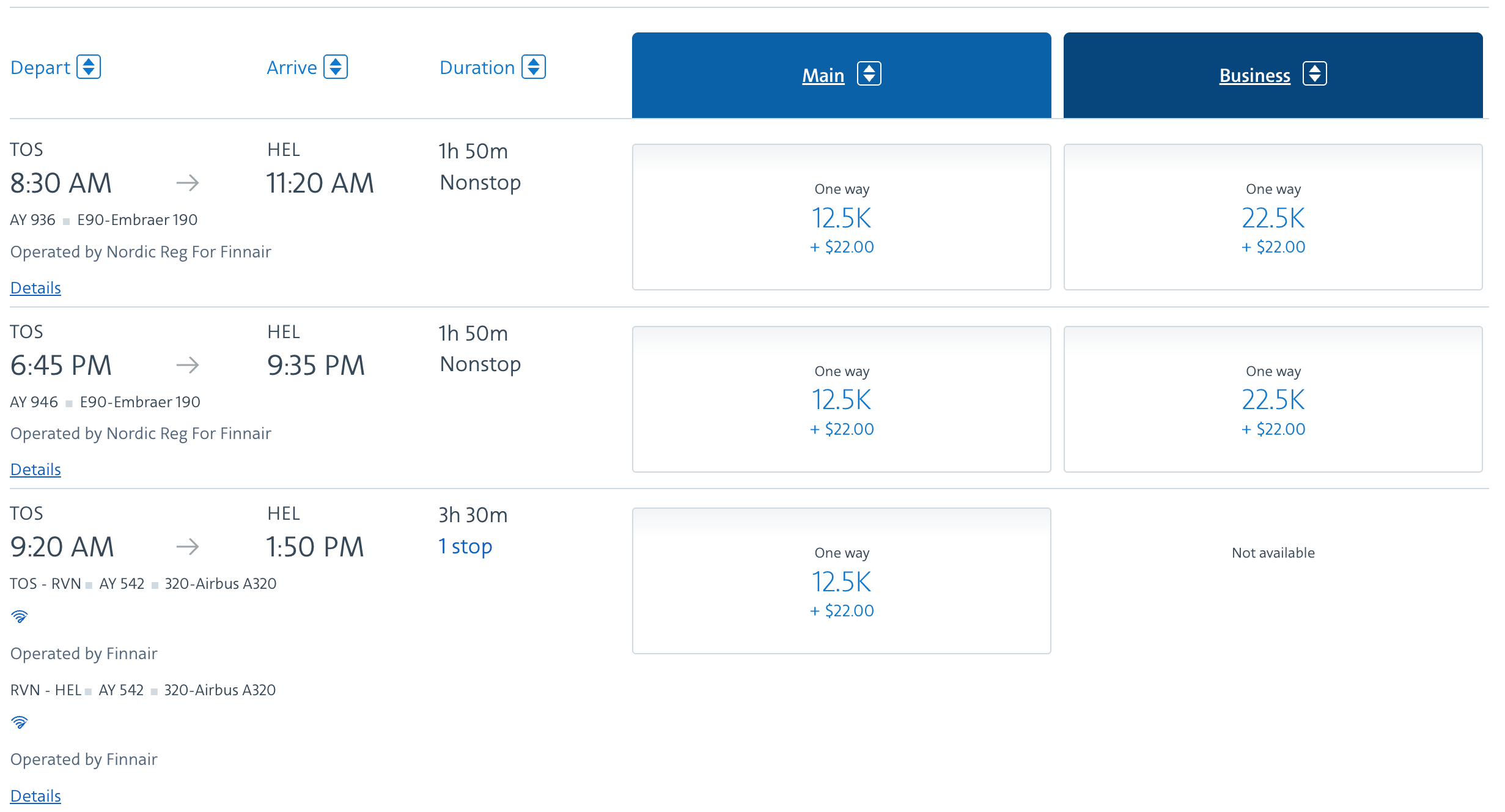 트롬쇠에서 헬싱키까지 오는 구간만 별도 발권한다면 아메리칸 항공 마일리지로는 12,500 마일에 세금 22 미국달러가 들고, 알래스카 항공 애트모스 포인트로는 7,500 포인트에 세금 35 미국달러가 듭니다. 다만, 제가 탄 중간에 1 스탑을 하는 항공권의 경우 알래스카 항공 프로그램은 더 비싼 요금을 청구하니 알래스카 항공 포인트로 발권하는 경우 반드시 직항 논스탑 항공권을 구입하셔야 합니다. 아메리칸 항공마일의 경우는 논스탑, 1 스탑 상관없이 동일한 가격에 구입할 수 있습니다. 다만, 이 경우도 항공편명이 같은 직항 1 스탑 노선이 아닌 항공편명이 달라서 로바니에미에서 비행기를 갈아타야 하는 경우 로바니에미 공항 이용료가 붙어서 세금이 조금 더 붙을 수 있으니 주의하시기 바랍니다. 운항 항공사인 핀에어를 이용하시는 경우 직항 항공편의 경우 12,000 아비오스와 세금 39.4 미국달러에 발권하실 수 있습니다.