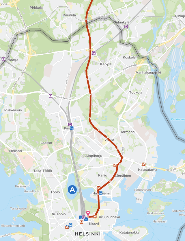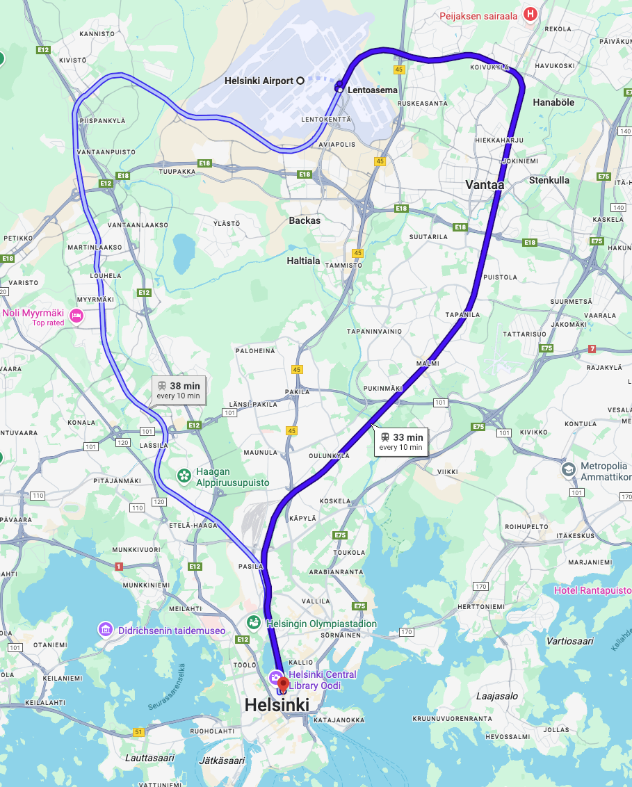 만약 헬싱키 다운타운이 아닌 북동쪽 지역에서 머무시는 경우 P선이나 I선을 이용하시는 것보다는 600번 버스를 이용하시는 게 더 편리할 수 있습니다. 따라서 무조건 기차를 타시기보다는 구글 지도의 길 찾기를 통해 최적의 경로를 찾으신 후 이동하시는 걸 추천드립니다.
