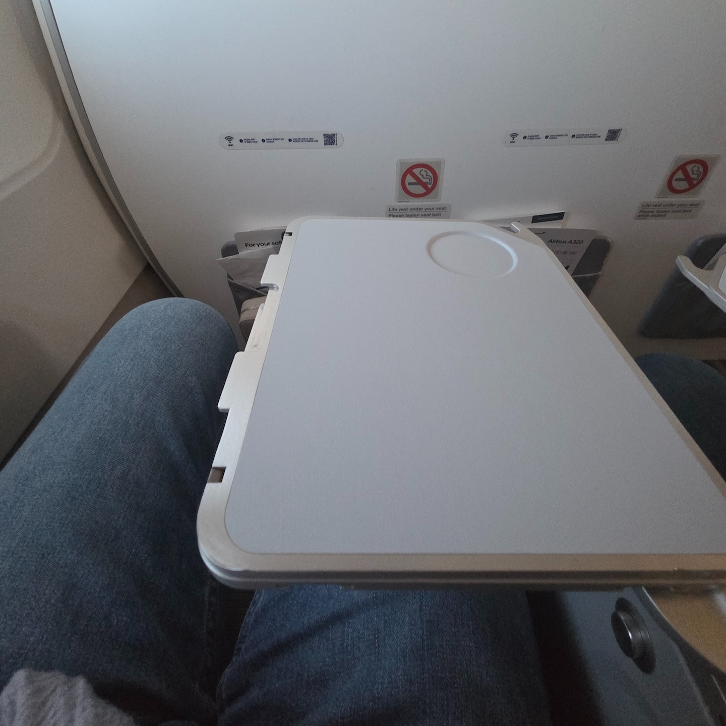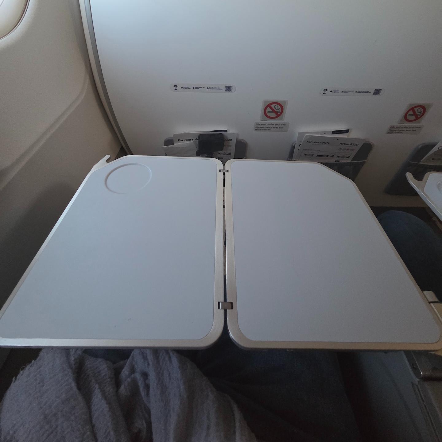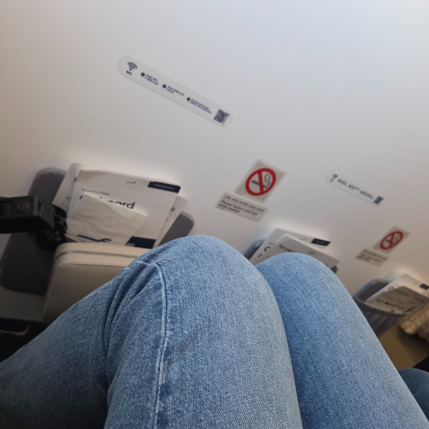 제가 앉은 1열은 벌크헤드 좌석으로 좌석 앞에는 기내 메뉴와 세이프티 카드가 있는 가죽 주머니가 있었습니다. 벌크헤드 좌석은 앞에 다른 좌석이 없어 더 나은 개방감을 제공하지만, 실제로는 앞 좌석 밑으로 발을 넣을 수가 없어 절대적인 시트 간격은 넓을지 몰라도 체감상 시트 간격은 더 좁게 느껴졌습니다. 비행 내내 무릎을 아예 펼 수가 없었는데요, 이 때문에 너무 답답했습니다. 아마 다음 비행부터는 1열이 아닌 2열을 골라야겠다는 생각을 할 정도로 불편한 부분이었습니다. (이는 A320과 같은 핀에어의 협동체 비행기에만 적용되는 사항입니다.)
