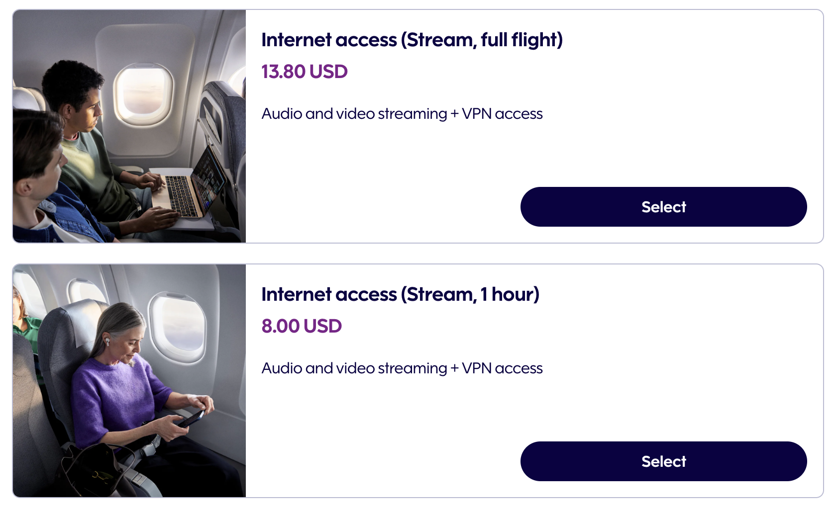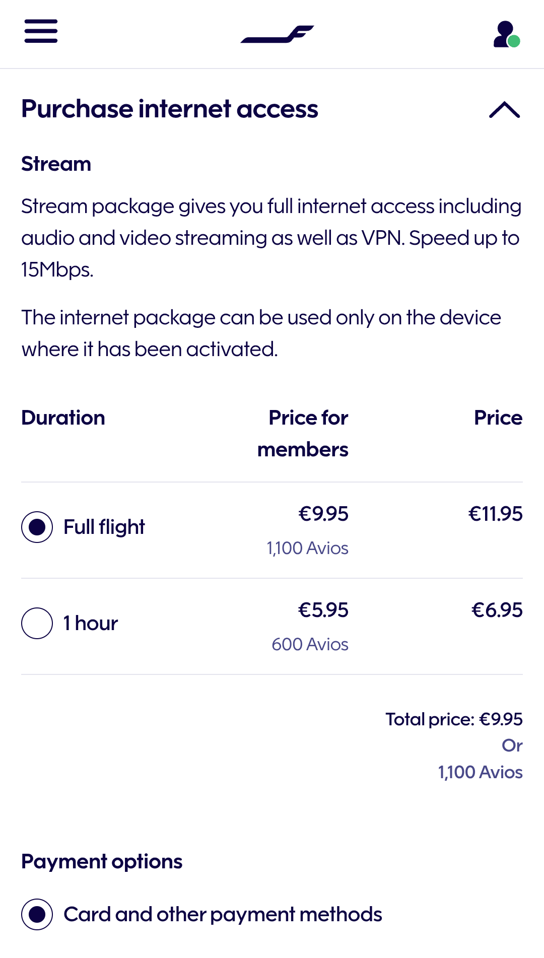 또한 기내 와이파이를 통해 유료로 인터넷을 이용할 수도 있습니다. 기내 유로 인터넷 구매는 비행 탑승 전 핀에어 웹사이트나 앱의 내 여행 관리 메뉴를 통해서도 가능한데요, 이 가격은 할인되지 않은 가격입니다. 핀에어 플러스 회원의 경우 기내에서 할인된 가격으로 인터넷을 구매할 수 있기 때문에 미리 구입하지 마시고, 반드시 비행 중에 구입하시는 것을 추천드립니다. 가격은 비행 내내 이용의 경우 할인 전 11.95유로, 할인 후 9.95유로이고, 1시간 이용권의 경우 할인전 6.95유로, 할인 후 5.95유로입니다.