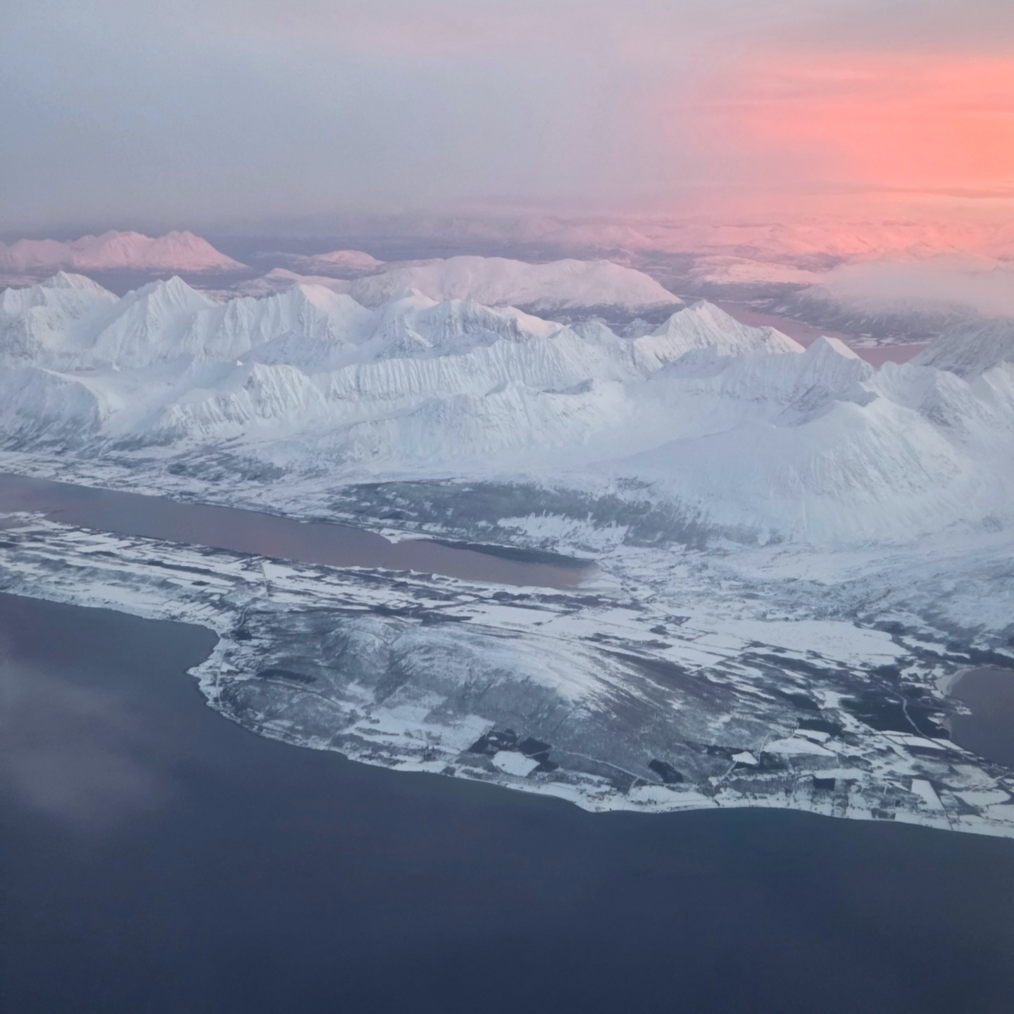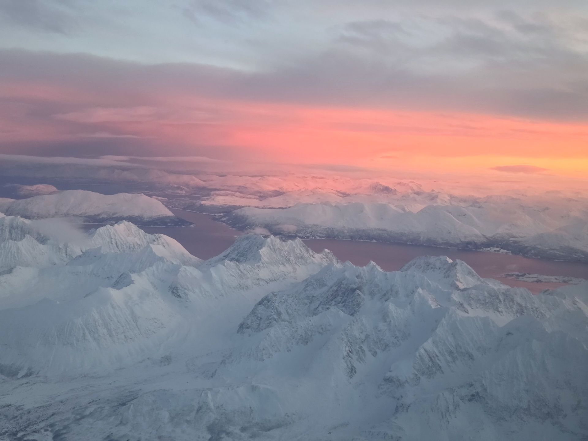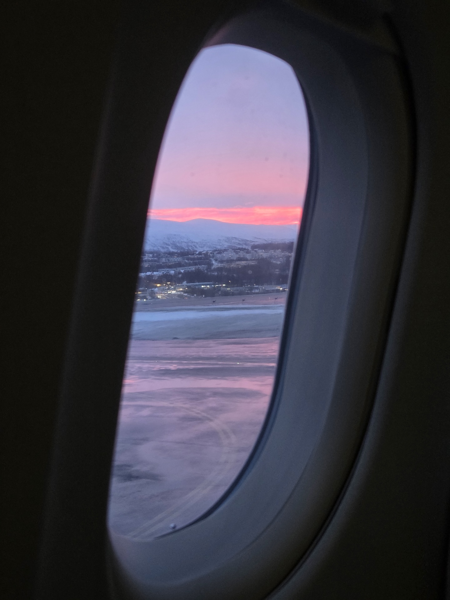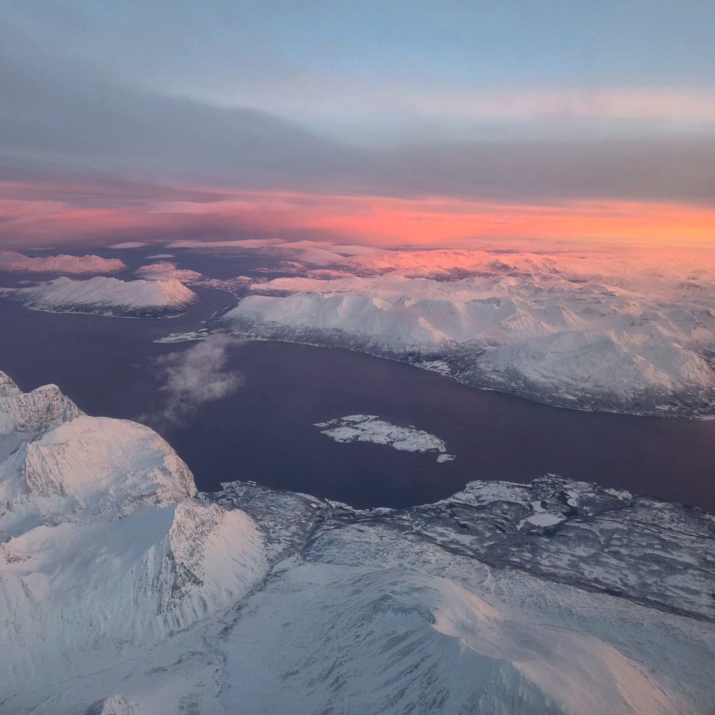 비행기는 10시 10분에 이륙을 했습니다. 제가 AY542편에 탑승했을 때는 해가 하루 내내 지평선 위로 올라오지 않는 흑야가 시작된 때였습니다. 하루 종일 어두울 것이라는 생각과는 달리 박명이라 부르는, 해가 위로 올라오지는 않아도 지평선 근처로 오면 세상이 밝아지는 시간은 있었기 때문에 해가 뜨지 않았음에도 어둡지는 않았습니다. 비행기가 이륙하고 고도를 올려 남쪽으로 향하면서 점점 나타나는 해를 볼 수 있었고요, 이륙하며 하늘에서 보는 노르웨이 해안가 특유의 피오르와 다양한 섬들이 참 멋졌습니다.