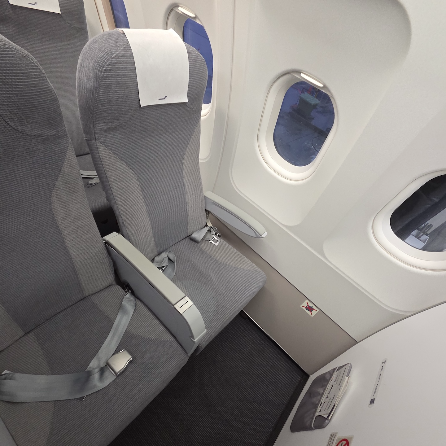 좌석은 핀에어 국내선 특유의 회색 투톤컬러와 천으로 마감된 좌석이었고요, 헤드레스트 대신에 머리가 닿는 부분에 커버를 놨지만, 매 운항마다 바꾸는 건 아니었는지 이미 사람들이 앉았던 흔적이 남아있어 위생 커버라고 말하기에는 애매했습니다.