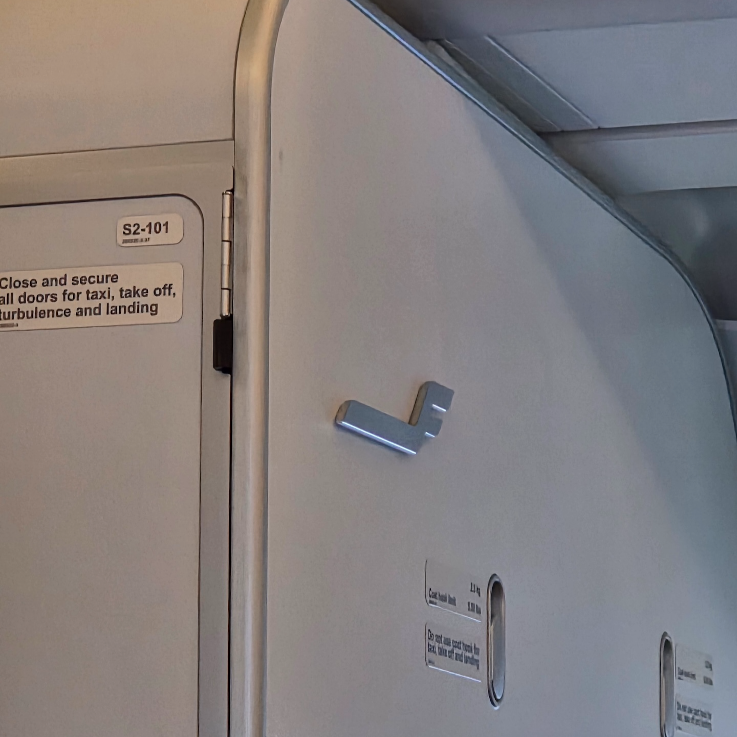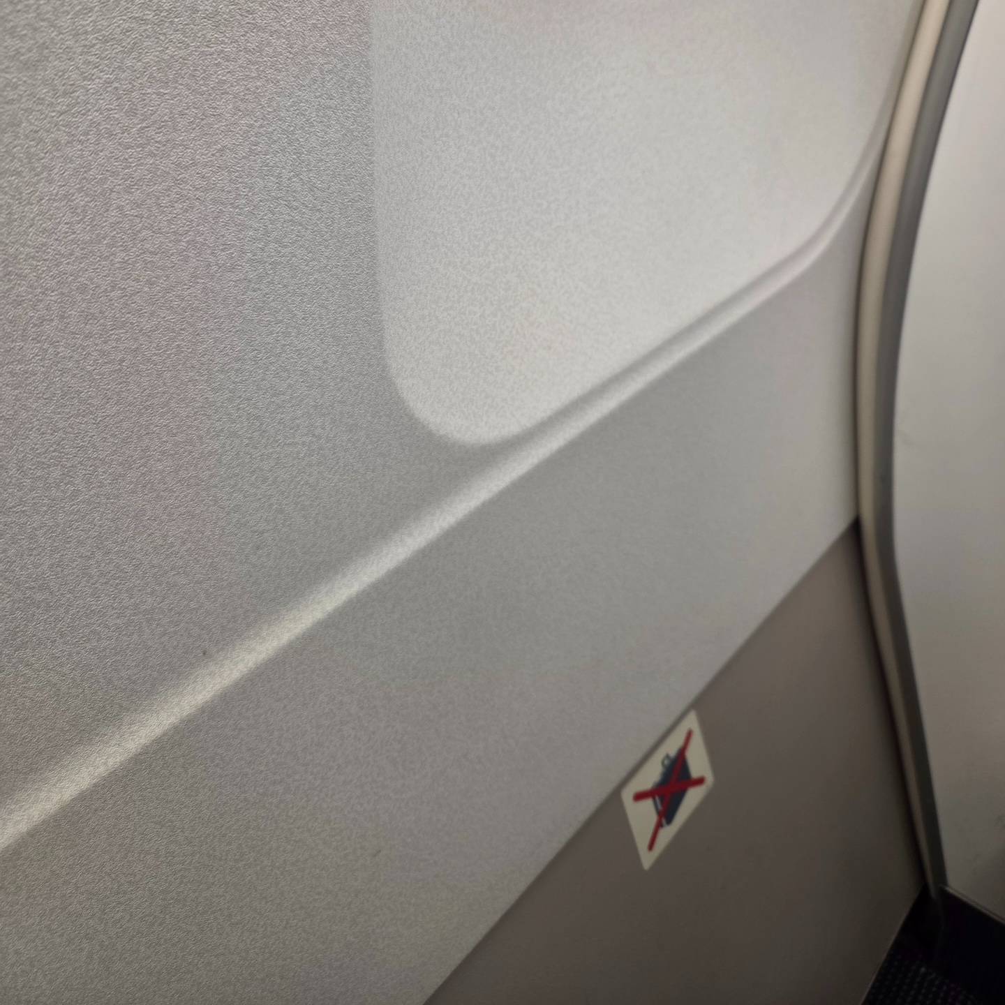 핀에어 A320-200 항공기 1열 레그룸과 이착륙시 물건 수납 금지 표시