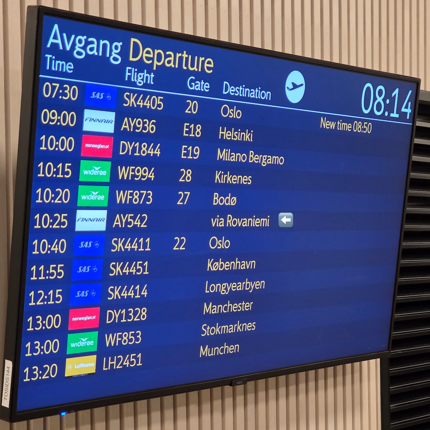 게이트가 나와있지 않는 AY542편과 트롬쇠 공항 에어사이드 분리된 공간으로 가는 길 10시 10분에 출발 예정이었던 AY542 편의 보딩은 출발 30분 전인 오전 9시 40분에 시작해서 출발 15분 전인 오전 9시 55분에 끝날 예정이었습니다만, 예정보다 10분 이른 오전 9시 30분에 시작했습니다. 핀란드는 쉥겐 조약 가입 국가이기 때문에 별도 출국심사는 필요 없었지만, 엄연히 노르웨이와는 다른 나라로 가는 국제선이기 때문인지, 별도의 분리된 공간에 존재하는 18번 게이트를 이용했습니다. 이때 공항 내 시스템에 문제가 있었는지 보딩패스를 비롯해 공항 내 디스플레이에 출발 게이트가 아예 표시되지 않는 문제가 있었습니다. 저는 제가 타고 갈 핀에어 항공기가 18번 게이트에 주기를 했기에 미리 별도의 분리된 공간으로 가 있었으나, 다른 승객들은 출발 게이트를 알 수 없어서였는지 18번 게이트 앞은 아예 텅 비었습니다. 또한 이 별도의 분리된 공간은 한번 들어오면 다시 나갈 수 없기에 그랬던 이유도 있었을 것 같습니다.