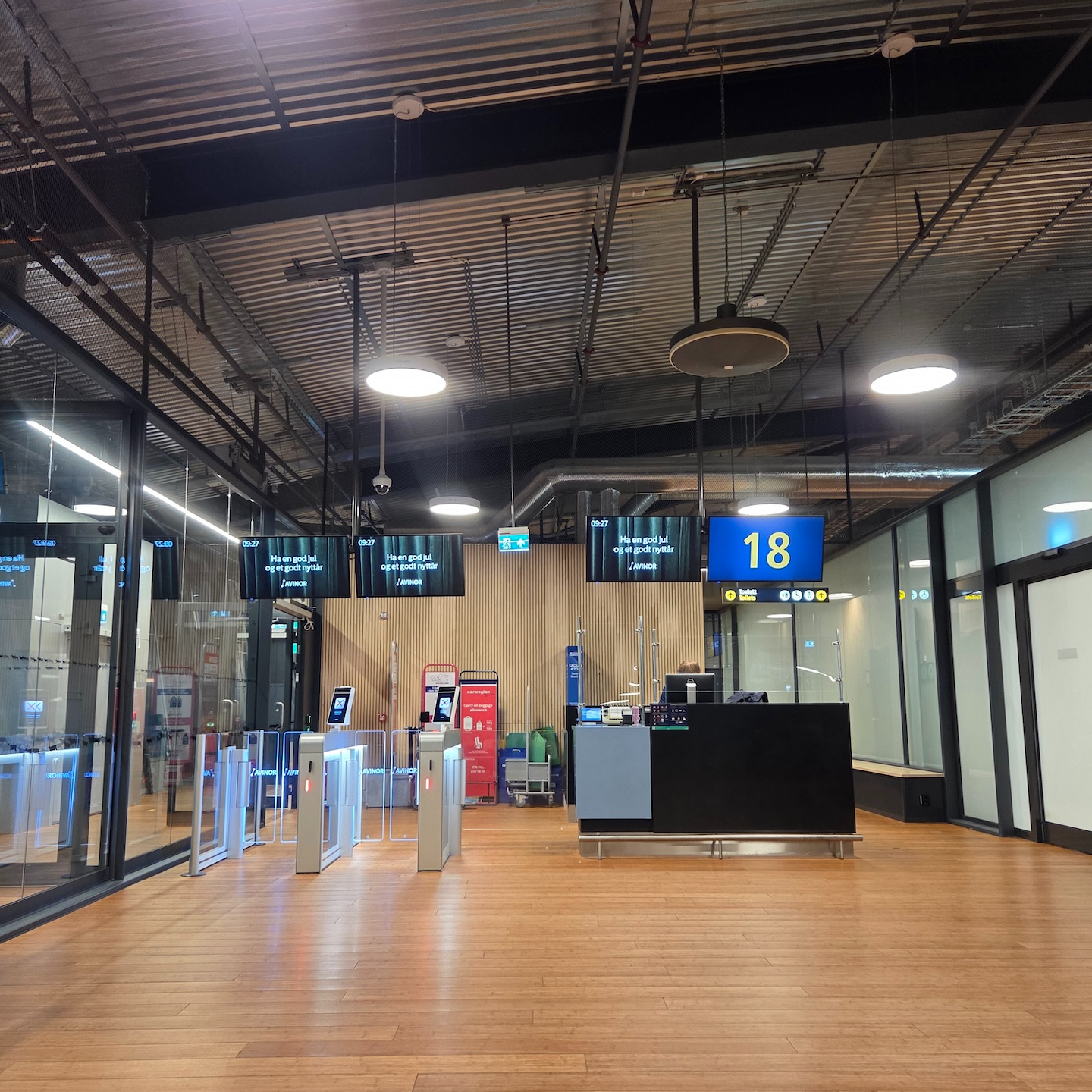 10시 10분에 출발 예정이었던 AY542 편의 보딩은 출발 30분 전인 오전 9시 40분에 시작해서 출발 15분 전인 오전 9시 55분에 끝날 예정이었습니다만, 예정보다 10분 이른 오전 9시 30분에 시작했습니다. 핀란드는 쉥겐 조약 가입 국가이기 때문에 별도 출국심사는 필요 없었지만, 엄연히 노르웨이와는 다른 나라로 가는 국제선이기 때문인지, 별도의 분리된 공간에 존재하는 18번 게이트를 이용했습니다. 이때 공항 내 시스템에 문제가 있었는지 보딩패스를 비롯해 공항 내 디스플레이에 출발 게이트가 아예 표시되지 않는 문제가 있었습니다. 저는 제가 타고 갈 핀에어 항공기가 18번 게이트에 주기를 했기에 미리 별도의 분리된 공간으로 가 있었으나, 다른 승객들은 출발 게이트를 알 수 없어서였는지 18번 게이트 앞은 아예 텅 비었습니다. 또한 이 별도의 분리된 공간은 한번 들어오면 다시 나갈 수 없기에 그랬던 이유도 있었을 것 같습니다.