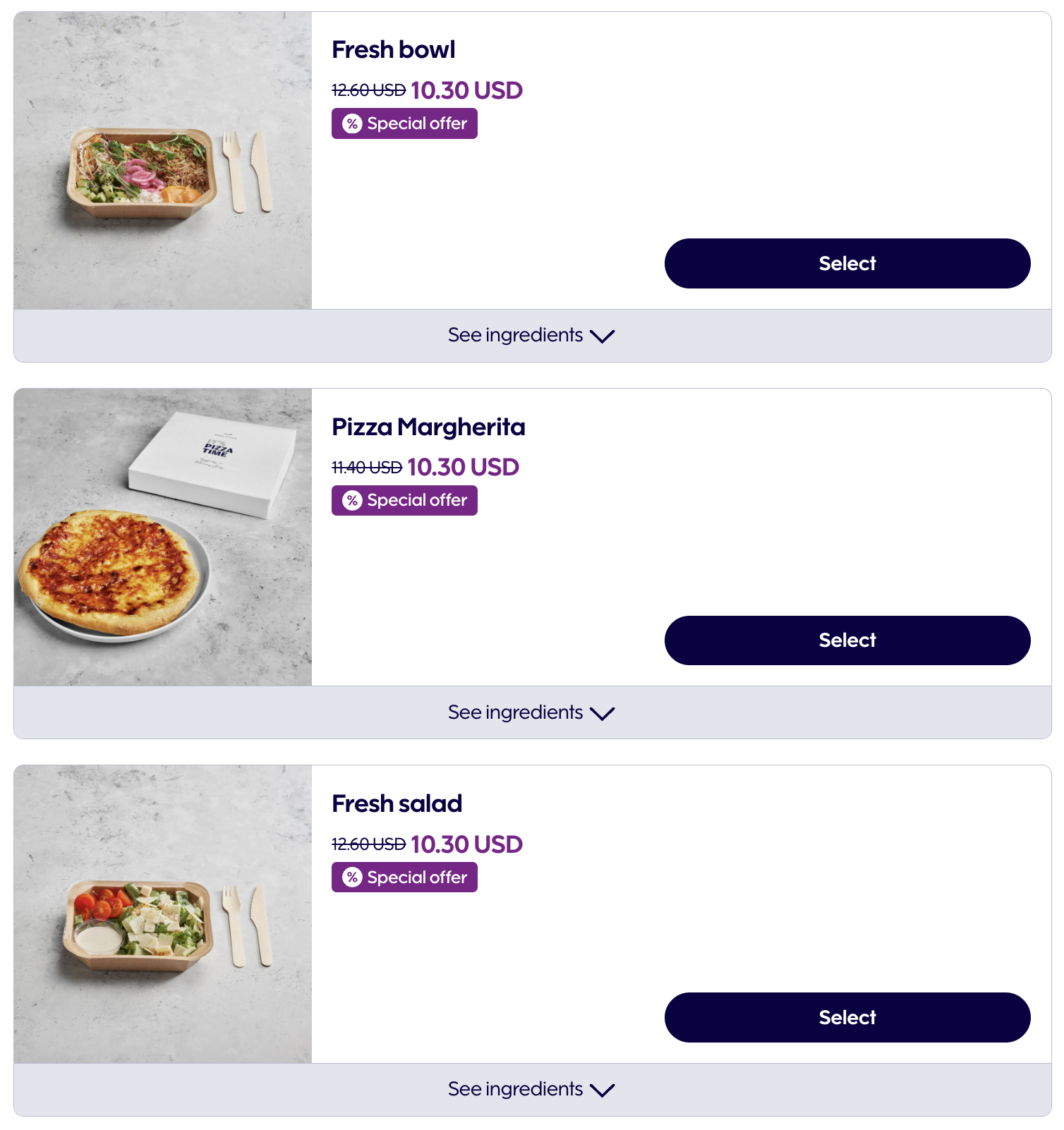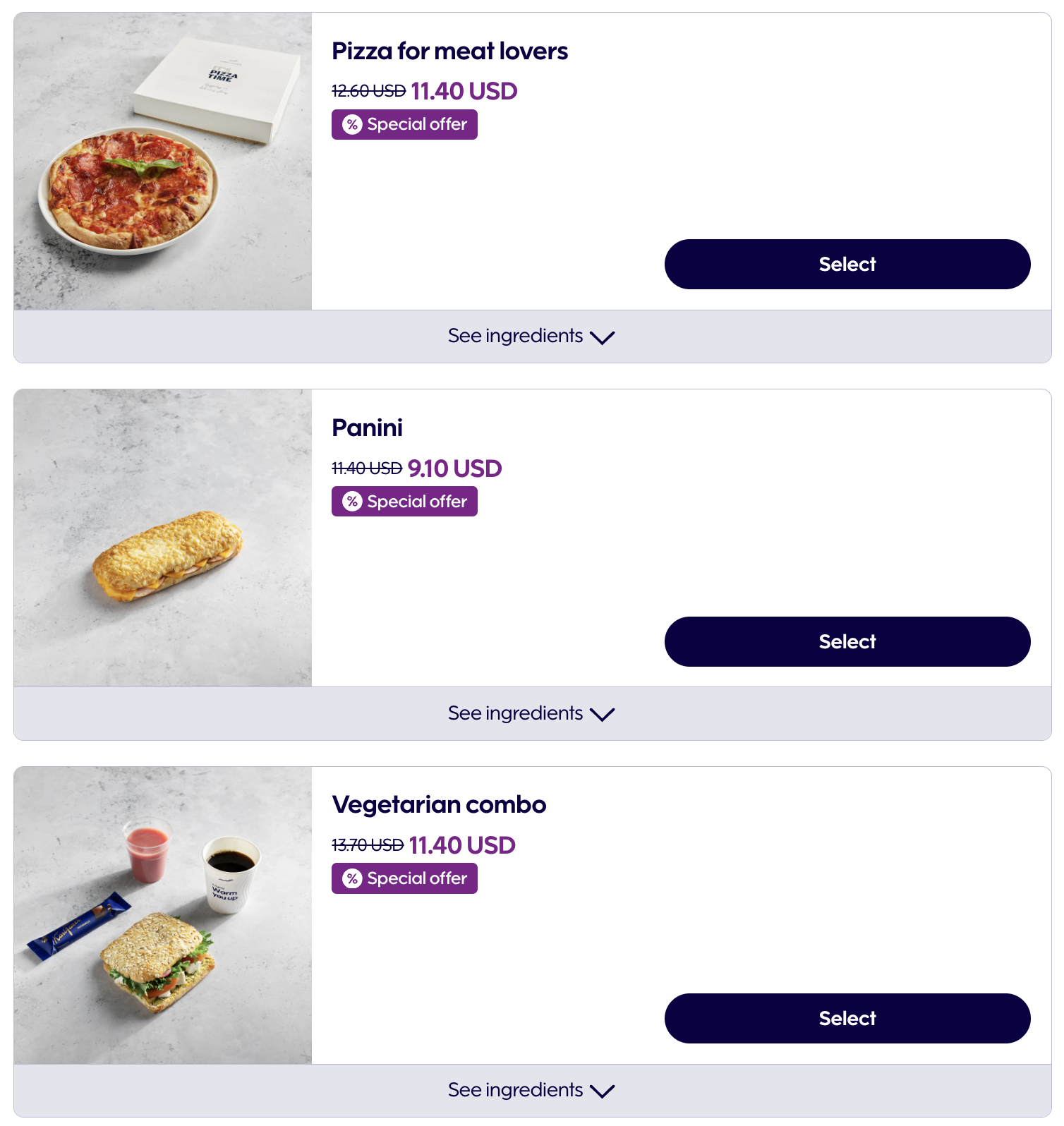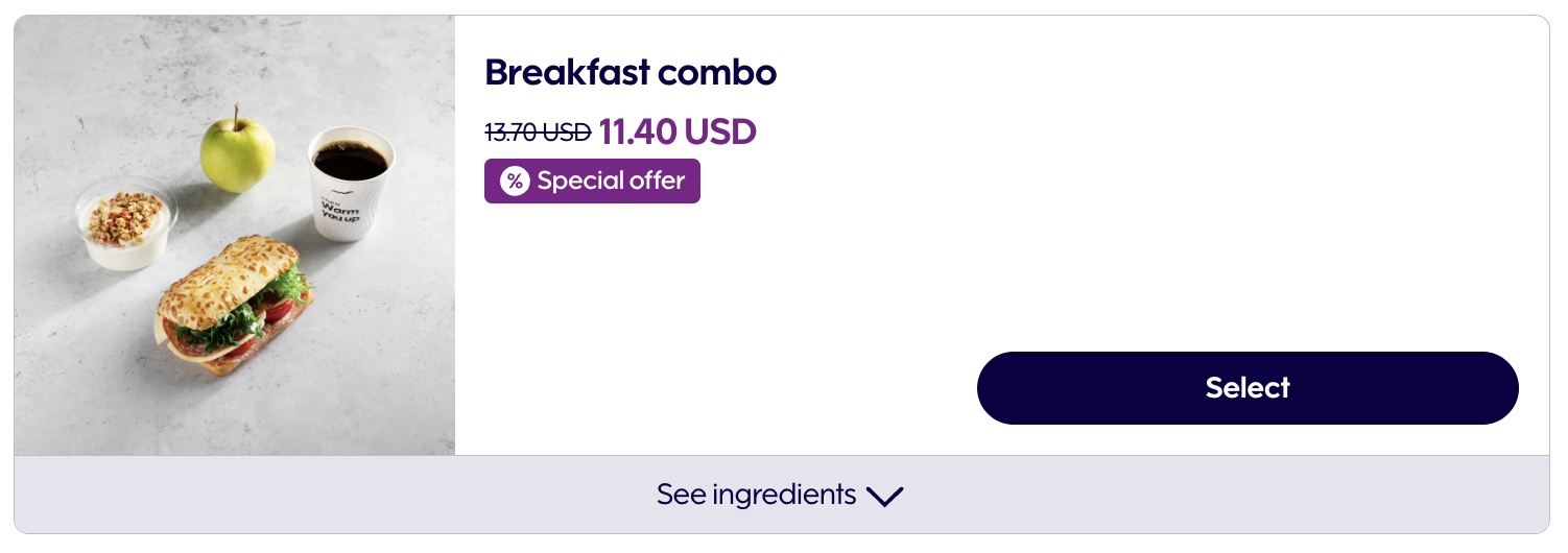 이번 비행에서는 사전 기내식을 주문했습니다. 어떤 이유에서인지는 몰라도 출발 3일 전 사전 기내식 신청 페이지로 가보니 대략 15% 정도 할인된 가격으로 사전 기내식을 판매하고 있었습니다. 저는 로스트비프 샌드위치에 초콜릿과 스무디, 커피와 티가 포함된 프리미엄 콤보와, 페퍼로니가 올라간 피자인 미트 러버 피자를 주문했습니다. 참고로 한 명이 두 개 이상의 기내식을 주문할 수는 없었기에 승객 1명당 1개의 메뉴를 골라야 했습니다.