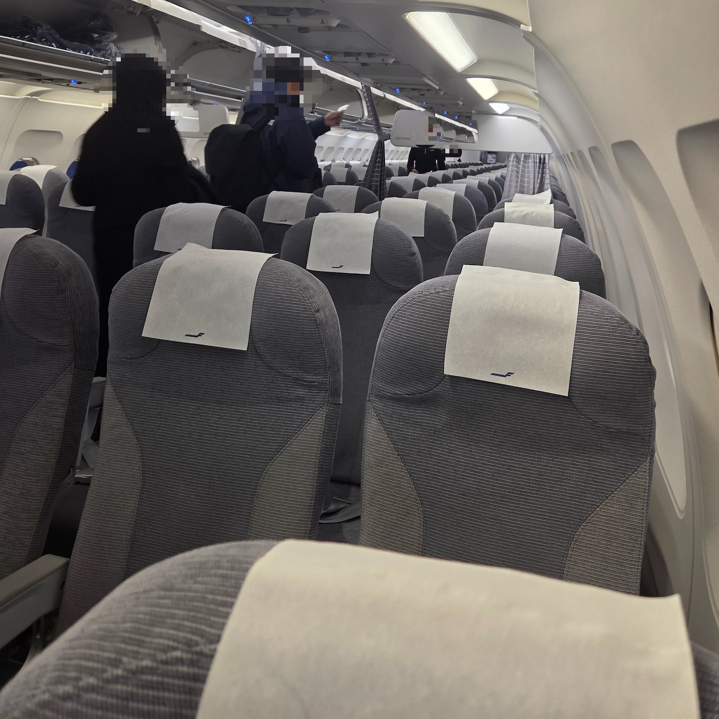 핀에어의 A320-200 항공기는 3-3 배열로 총 29열로 배치된 총 174석의 좌석을 가지고 있습니다. A320에 좌석을 최대로 넣었을 때 3-3 배열로 총 30열, 180석의 좌석이 배치되는데 핀에어에서는 A320을 이보다는 열 하나를 줄이고 좌석 간격을 조금 늘려서 운항하고 있습니다. 수치적으로는 좌석간격은 31인치이고 비상구 석인 11열과 12열은 35인치의 좌석간격을 가지고 있습니다. 핀에어는 29열 중 첫 10열을 비즈니스 클래스로 운영하고 있는데요, 핀란드는 국내선 구간에서는 비즈니스 클래스를 운행하지 않기 때문에 국내선 구간이 포함된 AY542편에서는 전석 이코노미 클래스로 운항했습니다. 물론, 핀에어 A320의 비즈니스클래스는 이코노미와 좌석은 아예 같지만, 중간 자리를 비우고 기내식을 주는 유럽 특유의 비즈니스 클래스인 유로 비즈 형태로 운영하기 때문에 원래 비즈니스 좌석으로 운영되던 좌석에 앉았다고 좌석이 더 좋거나 한 건 아니었습니다.