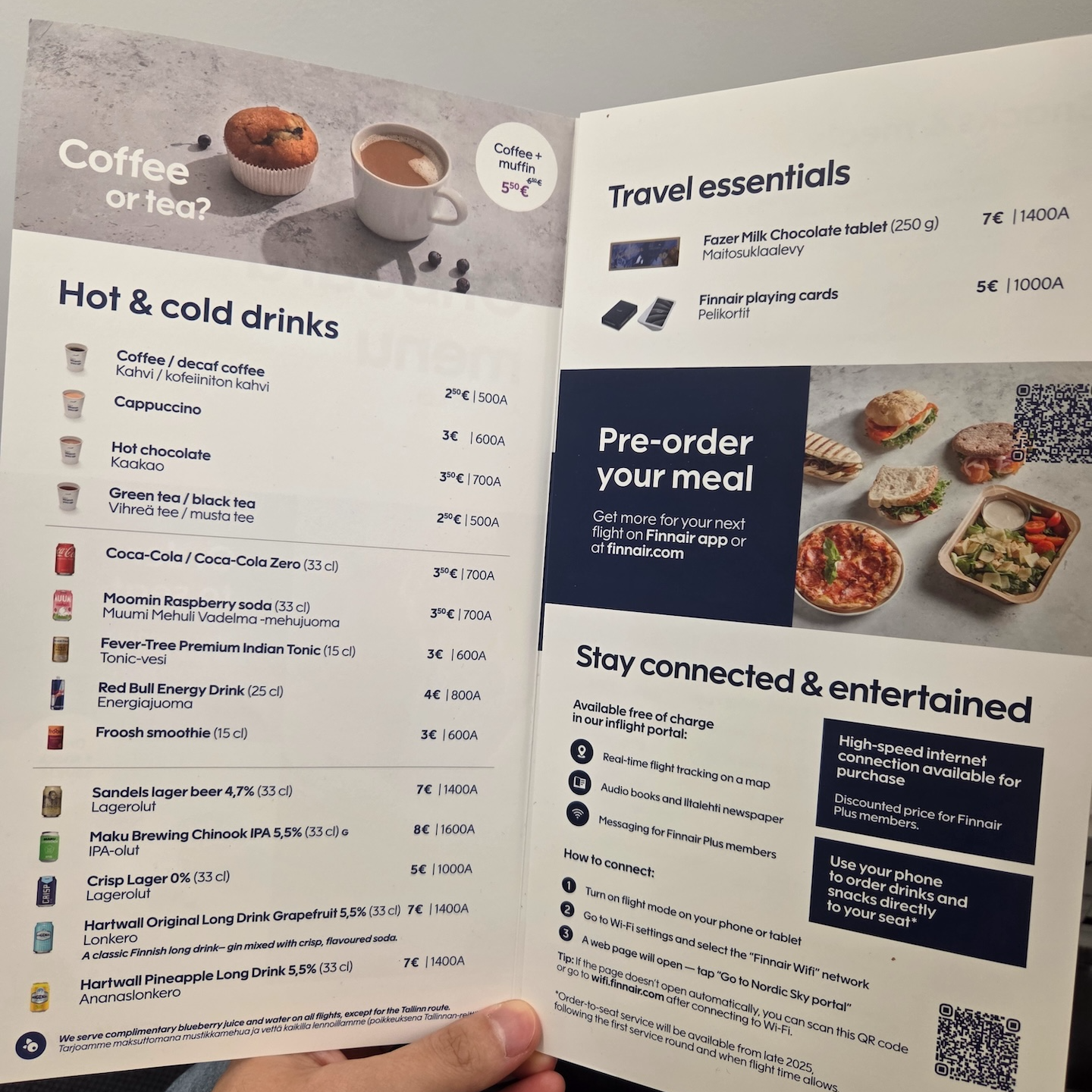 핀에어 중단거리 노선 기내 메뉴 핀에어 국내선과 유럽내 노선 이코노미 클래스의 경우 기내 서비스는 아주 간단한 편입니다. 순항고도에 올라가면 음료 서비스가 시작되고 이후 쓰레기 수거를 한 이후에 기내 서비스가 종료됩니다. 특히 제가 탄 AY541편의 경우 직항도 2시간 정도 걸리는 노선을 1시간 구간 2개로 나눠서 운항을 하기 때문에 기내 서비스는 눈 깜짝할 사이에 시작되고 끝났습니다.