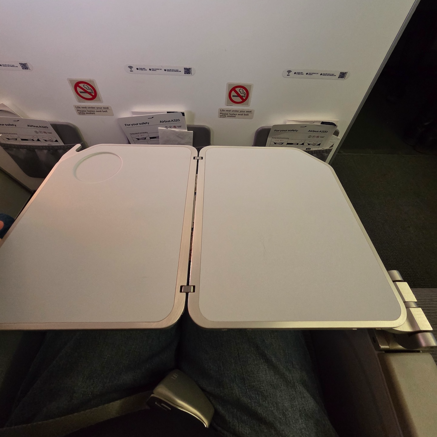 핀에어의 A320-200 벌크헤드 좌석 테이블