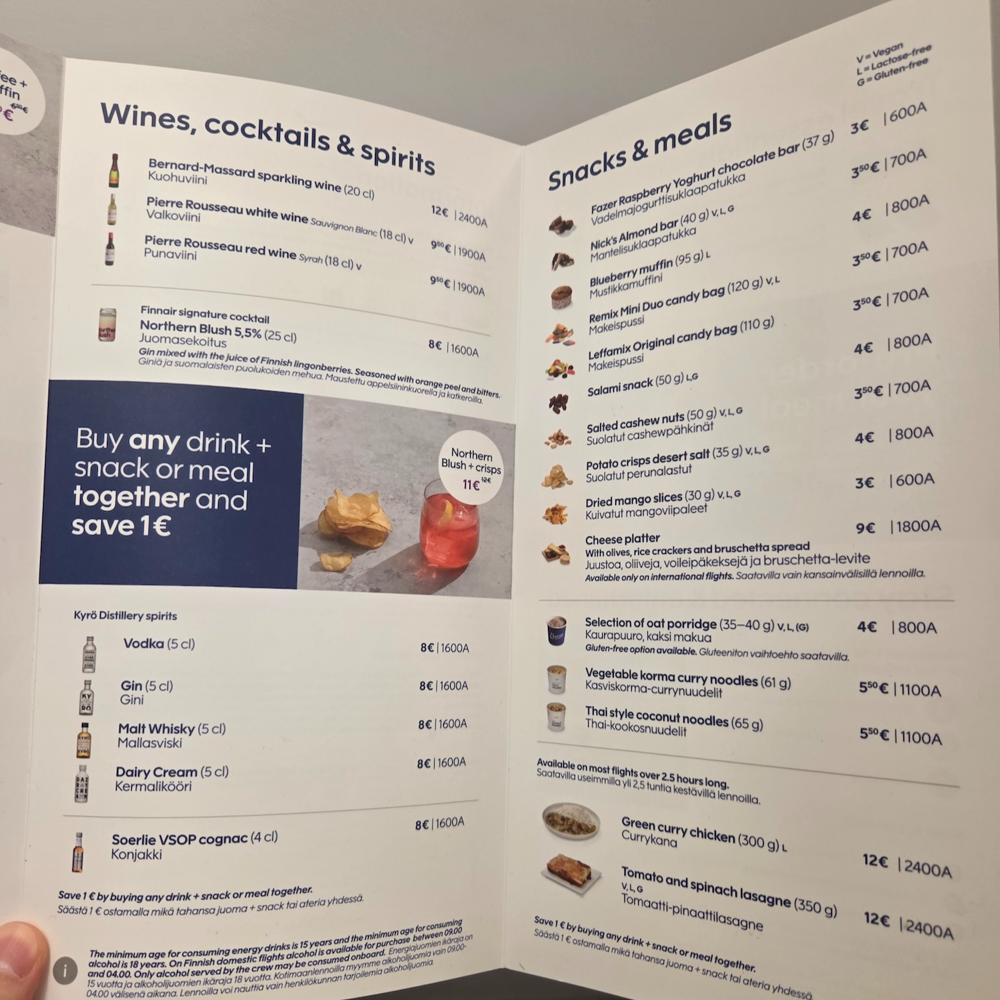 핀에어 국내선과 유럽내 노선에서 무료로 제공되는 음료는 물과 블루베리 주스입니다. 이외에 커피나 탄산음료나 주류는 유상 구입을 해야 합니다. 기내 서비스가 진행될 때 스낵류나 간단한 음식도 주문할 수 있습니다. 간단한 음식으로는 오트밀 죽, 야채 커리 누들, 태국식 코코넛 누들이 있는데 엄청나게 퀄리티가 좋은 음식은 아니지만 5유로라는 비싸지 않은 금액으로 간단히 요기를 할 수 있는 수준입니다. 만약, 다른 핫푸드를 원하신다면 미리 온라인 사전주문으로 더 많은 음식을 주문할 수 있으니 헬싱키 출발 노선의 경우 출발 7시간 전까지 미리 사전 주문을 하시는 걸 추천드립니다.