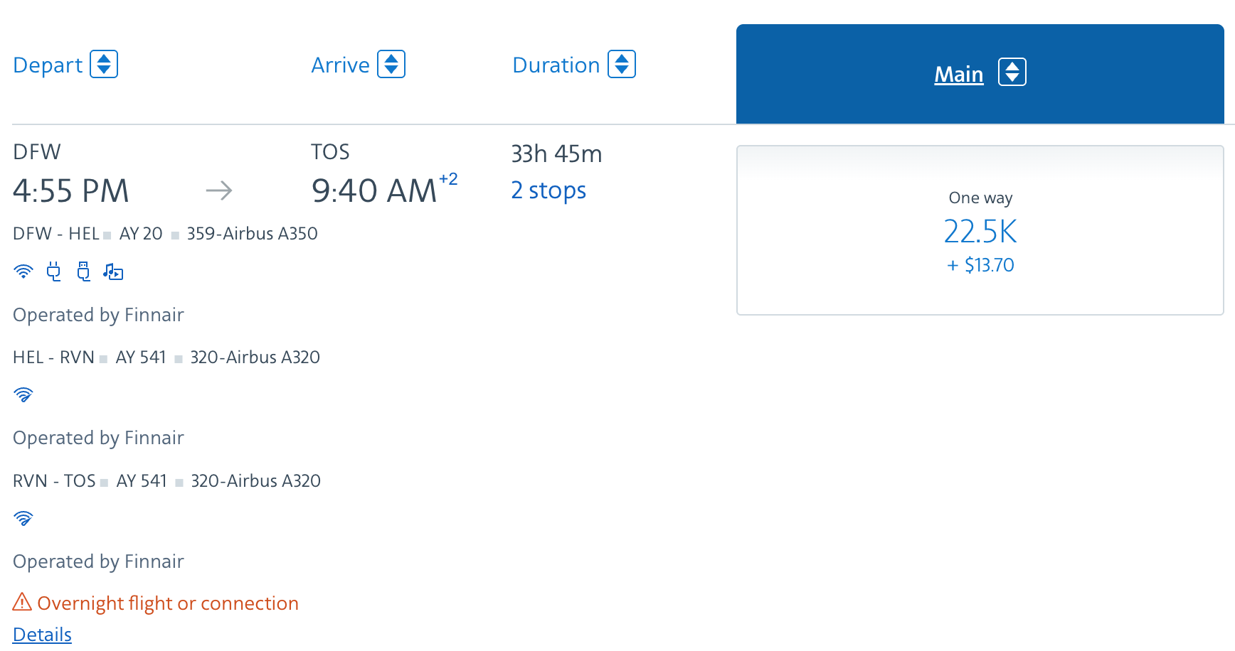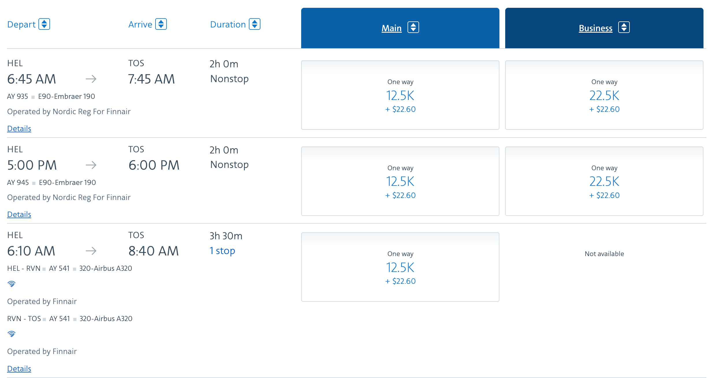만약 헬싱키에서 트롬쇠까지 운항하는 구간만 발권한다면 아메리칸 항공 마일리지로는 12,500 마일에 세금 22.6 미국달러가 듭니다. 저처럼 1스탑을 하는 항공편이 아닌, 직항 항공편에서는 유로 비즈라고 불리는 비즈니스석을 운영하며 이 비즈니스석의 가격은 약 22,500마일에 세금 22.6 미국달러가 듭니다만, 이 유로비즈는 별로 추천하지 않습니다. 만약 동일 구간을 알래스카 항공 마일리지로 구입한다면 이코노미와 비즈니스가 각각 7,500 마일에 세금 35.1 미국달러, 15,000 마일에 세금 35.1 미국 달러로 조금 더 나은 가격에 구입할 수 있으며, 만약 핀에어 아비오스로 구입하신다면 이코노미 클래스는 아비오스 12,000 마일에 세금 40 미국달러, 비즈니스 클래스는 아비오스 18,000 마일과 세금 40 미국달러에 구입하실 수 있습니다.