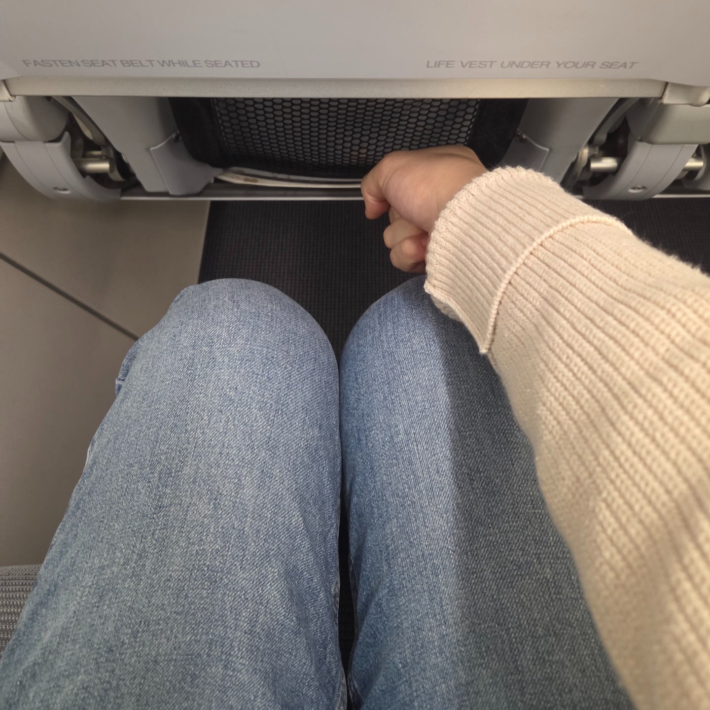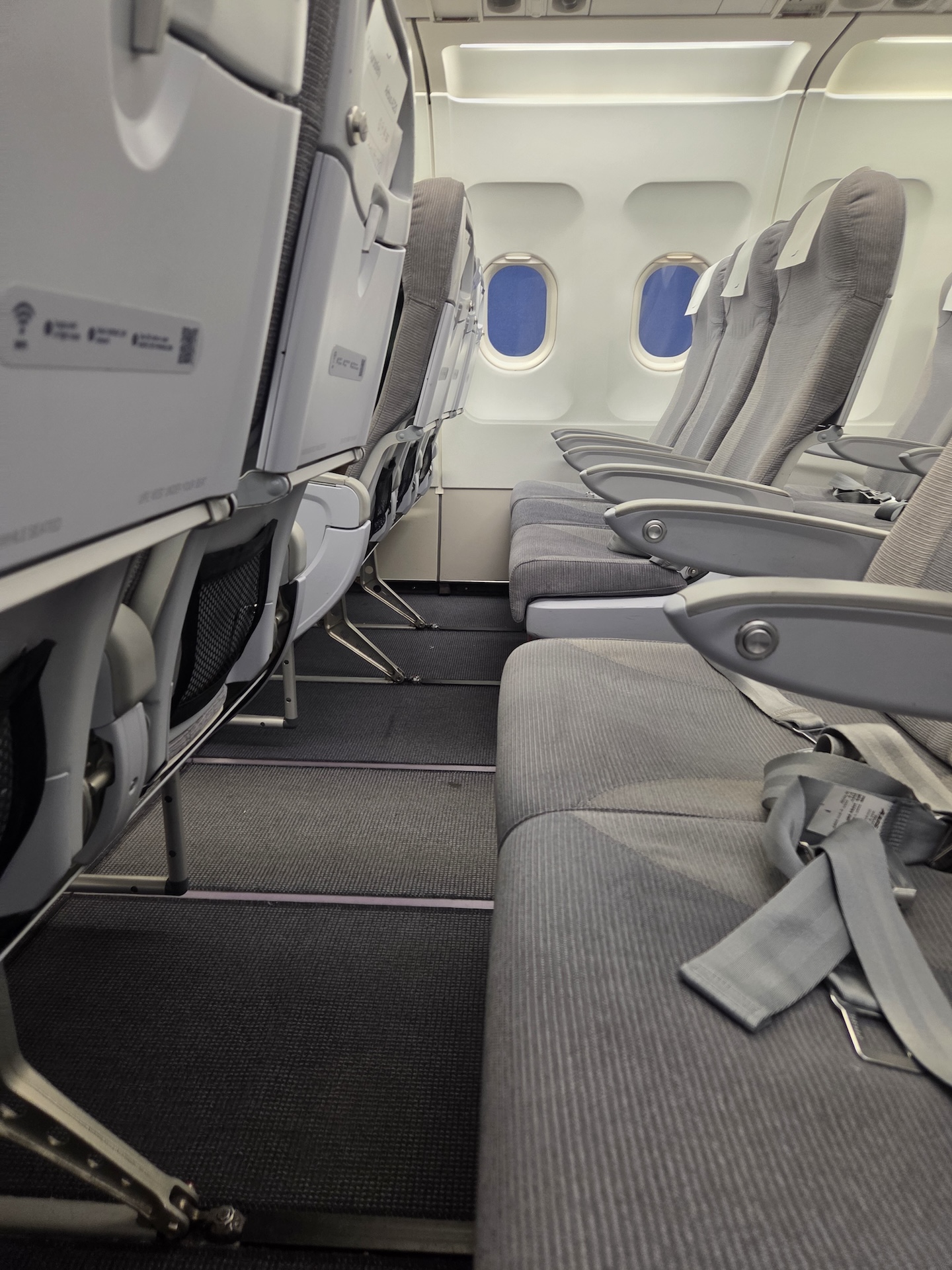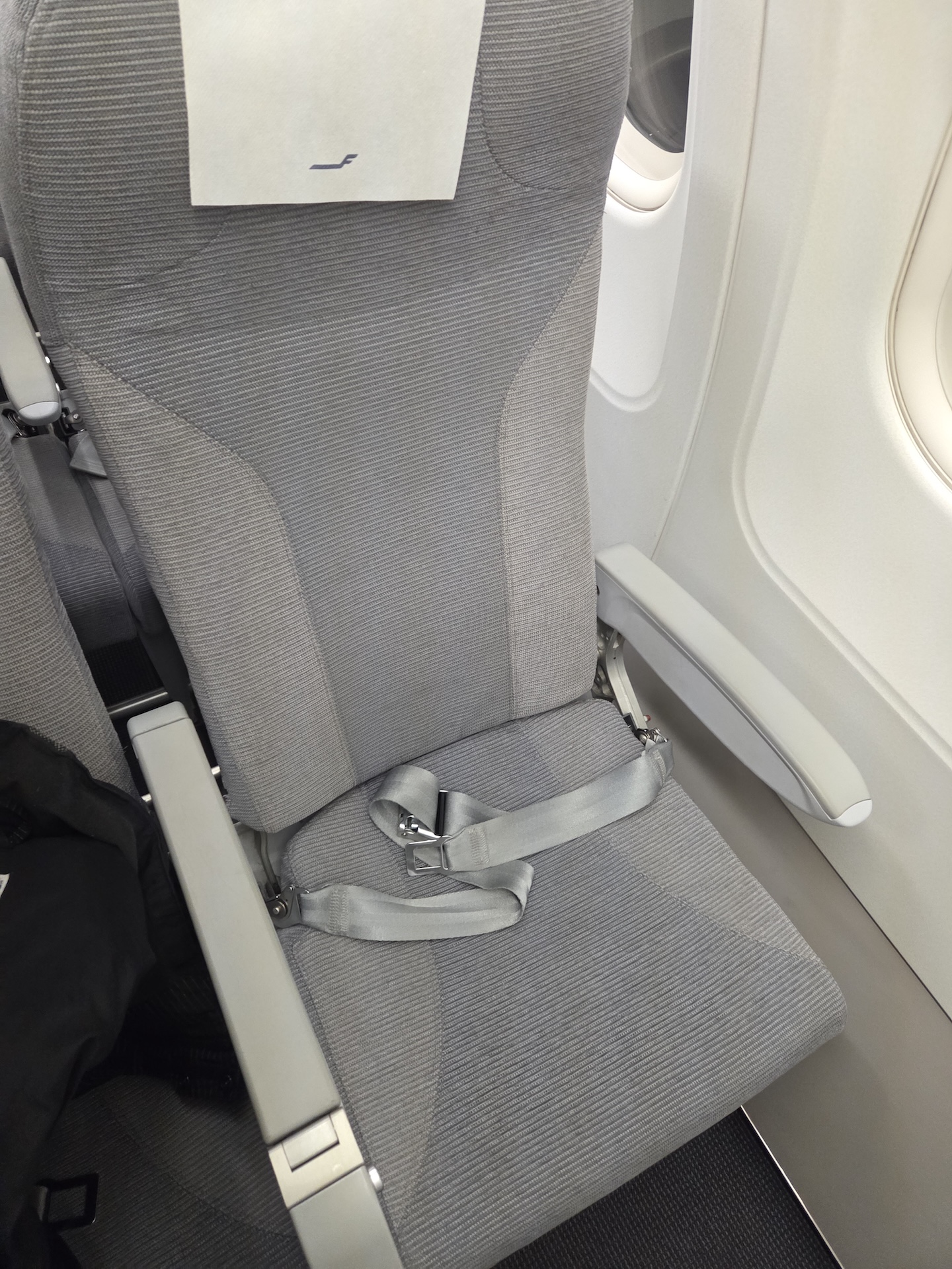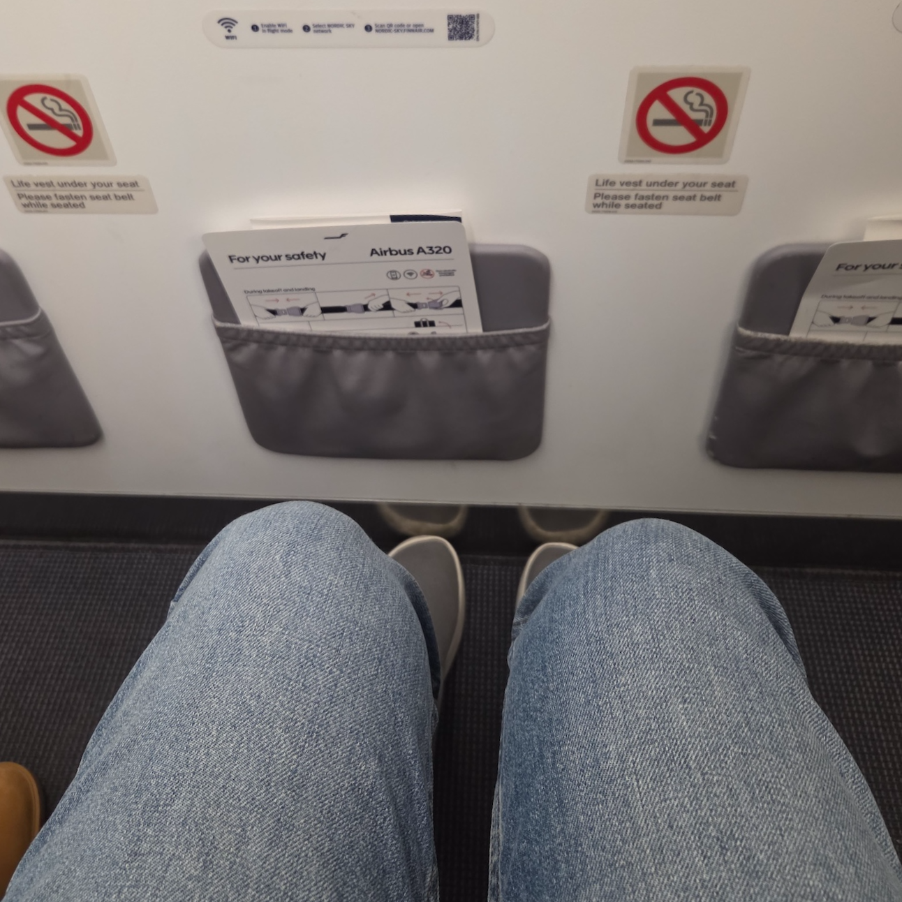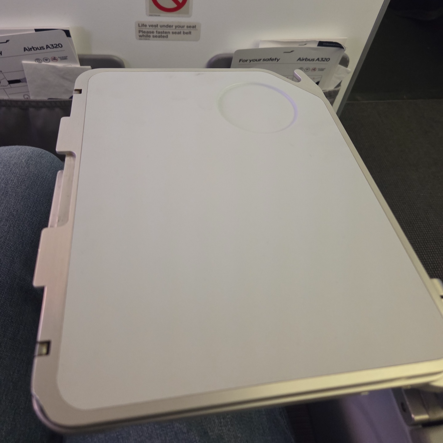 중단거리를 운행하는 기종인만큼 헤드레스트는 따로 없는 편인데, 실제로는 동일한 좌석이 설치된 비행기로 최대 6시간 걸리는 노선까지 운항을 하고 있어서 3시간이 넘는 노선에서 헤드레스트의 부재는 힘들 것 같았습니다. 좌석 재질은 천이라서 통풍이 안되는 가죽보다는 나은 편이었고요, 좌석 앞으로는 세이프티 카드와 온보드 메뉴가 들어가는 작은 가죽 주머니 외에 아무것도 없었습니다.