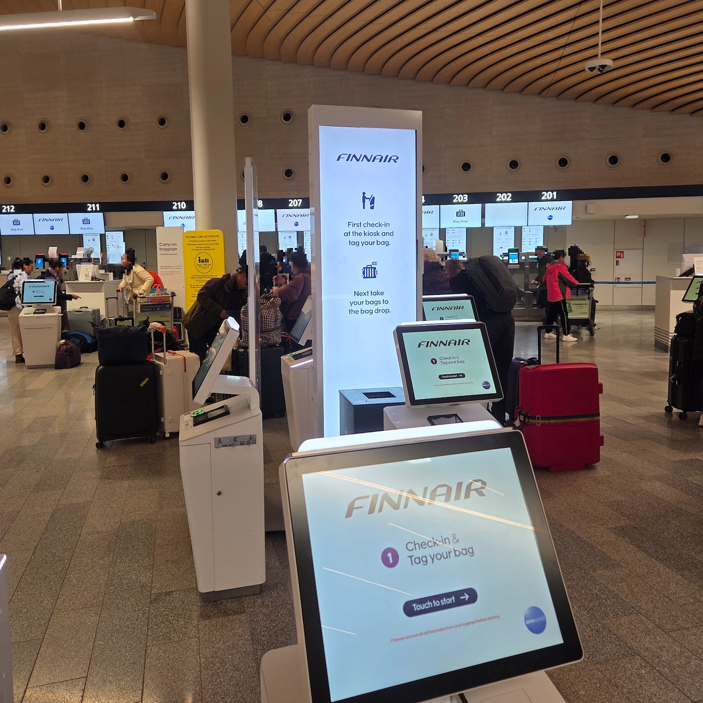 헬싱키 반타 공항의 체크인 카운터는 보안 검색대를 바라본 방향 기준으로 오른쪽에 100번대와 200번대, 왼쪽에 300번대와 400번대가 위치해 있습니다. 핀에어의 체크인은 200번대 카운터에서 이루어집니다. 헬싱키 공항에서 핀에어의 체크인은 기본적으로 셀프 체크인과 백드롭으로 이루어져 있습니다. 헬싱키 반타 공항을 허브로 쓰는 핀에어 답게 수많은 체크인 키오스크가 위치해 있고요, 직원들도 많아서 어렵지 않게 체크인을 할 수 있습니다. 체크인 후에는 201 ~ 210번의 백 드롭 카운터로 가서 짐을 부치면 되고요, 만약 공항 직원에게 체크인을 직접 받아야 하는 상황이라면 211 ~ 217번 카운터로 가시면 도움을 받을 수 있습니다.