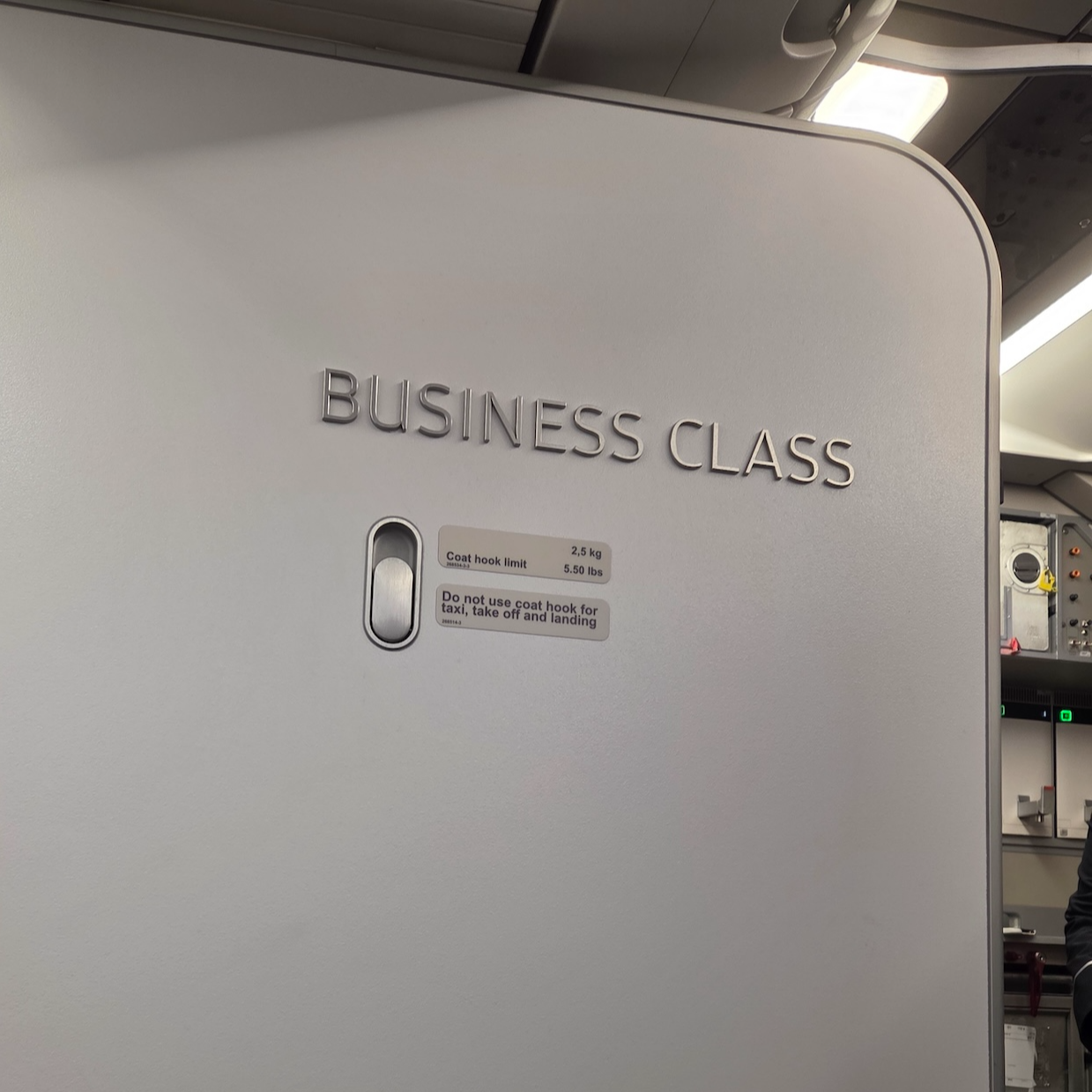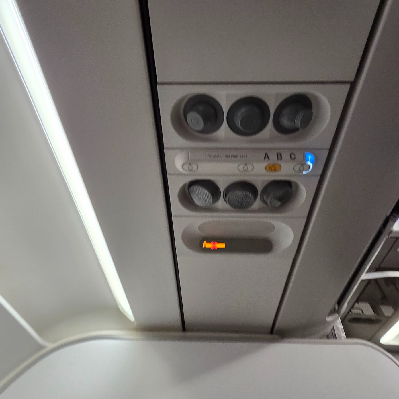 앞 벌크헤드에는 의미 없는 비즈니스 클래스 표시가 붙어있었고, 의자 위로는 개인 독서등과 더불어 개인 공조장치가 설치되어 있었습니다. 물론, 기내 온도를 낮게 유지하는 핀에어이기에 따로 쓸 일은 없었지만요. 오버헤드빈의 경우 최근 기내용 캐리어를 세워서 수납할 수 있도록 사이즈를 키워 기내 수하물 수납 용량을 늘린 미국 항공사와는 달리 출고될 당시 그대로인 오버헤드 빈이기 때문에 기내용 캐리어는 눕혀서 보관해야 합니다. 이 때문에 항공기가 만석인 경우 미리 탑승을 해서 오버헤드 빈 공간을 확보하는 게 중요할 것 같았습니다.